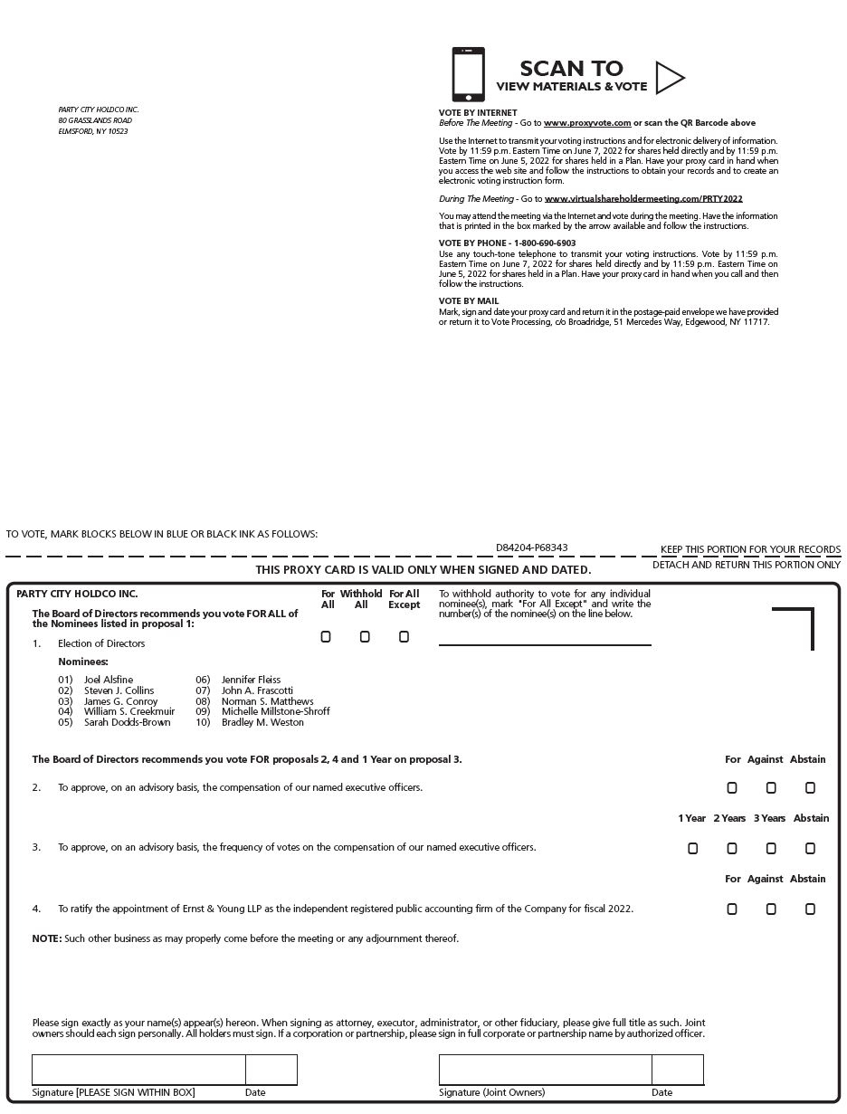 Important Notice Regarding the Availability of Proxy Materials for the Annual Meeting to Be Held on June 8, 2022. This proxy statement and our fiscal year 2022 Annual Report to stockholders are available at www.proxyvote.com as well as on the Investor Relations section of our website at investor.partycity.com.