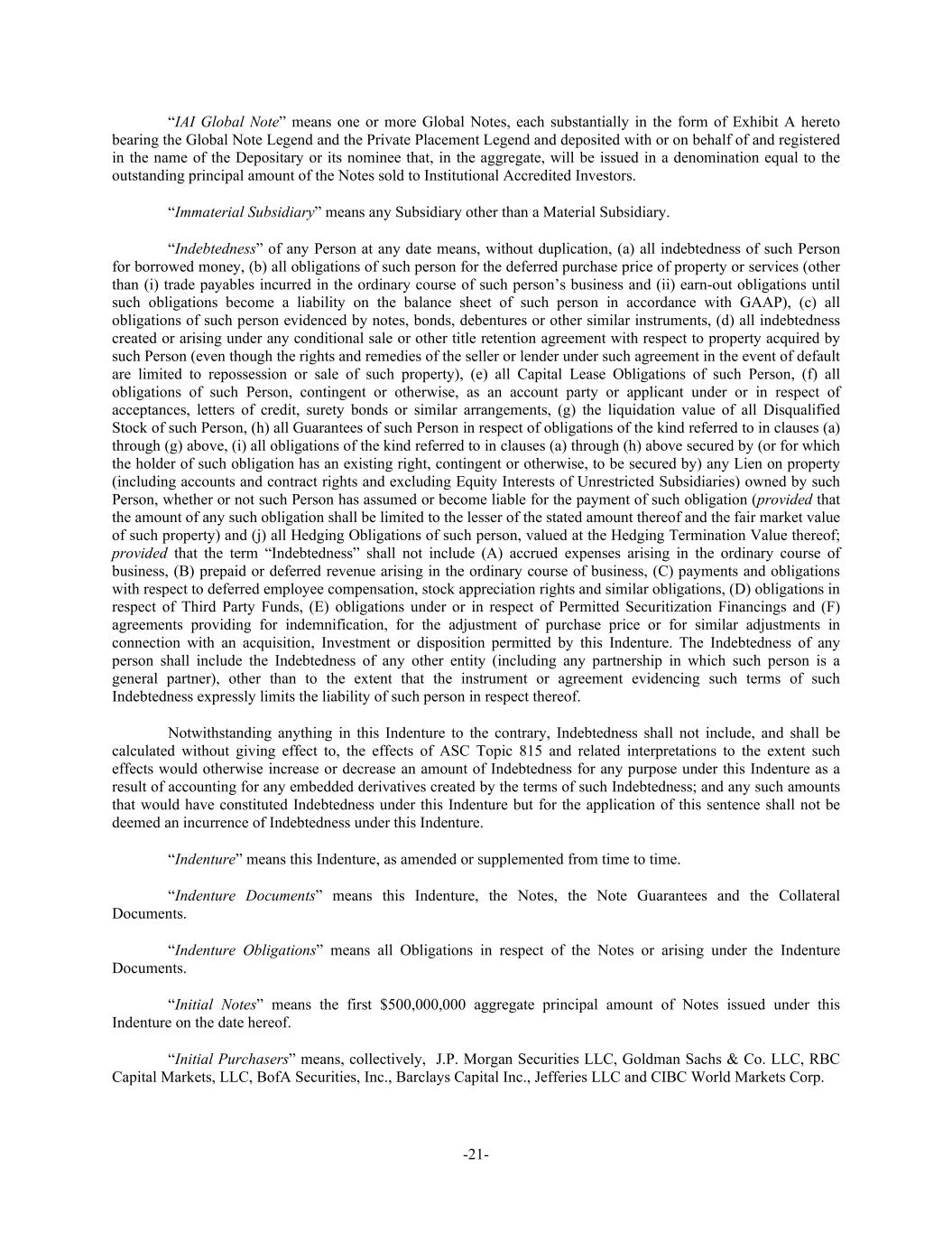-21- “IAI Global Note” means one or more Global Notes, each substantially in the form of Exhibit A hereto bearing the Global Note Legend and the Private Placement Legend and deposited with or on behalf of and registered in the name of the Depositary or its nominee that, in the aggregate, will be issued in a denomination equal to the outstanding principal amount of the Notes sold to Institutional Accredited Investors. “Immaterial Subsidiary” means any Subsidiary other than a Material Subsidiary. “Indebtedness” of any Person at any date means, without duplication, (a) all indebtedness of such Person for borrowed money, (b) all obligations of such person for the deferred purchase price of property or services (other than (i) trade payables incurred in the ordinary course of such person’s business and (ii) earn-out obligations until such obligations become a liability on the balance sheet of such person in accordance with GAAP), (c) all obligations of such person evidenced by notes, bonds, debentures or other similar instruments, (d) all indebtedness created or arising under any conditional sale or other title retention agreement with respect to property acquired by such Person (even though the rights and remedies of the seller or lender under such agreement in the event of default are limited to repossession or sale of such property), (e) all Capital Lease Obligations of such Person, (f) all obligations of such Person, contingent or otherwise, as an account party or applicant under or in respect of acceptances, letters of credit, surety bonds or similar arrangements, (g) the liquidation value of all Disqualified Stock of such Person, (h) all Guarantees of such Person in respect of obligations of the kind referred to in clauses (a) through (g) above, (i) all obligations of the kind referred to in clauses (a) through (h) above secured by (or for which the holder of such obligation has an existing right, contingent or otherwise, to be secured by) any Lien on property (including accounts and contract rights and excluding Equity Interests of Unrestricted Subsidiaries) owned by such Person, whether or not such Person has assumed or become liable for the payment of such obligation (provided that the amount of any such obligation shall be limited to the lesser of the stated amount thereof and the fair market value of such property) and (j) all Hedging Obligations of such person, valued at the Hedging Termination Value thereof; provided that the term “Indebtedness” shall not include (A) accrued expenses arising in the ordinary course of business, (B) prepaid or deferred revenue arising in the ordinary course of business, (C) payments and obligations with respect to deferred employee compensation, stock appreciation rights and similar obligations, (D) obligations in respect of Third Party Funds, (E) obligations under or in respect of Permitted Securitization Financings and (F) agreements providing for indemnification, for the adjustment of purchase price or for similar adjustments in connection with an acquisition, Investment or disposition permitted by this Indenture. The Indebtedness of any person shall include the Indebtedness of any other entity (including any partnership in which such person is a general partner), other than to the extent that the instrument or agreement evidencing such terms of such Indebtedness expressly limits the liability of such person in respect thereof. Notwithstanding anything in this Indenture to the contrary, Indebtedness shall not include, and shall be calculated without giving effect to, the effects of ASC Topic 815 and related interpretations to the extent such effects would otherwise increase or decrease an amount of Indebtedness for any purpose under this Indenture as a result of accounting for any embedded derivatives created by the terms of such Indebtedness; and any such amounts that would have constituted Indebtedness under this Indenture but for the application of this sentence shall not be deemed an incurrence of Indebtedness under this Indenture. “Indenture” means this Indenture, as amended or supplemented from time to time. “Indenture Documents” means this Indenture, the Notes, the Note Guarantees and the Collateral Documents. “Indenture Obligations” means all Obligations in respect of the Notes or arising under the Indenture Documents. “Initial Notes” means the first $500,000,000 aggregate principal amount of Notes issued under this Indenture on the date hereof. “Initial Purchasers” means, collectively, J.P. Morgan Securities LLC, Goldman Sachs & Co. LLC, RBC Capital Markets, LLC, BofA Securities, Inc., Barclays Capital Inc., Jefferies LLC and CIBC World Markets Corp.