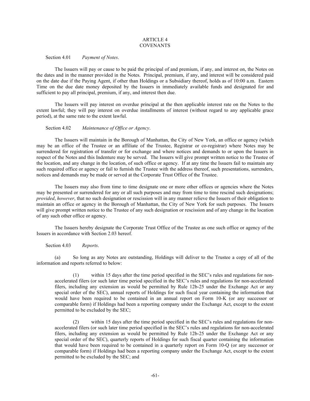 -61- ARTICLE 4 COVENANTS Section 4.01 Payment of Notes. The Issuers will pay or cause to be paid the principal of and premium, if any, and interest on, the Notes on the dates and in the manner provided in the Notes. Principal, premium, if any, and interest will be considered paid on the date due if the Paying Agent, if other than Holdings or a Subsidiary thereof, holds as of 10:00 a.m. Eastern Time on the due date money deposited by the Issuers in immediately available funds and designated for and sufficient to pay all principal, premium, if any, and interest then due. The Issuers will pay interest on overdue principal at the then applicable interest rate on the Notes to the extent lawful; they will pay interest on overdue installments of interest (without regard to any applicable grace period), at the same rate to the extent lawful. Section 4.02 Maintenance of Office or Agency. The Issuers will maintain in the Borough of Manhattan, the City of New York, an office or agency (which may be an office of the Trustee or an affiliate of the Trustee, Registrar or co-registrar) where Notes may be surrendered for registration of transfer or for exchange and where notices and demands to or upon the Issuers in respect of the Notes and this Indenture may be served. The Issuers will give prompt written notice to the Trustee of the location, and any change in the location, of such office or agency. If at any time the Issuers fail to maintain any such required office or agency or fail to furnish the Trustee with the address thereof, such presentations, surrenders, notices and demands may be made or served at the Corporate Trust Office of the Trustee. The Issuers may also from time to time designate one or more other offices or agencies where the Notes may be presented or surrendered for any or all such purposes and may from time to time rescind such designations; provided, however, that no such designation or rescission will in any manner relieve the Issuers of their obligation to maintain an office or agency in the Borough of Manhattan, the City of New York for such purposes. The Issuers will give prompt written notice to the Trustee of any such designation or rescission and of any change in the location of any such other office or agency. The Issuers hereby designate the Corporate Trust Office of the Trustee as one such office or agency of the Issuers in accordance with Section 2.03 hereof. Section 4.03 Reports. (a) So long as any Notes are outstanding, Holdings will deliver to the Trustee a copy of all of the information and reports referred to below: (1) within 15 days after the time period specified in the SEC’s rules and regulations for non- accelerated filers (or such later time period specified in the SEC’s rules and regulations for non-accelerated filers, including any extension as would be permitted by Rule 12b-25 under the Exchange Act or any special order of the SEC), annual reports of Holdings for such fiscal year containing the information that would have been required to be contained in an annual report on Form 10-K (or any successor or comparable form) if Holdings had been a reporting company under the Exchange Act, except to the extent permitted to be excluded by the SEC; (2) within 15 days after the time period specified in the SEC’s rules and regulations for non- accelerated filers (or such later time period specified in the SEC’s rules and regulations for non-accelerated filers, including any extension as would be permitted by Rule 12b-25 under the Exchange Act or any special order of the SEC), quarterly reports of Holdings for such fiscal quarter containing the information that would have been required to be contained in a quarterly report on Form 10-Q (or any successor or comparable form) if Holdings had been a reporting company under the Exchange Act, except to the extent permitted to be excluded by the SEC; and