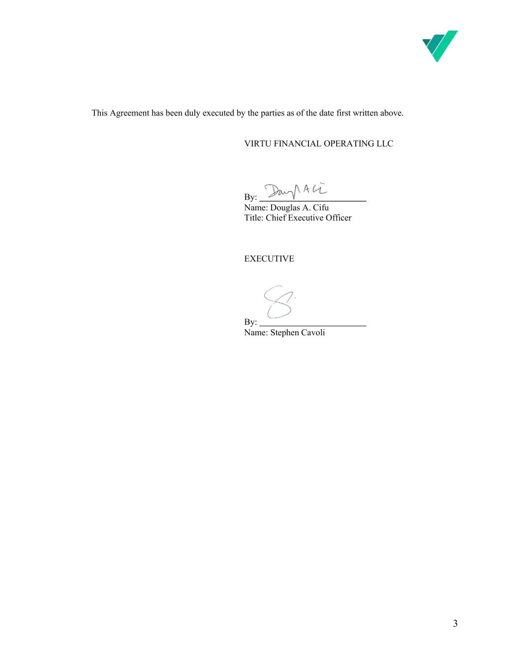 t: 1 212 418 0100 f: 1 212 418 0123 www.virtu.com Virtu Financial Operating LLC 1633 Broadway New York, NY 10019 Amendment No. 1 to Employment Agreement This Amendment No. 1, effective February 26 entered into by and between Virtu Financial Operating LLC, a Delaware limited liability company (together with all parents, affiliates and subsidiaries as the "Company"), and Stephen Cavoli , and amends the Amended and Restated December 1, 2022, between the Company and the Executive. WHEREAS, the Company and Executive are party to the Agreement and desire to amend the Agreement by extending the Term and the Initial Expiration Date as herein provided; and NOW, THEREFORE, in consideration of the mutual agreements, provisions and covenants contained herein, and intending to be legally bound hereby, the parties hereto agree as set forth below: 1. Section 1(a) of the Agreement is hereby amended and restated in its entirety to read as follows, with changes reflected in bold and underlined: 1. Term. a. under this Agreement shall continue from the Effective Date until February 28, 2028 employment under this Agreement shall be extended for one (1) additional year unless either party provides written notice to the other party at least ninety (90) days prior to the Initial Expiration t under this Agreement shall terminate on the Initial Expiration Date or expiration of the extended term, as applicable); provided, however, that provisions of Section 5. The period of time from the Effective Date through the termination of this al Expiration Date or Change in Control, the Expiration Date is less than one (1) year from the date of such Change in Control, the Term shall automatically be renewed so that the Expiration Date is one (1) year from the effective date of such Change in Control. 2. Except as specifically provided by this Amendment, the Agreement shall remain in full force and effect in all other respects, subject to any other amendments that may be adopted from time to time. 3. The Company and the Executive represent and agree that each has reviewed all aspects of this Amendment, has carefully read and fully understands all provisions of this Amendment, and is voluntarily entering into this Amendment. Each party represents and agrees that such party has had the opportunity to before executing this Amendment. 4. This Amendment may be executed by either of the parties hereto in counterparts, each of which shall be deemed to be an original Amendment, but all such counterparts shall together constitute one and the same instrument. Signatures to this Amendment transmitted by facsimile transmission, by electronic mail in original graphic and pictorial appearance of a document, will have the same effect as physical delivery of the paper document bearing the original signature.