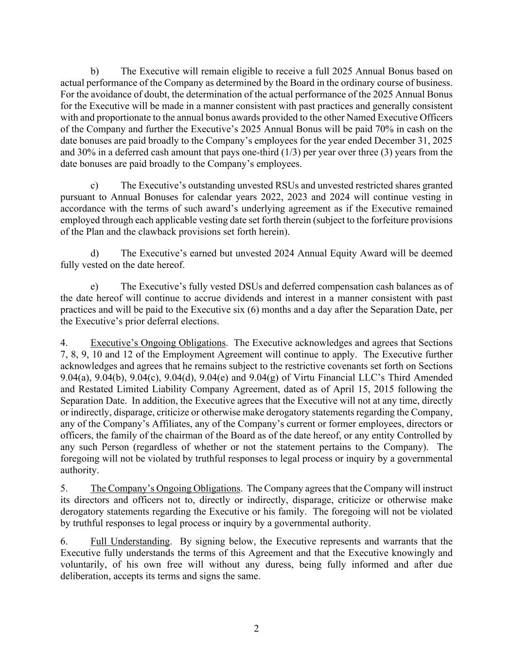 2 b) The Executive will remain eligible to receive a full 2025 Annual Bonus based on actual performance of the Company as determined by the Board in the ordinary course of business. For the avoidance of doubt, the determination of the actual performance of the 2025 Annual Bonus for the Executive will be made in a manner consistent with past practices and generally consistent with and proportionate to the annual bonus awards provided to the other Named Executive Officers of the Company and further the Executive’s 2025 Annual Bonus will be paid 70% in cash on the date bonuses are paid broadly to the Company’s employees for the year ended December 31, 2025 and 30% in a deferred cash amount that pays one-third (1/3) per year over three (3) years from the date bonuses are paid broadly to the Company’s employees. c) The Executive’s outstanding unvested RSUs and unvested restricted shares granted pursuant to Annual Bonuses for calendar years 2022, 2023 and 2024 will continue vesting in accordance with the terms of such award’s underlying agreement as if the Executive remained employed through each applicable vesting date set forth therein (subject to the forfeiture provisions of the Plan and the clawback provisions set forth herein). d) The Executive’s earned but unvested 2024 Annual Equity Award will be deemed fully vested on the date hereof. e) The Executive’s fully vested DSUs and deferred compensation cash balances as of the date hereof will continue to accrue dividends and interest in a manner consistent with past practices and will be paid to the Executive six (6) months and a day after the Separation Date, per the Executive’s prior deferral elections. 4. Executive’s Ongoing Obligations. The Executive acknowledges and agrees that Sections 7, 8, 9, 10 and 12 of the Employment Agreement will continue to apply. The Executive further acknowledges and agrees that he remains subject to the restrictive covenants set forth on Sections 9.04(a), 9.04(b), 9.04(c), 9.04(d), 9.04(e) and 9.04(g) of Virtu Financial LLC’s Third Amended and Restated Limited Liability Company Agreement, dated as of April 15, 2015 following the Separation Date. In addition, the Executive agrees that the Executive will not at any time, directly or indirectly, disparage, criticize or otherwise make derogatory statements regarding the Company, any of the Company’s Affiliates, any of the Company’s current or former employees, directors or officers, the family of the chairman of the Board as of the date hereof, or any entity Controlled by any such Person (regardless of whether or not the statement pertains to the Company). The foregoing will not be violated by truthful responses to legal process or inquiry by a governmental authority. 5. The Company’s Ongoing Obligations. The Company agrees that the Company will instruct its directors and officers not to, directly or indirectly, disparage, criticize or otherwise make derogatory statements regarding the Executive or his family. The foregoing will not be violated by truthful responses to legal process or inquiry by a governmental authority. 6. Full Understanding. By signing below, the Executive represents and warrants that the Executive fully understands the terms of this Agreement and that the Executive knowingly and voluntarily, of his own free will without any duress, being fully informed and after due deliberation, accepts its terms and signs the same.