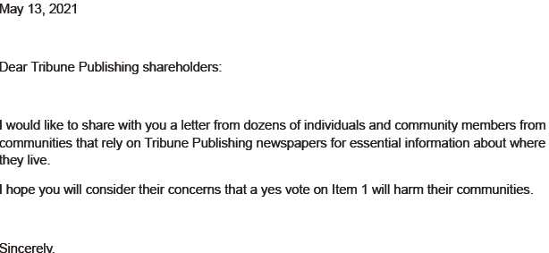 Tribune shareholders now have the opportunity to choose the future of local news coverage for our communities, and to protect the interests of these vital stakeholders.