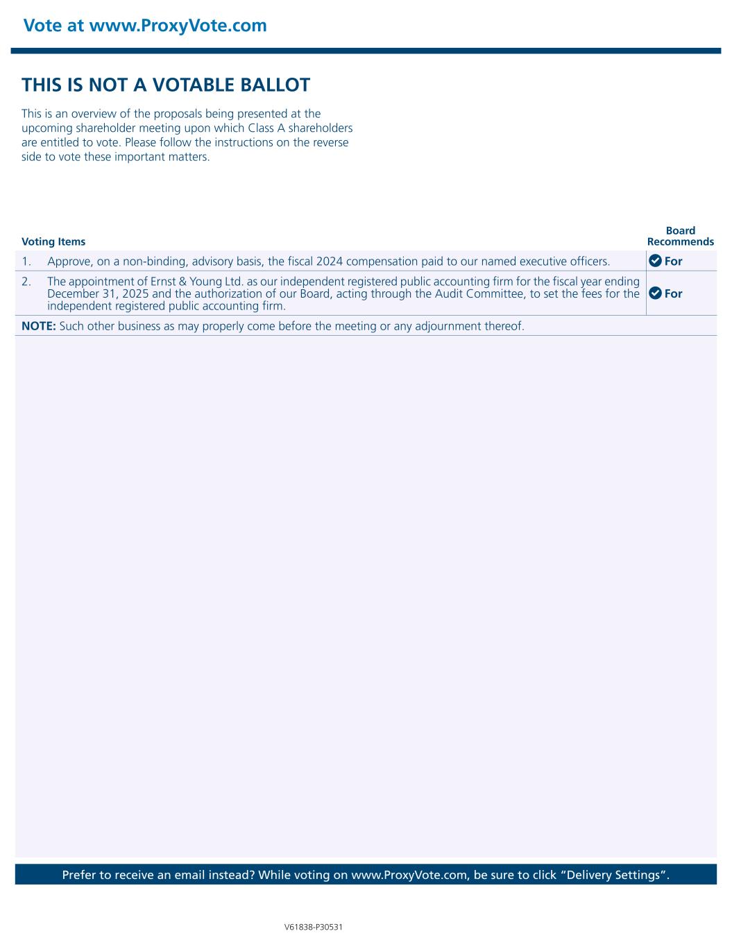 Vote at www.ProxyVote.com Prefer to receive an email instead? While voting on www.ProxyVote.com, be sure to click “Delivery Settings”. Voting Items Board Recommends V61838-P30531 THIS IS NOT A VOTABLE BALLOT This is an overview of the proposals being presented at the upcoming shareholder meeting upon which Class A shareholders are entitled to vote. Please follow the instructions on the reverse side to vote these important matters. 1. Approve, on a non-binding, advisory basis, the fiscal 2024 compensation paid to our named executive officers. For 2. The appointment of Ernst & Young Ltd. as our independent registered public accounting firm for the fiscal year ending December 31, 2025 and the authorization of our Board, acting through the Audit Committee, to set the fees for the independent registered public accounting firm. For NOTE: Such other business as may properly come before the meeting or any adjournment thereof.