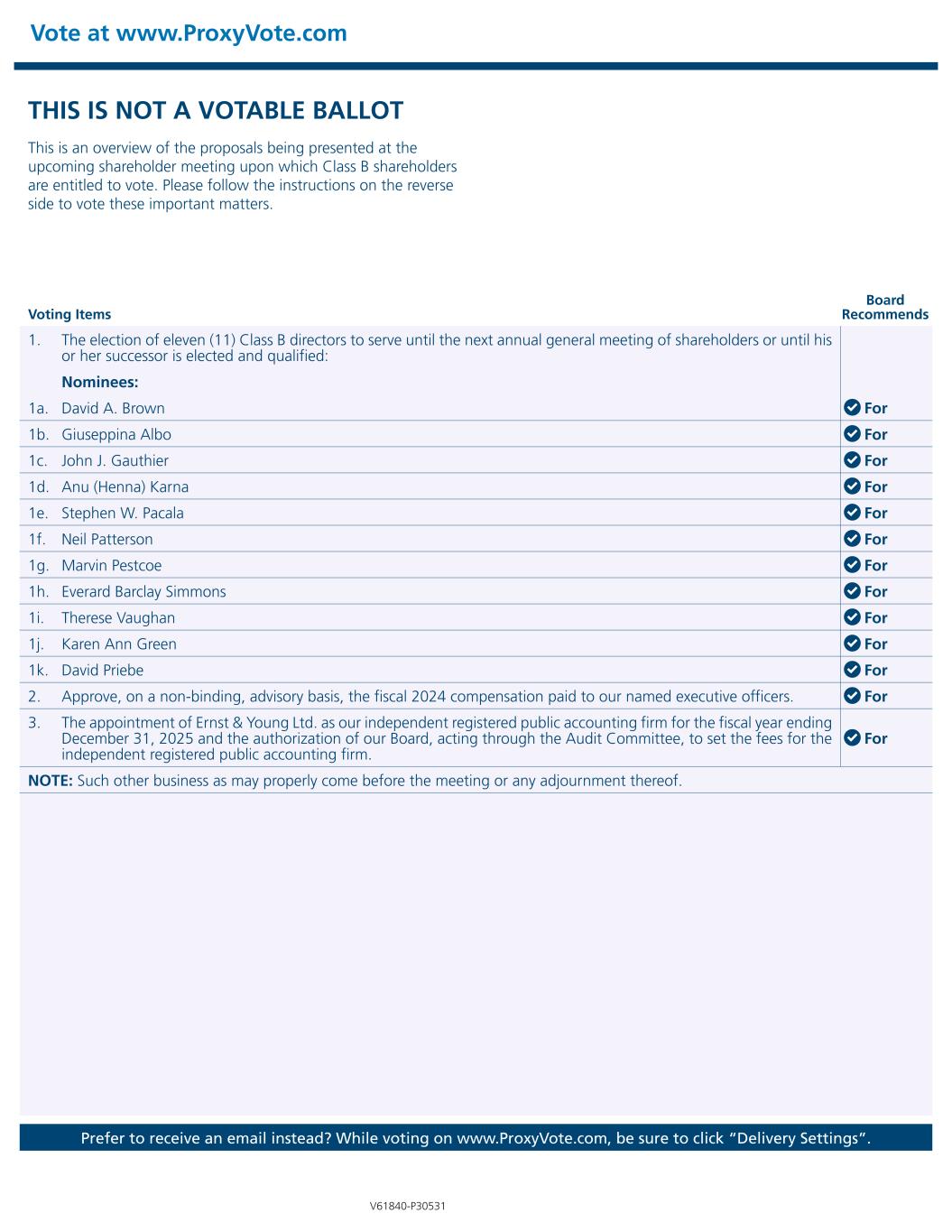 Vote at www.ProxyVote.com Prefer to receive an email instead? While voting on www.ProxyVote.com, be sure to click “Delivery Settings”. Voting Items Board Recommends V61840-P30531 THIS IS NOT A VOTABLE BALLOT This is an overview of the proposals being presented at the upcoming shareholder meeting upon which Class B shareholders are entitled to vote. Please follow the instructions on the reverse side to vote these important matters. 1. The election of eleven (11) Class B directors to serve until the next annual general meeting of shareholders or until his or her successor is elected and qualified: Nominees: 1a. David A. Brown For 1b. Giuseppina Albo For 1c. John J. Gauthier For 1d. Anu (Henna) Karna For 1e. Stephen W. Pacala For 1f. Neil Patterson For 1g. Marvin Pestcoe For 1h. Everard Barclay Simmons For 1i. Therese Vaughan For 1j. Karen Ann Green For 1k. David Priebe For 2. Approve, on a non-binding, advisory basis, the fiscal 2024 compensation paid to our named executive officers. For 3. The appointment of Ernst & Young Ltd. as our independent registered public accounting firm for the fiscal year ending December 31, 2025 and the authorization of our Board, acting through the Audit Committee, to set the fees for the independent registered public accounting firm. For NOTE: Such other business as may properly come before the meeting or any adjournment thereof.