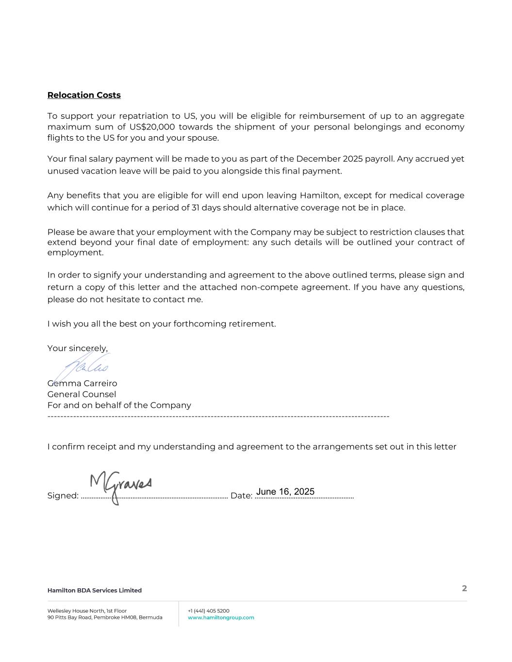2 Relocation Costs To support your repatriation to US, you will be eligible for reimbursement of up to an aggregate maximum sum of US$20,000 towards the shipment of your personal belongings and economy flights to the US for you and your spouse. Your final salary payment will be made to you as part of the December 2025 payroll. Any accrued yet unused vacation leave will be paid to you alongside this final payment. Any benefits that you are eligible for will end upon leaving Hamilton, except for medical coverage which will continue for a period of 31 days should alternative coverage not be in place. Please be aware that your employment with the Company may be subject to restriction clauses that extend beyond your final date of employment: any such details will be outlined your contract of employment. In order to signify your understanding and agreement to the above outlined terms, please sign and return a copy of this letter and the attached non-compete agreement. If you have any questions, please do not hesitate to contact me. I wish you all the best on your forthcoming retirement. Your sincerely, Gemma Carreiro General Counsel For and on behalf of the Company ----------------------------------------------------------------------------------------------------------- I confirm receipt and my understanding and agreement to the arrangements set out in this letter Signed: ................................................................................... Date: ........................................................ June 16, 2025