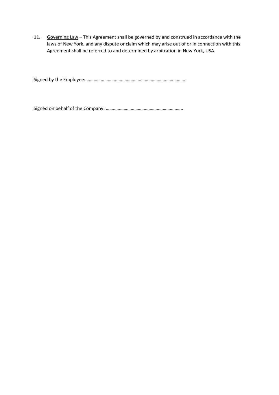 11. Governing Law – This Agreement shall be governed by and construed in accordance with the laws of New York, and any dispute or claim which may arise out of or in connection with this Agreement shall be referred to and determined by arbitration in New York, USA. Signed by the Employee: ………………………….…………………………………………….. Signed on behalf of the Company: ………………………………………………………..