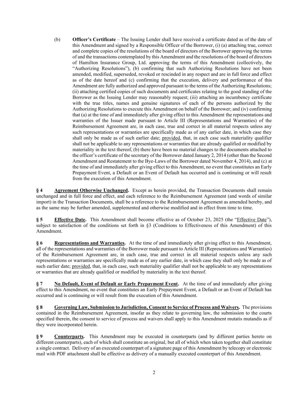2 (b) Officer’s Certificate – The Issuing Lender shall have received a certificate dated as of the date of this Amendment and signed by a Responsible Officer of the Borrower, (i) (a) attaching true, correct and complete copies of the resolutions of the board of directors of the Borrower approving the terms of and the transactions contemplated by this Amendment and the resolutions of the board of directors of Hamilton Insurance Group, Ltd. approving the terms of this Amendment (collectively, the “Authorizing Resolutions”), (b) confirming that such Authorizing Resolutions have not been amended, modified, superseded, revoked or rescinded in any respect and are in full force and effect as of the date hereof and (c) confirming that the execution, delivery and performance of this Amendment are fully authorized and approved pursuant to the terms of the Authorizing Resolutions; (ii) attaching certified copies of such documents and certificates relating to the good standing of the Borrower as the Issuing Lender may reasonably request; (iii) attaching an incumbency certificate with the true titles, names and genuine signatures of each of the persons authorized by the Authorizing Resolutions to execute this Amendment on behalf of the Borrower; and (iv) confirming that (a) at the time of and immediately after giving effect to this Amendment the representations and warranties of the Issuer made pursuant to Article III (Representations and Warranties) of the Reimbursement Agreement are, in each case, true and correct in all material respects unless any such representations or warranties are specifically made as of any earlier date, in which case they shall only be made as of such earlier date; provided, that, in each case such materiality qualifier shall not be applicable to any representations or warranties that are already qualified or modified by materiality in the text thereof, (b) there have been no material changes to the documents attached to the officer’s certificate of the secretary of the Borrower dated January 2, 2014 (other than the Second Amendment and Restatement to the Bye-Laws of the Borrower dated November 4, 2014), and (c) at the time of and immediately after giving effect to this Amendment, no event that constitutes an Early Prepayment Event, a Default or an Event of Default has occurred and is continuing or will result from the execution of this Amendment. § 4 Agreement Otherwise Unchanged. Except as herein provided, the Transaction Documents shall remain unchanged and in full force and effect, and each reference to the Reimbursement Agreement (and words of similar import) in the Transaction Documents, shall be a reference to the Reimbursement Agreement as amended hereby, and as the same may be further amended, supplemented and otherwise modified and in effect from time to time. § 5 Effective Date. This Amendment shall become effective as of October 23, 2025 (the “Effective Date”), subject to satisfaction of the conditions set forth in §3 (Conditions to Effectiveness of this Amendment) of this Amendment. § 6 Representations and Warranties. At the time of and immediately after giving effect to this Amendment, all of the representations and warranties of the Borrower made pursuant to Article III (Representations and Warranties) of the Reimbursement Agreement are, in each case, true and correct in all material respects unless any such representations or warranties are specifically made as of any earlier date, in which case they shall only be made as of such earlier date; provided, that, in each case, such materiality qualifier shall not be applicable to any representations or warranties that are already qualified or modified by materiality in the text thereof. § 7 No Default, Event of Default or Early Prepayment Event. At the time of and immediately after giving effect to this Amendment, no event that constitutes an Early Prepayment Event, a Default or an Event of Default has occurred and is continuing or will result from the execution of this Amendment. § 8 Governing Law, Submission to Jurisdiction, Consent to Service of Process and Waivers. The provisions contained in the Reimbursement Agreement, insofar as they relate to governing law, the submission to the courts specified therein, the consent to service of process and waivers shall apply to this Amendment mutatis mutandis as if they were incorporated herein. § 9 Counterparts. This Amendment may be executed in counterparts (and by different parties hereto on different counterparts), each of which shall constitute an original, but all of which when taken together shall constitute a single contract. Delivery of an executed counterpart of a signature page of this Amendment by telecopy or electronic mail with PDF attachment shall be effective as delivery of a manually executed counterpart of this Amendment.