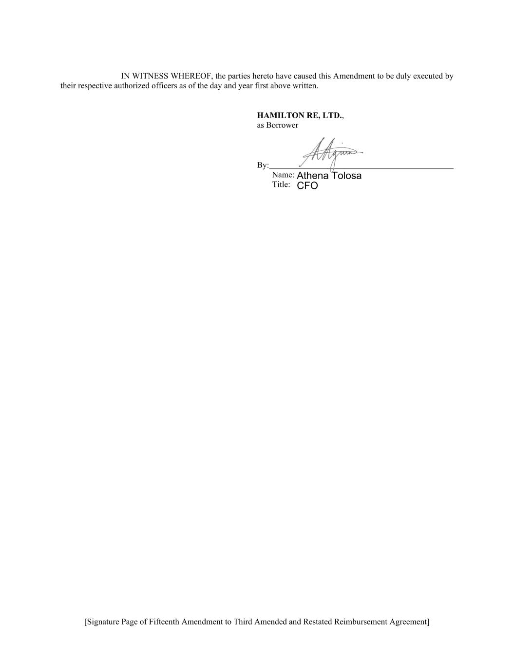 [Signature Page of Fifteenth Amendment to Third Amended and Restated Reimbursement Agreement] IN WITNESS WHEREOF, the parties hereto have caused this Amendment to be duly executed by their respective authorized officers as of the day and year first above written. HAMILTON RE, LTD., as Borrower By: Name: Title: Athena Tolosa CFO