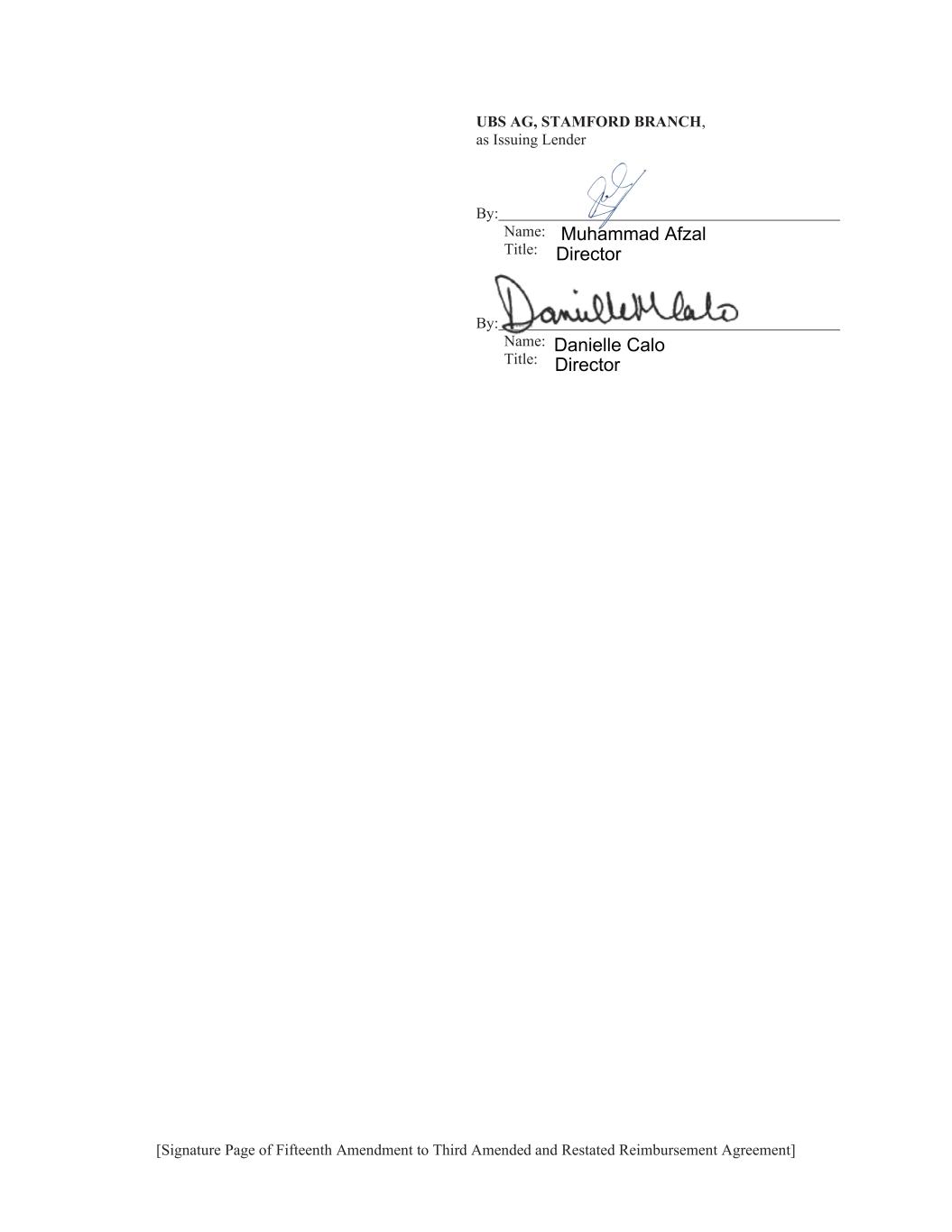 [Signature Page of Fifteenth Amendment to Third Amended and Restated Reimbursement Agreement] UBS AG, STAMFORD BRANCH, as Issuing Lender By: Name: Title: By: Name: Title: Muhammad Afzal Director Danielle Calo Director