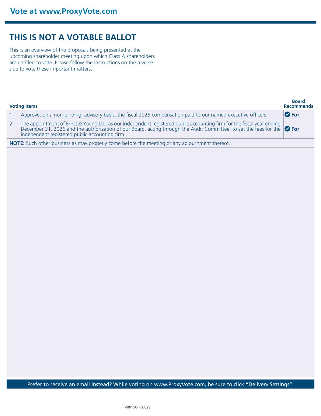 Vote at www.ProxyVote.com Prefer to receive an email instead? While voting on www.ProxyVote.com, be sure to click “Delivery Settings”. Voting Items Board Recommends V88150-P50029 THIS IS NOT A VOTABLE BALLOT This is an overview of the proposals being presented at the upcoming shareholder meeting upon which Class A shareholders are entitled to vote. Please follow the instructions on the reverse side to vote these important matters. 1. Approve, on a non-binding, advisory basis, the fiscal 2025 compensation paid to our named executive officers. For 2. The appointment of Ernst & Young Ltd. as our independent registered public accounting firm for the fiscal year ending December 31, 2026 and the authorization of our Board, acting through the Audit Committee, to set the fees for the independent registered public accounting firm. For NOTE: Such other business as may properly come before the meeting or any adjournment thereof.
