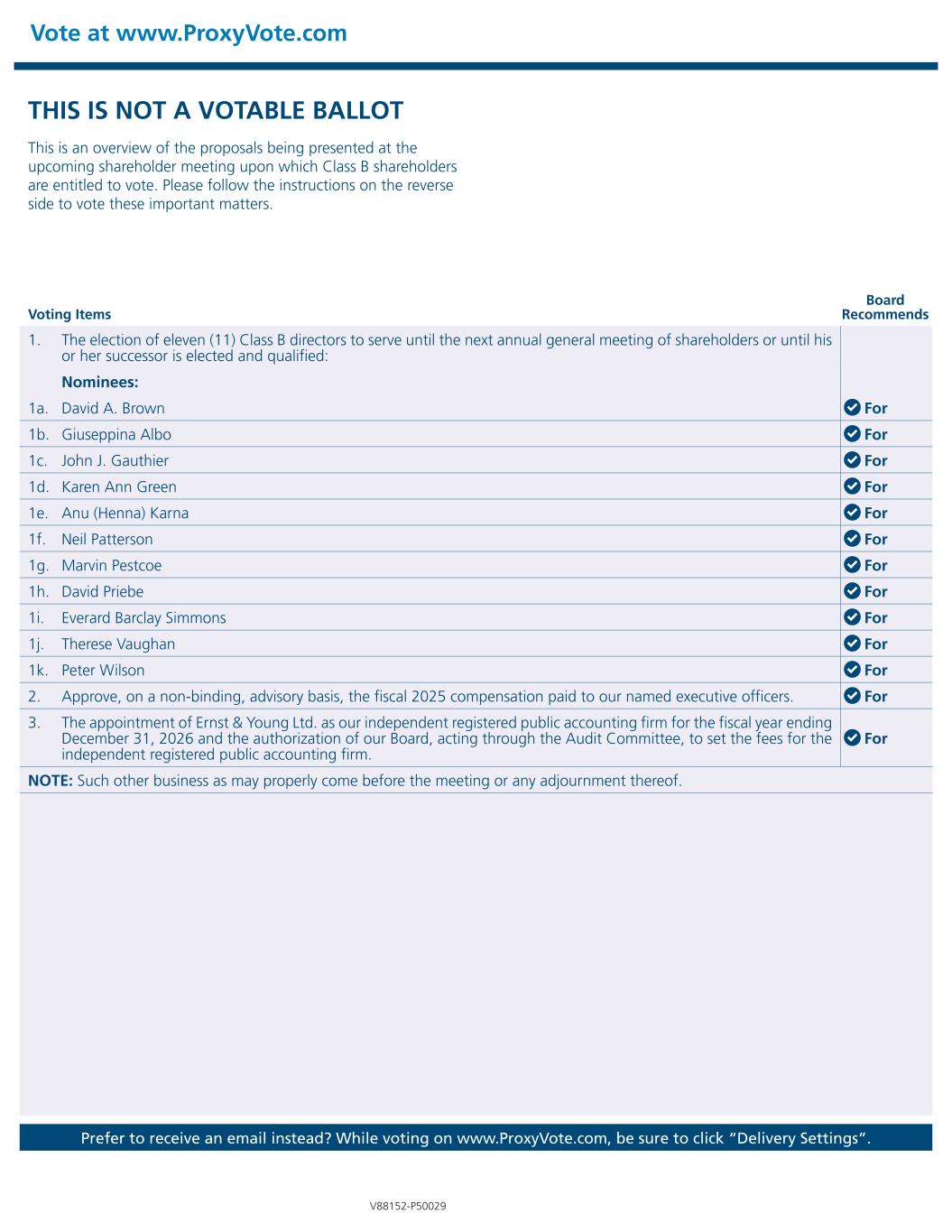 Vote at www.ProxyVote.com Prefer to receive an email instead? While voting on www.ProxyVote.com, be sure to click “Delivery Settings”. Voting Items Board Recommends V88152-P50029 THIS IS NOT A VOTABLE BALLOT This is an overview of the proposals being presented at the upcoming shareholder meeting upon which Class B shareholders are entitled to vote. Please follow the instructions on the reverse side to vote these important matters. 1. The election of eleven (11) Class B directors to serve until the next annual general meeting of shareholders or until his or her successor is elected and qualified: Nominees: 1a. David A. Brown For 1b. Giuseppina Albo For 1c. John J. Gauthier For 1d. Karen Ann Green For 1e. Anu (Henna) Karna For 1f. Neil Patterson For 1g. Marvin Pestcoe For 1h. David Priebe For 1i. Everard Barclay Simmons For 1j. Therese Vaughan For 1k. Peter Wilson For 2. Approve, on a non-binding, advisory basis, the fiscal 2025 compensation paid to our named executive officers. For 3. The appointment of Ernst & Young Ltd. as our independent registered public accounting firm for the fiscal year ending December 31, 2026 and the authorization of our Board, acting through the Audit Committee, to set the fees for the independent registered public accounting firm. For NOTE: Such other business as may properly come before the meeting or any adjournment thereof.