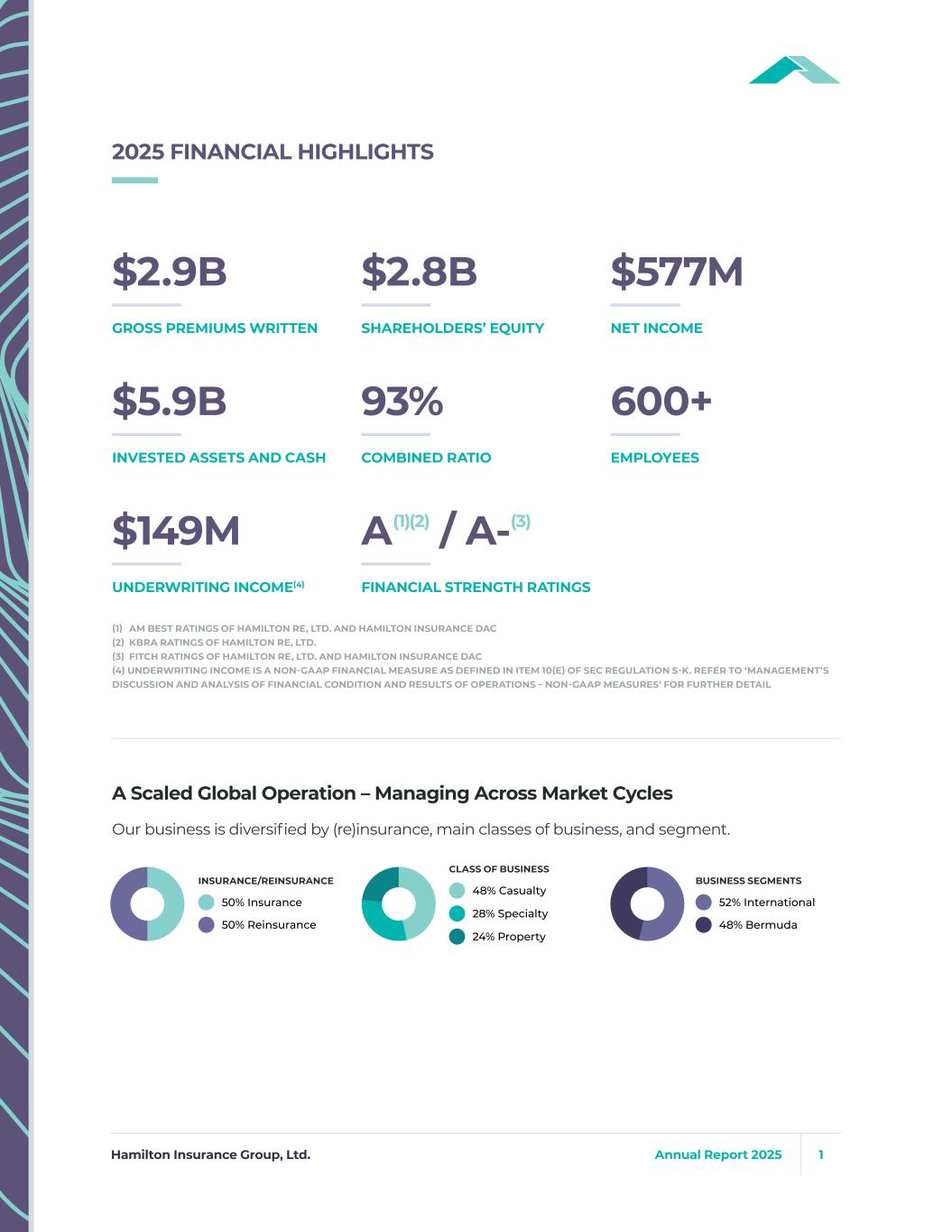 Hamilton Insurance Group, Ltd. Annual Report 2025 1 $2.9B GROSS PREMIUMS WRITTEN $5.9B INVESTED ASSETS AND CASH $149M UNDERWRITING INCOME(4) $2.8B SHAREHOLDERS’ EQUITY 93% COMBINED RATIO A(1)(2) / A-(3) FINANCIAL STRENGTH RATINGS $577M NET INCOME 600+ EMPLOYEES (1) AM BEST RATINGS OF HAMILTON RE, LTD. AND HAMILTON INSURANCE DAC (2) KBRA RATINGS OF HAMILTON RE, LTD. (3) FITCH RATINGS OF HAMILTON RE, LTD. AND HAMILTON INSURANCE DAC (4) UNDERWRITING INCOME IS A NON-GAAP FINANCIAL MEASURE AS DEFINED IN ITEM 10(E) OF SEC REGULATION S-K. REFER TO ‘MANAGEMENT’S DISCUSSION AND ANALYSIS OF FINANCIAL CONDITION AND RESULTS OF OPERATIONS – NON-GAAP MEASURES’ FOR FURTHER DETAIL A Scaled Global Operation – Managing Across Market Cycles Our business is diversified by (re)insurance, main classes of business, and segment. 2025 FINANCIAL HIGHLIGHTS INSURANCE/REINSURANCE 50% Insurance 50% Reinsurance CLASS OF BUSINESS 48% Casualty 28% Specialty 24% Property BUSINESS SEGMENTS 52% International 48% Bermuda