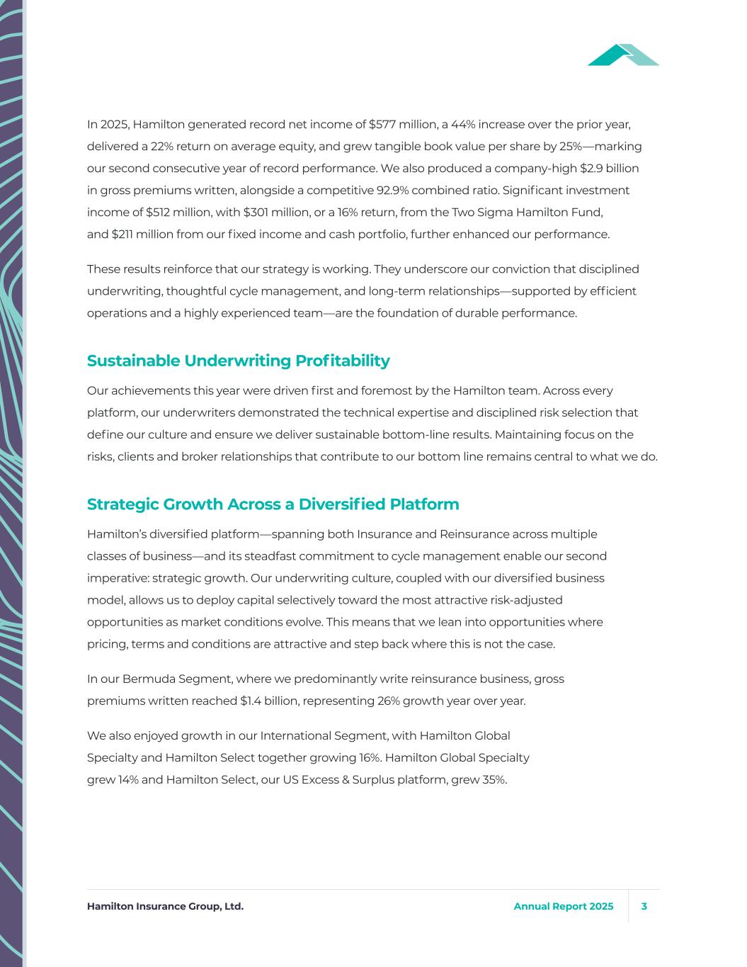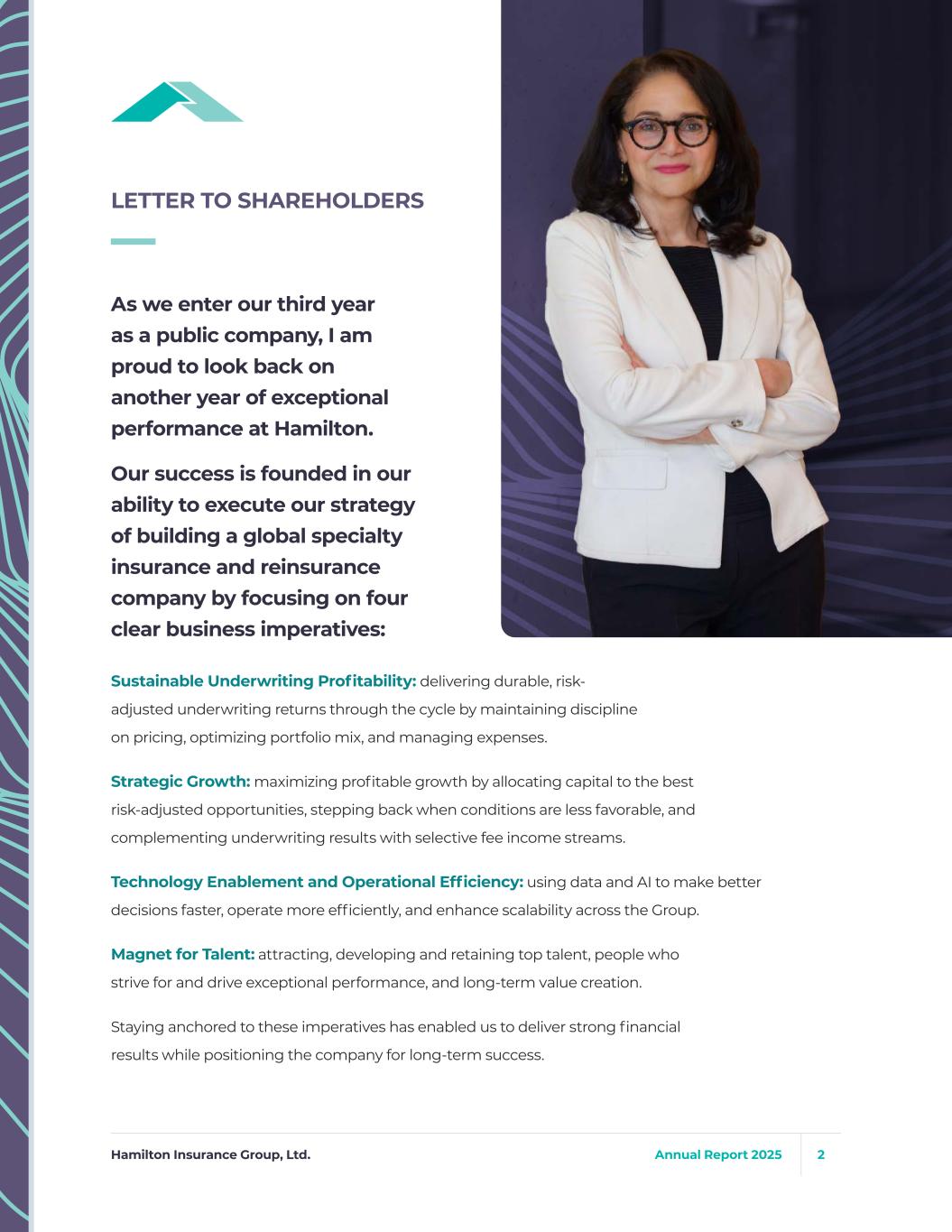 Hamilton Insurance Group, Ltd. Annual Report 2025 2 LETTER TO SHAREHOLDERS As we enter our third year as a public company, I am proud to look back on another year of exceptional performance at Hamilton. Our success is founded in our ability to execute our strategy of building a global specialty insurance and reinsurance company by focusing on four clear business imperatives: Sustainable Underwriting Profitability: delivering durable, risk- adjusted underwriting returns through the cycle by maintaining discipline on pricing, optimizing portfolio mix, and managing expenses. Strategic Growth: maximizing profitable growth by allocating capital to the best risk-adjusted opportunities, stepping back when conditions are less favorable, and complementing underwriting results with selective fee income streams. Technology Enablement and Operational Efficiency: using data and AI to make better decisions faster, operate more efficiently, and enhance scalability across the Group. Magnet for Talent: attracting, developing and retaining top talent, people who strive for and drive exceptional performance, and long-term value creation. Staying anchored to these imperatives has enabled us to deliver strong financial results while positioning the company for long-term success.