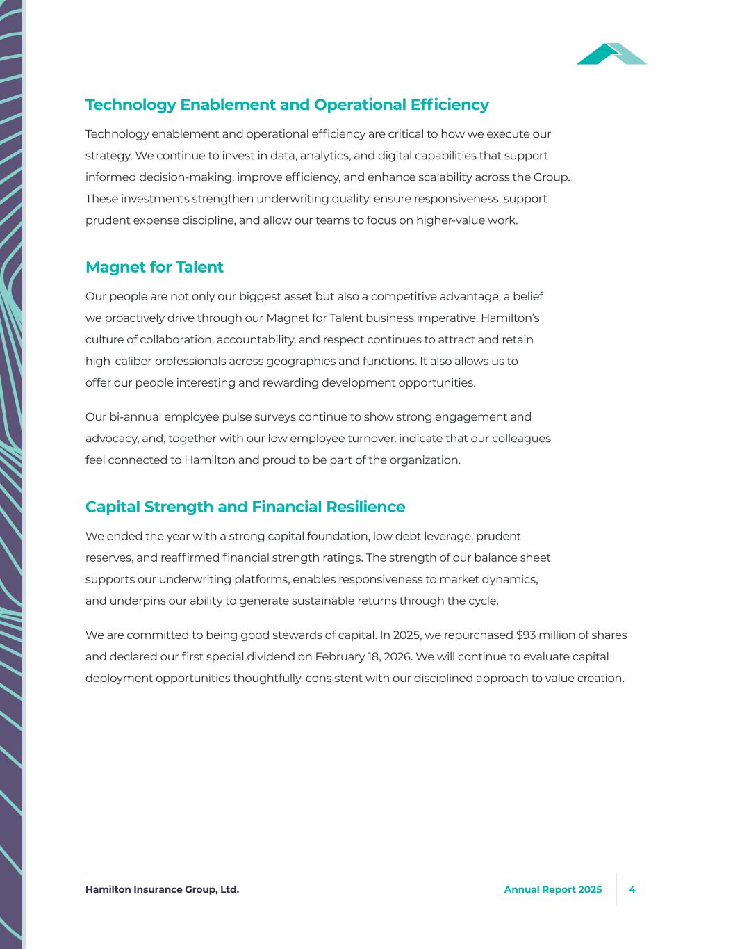 Hamilton Insurance Group, Ltd. Annual Report 2025 4 Technology Enablement and Operational Efficiency Technology enablement and operational efficiency are critical to how we execute our strategy. We continue to invest in data, analytics, and digital capabilities that support informed decision-making, improve efficiency, and enhance scalability across the Group. These investments strengthen underwriting quality, ensure responsiveness, support prudent expense discipline, and allow our teams to focus on higher-value work. Magnet for Talent Our people are not only our biggest asset but also a competitive advantage, a belief we proactively drive through our Magnet for Talent business imperative. Hamilton’s culture of collaboration, accountability, and respect continues to attract and retain high-caliber professionals across geographies and functions. It also allows us to offer our people interesting and rewarding development opportunities. Our bi-annual employee pulse surveys continue to show strong engagement and advocacy, and, together with our low employee turnover, indicate that our colleagues feel connected to Hamilton and proud to be part of the organization. Capital Strength and Financial Resilience We ended the year with a strong capital foundation, low debt leverage, prudent reserves, and reaffirmed financial strength ratings. The strength of our balance sheet supports our underwriting platforms, enables responsiveness to market dynamics, and underpins our ability to generate sustainable returns through the cycle. We are committed to being good stewards of capital. In 2025, we repurchased $93 million of shares and declared our first special dividend on February 18, 2026. We will continue to evaluate capital deployment opportunities thoughtfully, consistent with our disciplined approach to value creation.