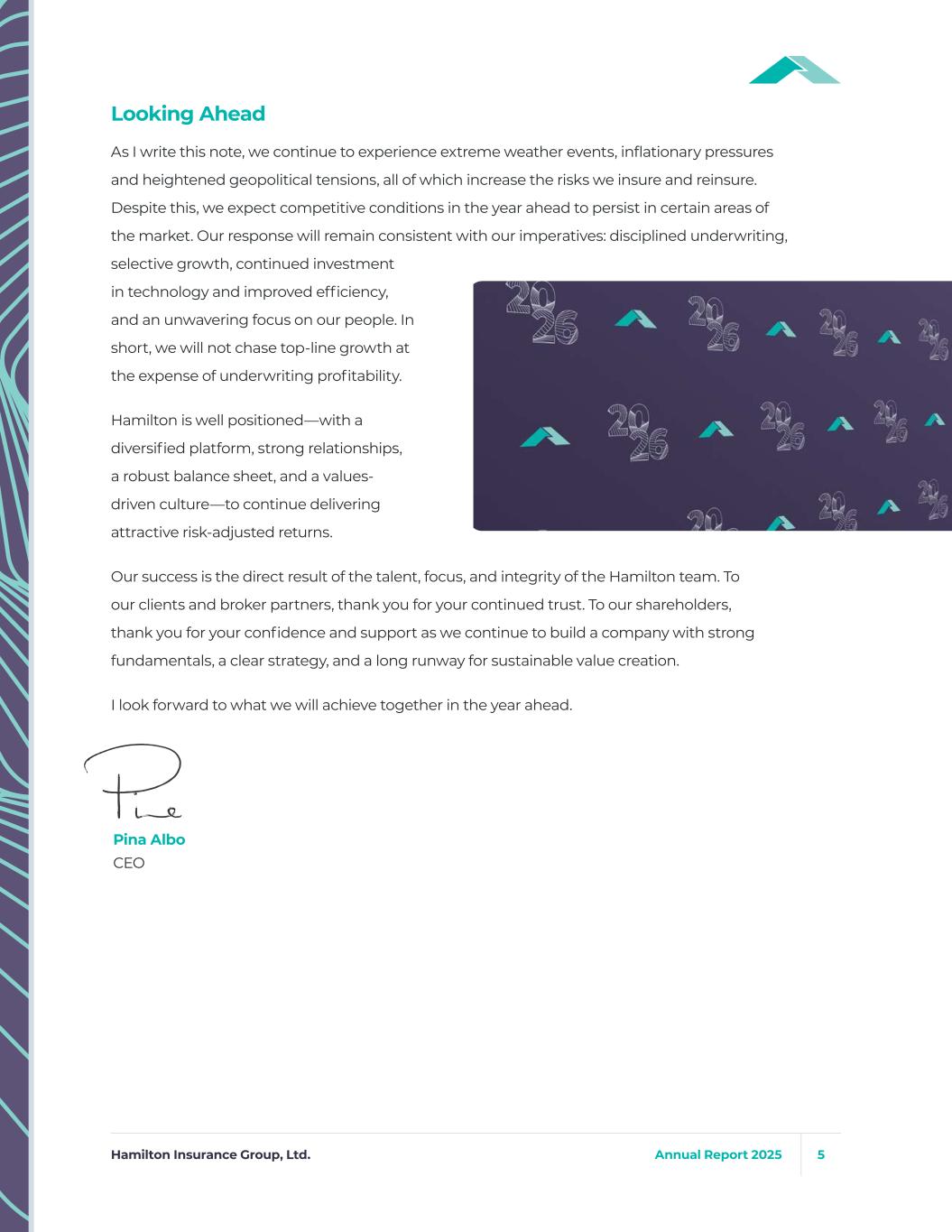 Hamilton Insurance Group, Ltd. Annual Report 2025 5 Looking Ahead As I write this note, we continue to experience extreme weather events, inflationary pressures and heightened geopolitical tensions, all of which increase the risks we insure and reinsure. Despite this, we expect competitive conditions in the year ahead to persist in certain areas of the market. Our response will remain consistent with our imperatives: disciplined underwriting, selective growth, continued investment in technology and improved efficiency, and an unwavering focus on our people. In short, we will not chase top-line growth at the expense of underwriting profitability. Hamilton is well positioned—with a diversified platform, strong relationships, a robust balance sheet, and a values- driven culture—to continue delivering attractive risk-adjusted returns. Our success is the direct result of the talent, focus, and integrity of the Hamilton team. To our clients and broker partners, thank you for your continued trust. To our shareholders, thank you for your confidence and support as we continue to build a company with strong fundamentals, a clear strategy, and a long runway for sustainable value creation. I look forward to what we will achieve together in the year ahead. Pina Albo CEO
