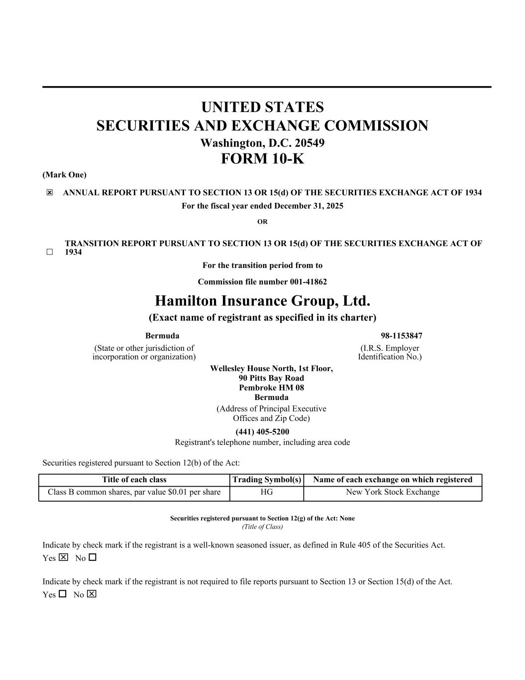 UNITED STATES SECURITIES AND EXCHANGE COMMISSION Washington, D.C. 20549 FORM 10-K (Mark One) ☒ ANNUAL REPORT PURSUANT TO SECTION 13 OR 15(d) OF THE SECURITIES EXCHANGE ACT OF 1934 For the fiscal year ended December 31, 2025 OR ☐ TRANSITION REPORT PURSUANT TO SECTION 13 OR 15(d) OF THE SECURITIES EXCHANGE ACT OF 1934 For the transition period from to Commission file number 001-41862 Hamilton Insurance Group, Ltd. (Exact name of registrant as specified in its charter) Bermuda 98-1153847 (State or other jurisdiction of incorporation or organization) (I.R.S. Employer Identification No.) Wellesley House North, 1st Floor, 90 Pitts Bay Road Pembroke HM 08 Bermuda (Address of Principal Executive Offices and Zip Code) (441) 405-5200 Registrant's telephone number, including area code Securities registered pursuant to Section 12(b) of the Act: Title of each class Trading Symbol(s) Name of each exchange on which registered Class B common shares, par value $0.01 per share HG New York Stock Exchange Securities registered pursuant to Section 12(g) of the Act: None (Title of Class) Indicate by check mark if the registrant is a well-known seasoned issuer, as defined in Rule 405 of the Securities Act. Yes x No o Indicate by check mark if the registrant is not required to file reports pursuant to Section 13 or Section 15(d) of the Act. Yes o No x