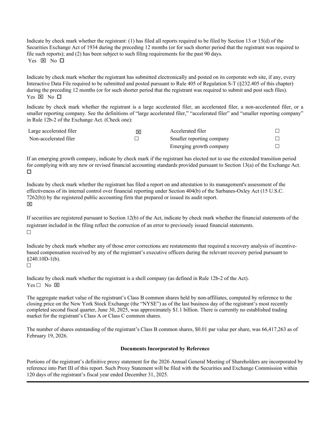 Indicate by check mark whether the registrant: (1) has filed all reports required to be filed by Section 13 or 15(d) of the Securities Exchange Act of 1934 during the preceding 12 months (or for such shorter period that the registrant was required to file such reports); and (2) has been subject to such filing requirements for the past 90 days. Yes x No o Indicate by check mark whether the registrant has submitted electronically and posted on its corporate web site, if any, every Interactive Data File required to be submitted and posted pursuant to Rule 405 of Regulation S-T (§232.405 of this chapter) during the preceding 12 months (or for such shorter period that the registrant was required to submit and post such files). Yes x No o Indicate by check mark whether the registrant is a large accelerated filer, an accelerated filer, a non-accelerated filer, or a smaller reporting company. See the definitions of “large accelerated filer,” “accelerated filer” and “smaller reporting company” in Rule 12b-2 of the Exchange Act. (Check one): Large accelerated filer x Accelerated filer ☐ Non-accelerated filer ☐ Smaller reporting company ☐ Emerging growth company ☐ If an emerging growth company, indicate by check mark if the registrant has elected not to use the extended transition period for complying with any new or revised financial accounting standards provided pursuant to Section 13(a) of the Exchange Act. o Indicate by check mark whether the registrant has filed a report on and attestation to its management's assessment of the effectiveness of its internal control over financial reporting under Section 404(b) of the Sarbanes-Oxley Act (15 U.S.C. 7262(b)) by the registered public accounting firm that prepared or issued its audit report. x If securities are registered pursuant to Section 12(b) of the Act, indicate by check mark whether the financial statements of the registrant included in the filing reflect the correction of an error to previously issued financial statements. ☐ Indicate by check mark whether any of those error corrections are restatements that required a recovery analysis of incentive- based compensation received by any of the registrant’s executive officers during the relevant recovery period pursuant to §240.10D-1(b). ☐ Indicate by check mark whether the registrant is a shell company (as defined in Rule 12b-2 of the Act). Yes ☐ No x The aggregate market value of the registrant’s Class B common shares held by non-affiliates, computed by reference to the closing price on the New York Stock Exchange (the “NYSE”) as of the last business day of the registrant’s most recently completed second fiscal quarter, June 30, 2025, was approximately $1.1 billion. There is currently no established trading market for the registrant’s Class A or Class C common shares. The number of shares outstanding of the registrant’s Class B common shares, $0.01 par value per share, was 66,417,263 as of February 19, 2026. Documents Incorporated by Reference Portions of the registrant’s definitive proxy statement for the 2026 Annual General Meeting of Shareholders are incorporated by reference into Part III of this report. Such Proxy Statement will be filed with the Securities and Exchange Commission within 120 days of the registrant’s fiscal year ended December 31, 2025.