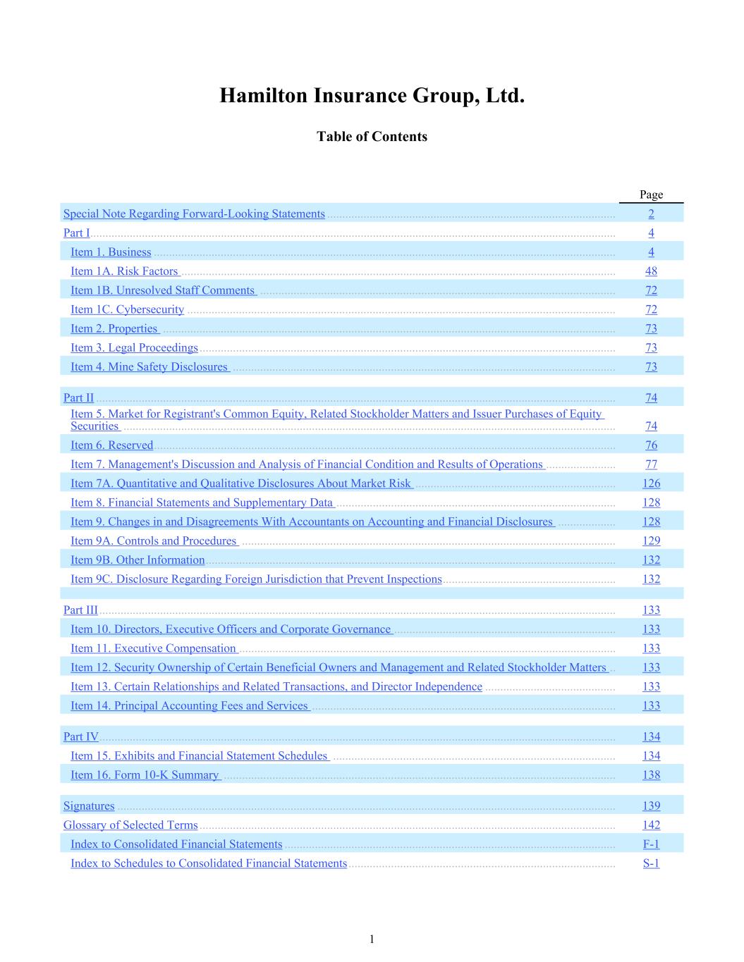 Hamilton Insurance Group, Ltd. Table of Contents Page Special Note Regarding Forward-Looking Statements ............................................................................................... 2 Part I ............................................................................................................................................................................. 4 Item 1. Business ........................................................................................................................................................ 4 Item 1A. Risk Factors ............................................................................................................................................... 48 Item 1B. Unresolved Staff Comments ..................................................................................................................... 72 Item 1C. Cybersecurity ............................................................................................................................................. 72 Item 2. Properties ..................................................................................................................................................... 73 Item 3. Legal Proceedings ......................................................................................................................................... 73 Item 4. Mine Safety Disclosures .............................................................................................................................. 73 Part II ........................................................................................................................................................................... 74 Item 5. Market for Registrant's Common Equity, Related Stockholder Matters and Issuer Purchases of Equity Securities .................................................................................................................................................................. 74 Item 6. Reserved ........................................................................................................................................................ 76 Item 7. Management's Discussion and Analysis of Financial Condition and Results of Operations ....................... 77 Item 7A. Quantitative and Qualitative Disclosures About Market Risk .................................................................. 126 Item 8. Financial Statements and Supplementary Data ............................................................................................ 128 Item 9. Changes in and Disagreements With Accountants on Accounting and Financial Disclosures ................... 128 Item 9A. Controls and Procedures ........................................................................................................................... 129 Item 9B. Other Information ....................................................................................................................................... 132 Item 9C. Disclosure Regarding Foreign Jurisdiction that Prevent Inspections ......................................................... 132 Part III .......................................................................................................................................................................... 133 Item 10. Directors, Executive Officers and Corporate Governance ......................................................................... 133 Item 11. Executive Compensation ............................................................................................................................ 133 Item 12. Security Ownership of Certain Beneficial Owners and Management and Related Stockholder Matters .. 133 Item 13. Certain Relationships and Related Transactions, and Director Independence ........................................... 133 Item 14. Principal Accounting Fees and Services .................................................................................................... 133 Part IV .......................................................................................................................................................................... 134 Item 15. Exhibits and Financial Statement Schedules ............................................................................................. 134 Item 16. Form 10-K Summary ................................................................................................................................. 138 Signatures .................................................................................................................................................................... 139 Glossary of Selected Terms ......................................................................................................................................... 142 Index to Consolidated Financial Statements ............................................................................................................. F-1 Index to Schedules to Consolidated Financial Statements ........................................................................................ S-1 1