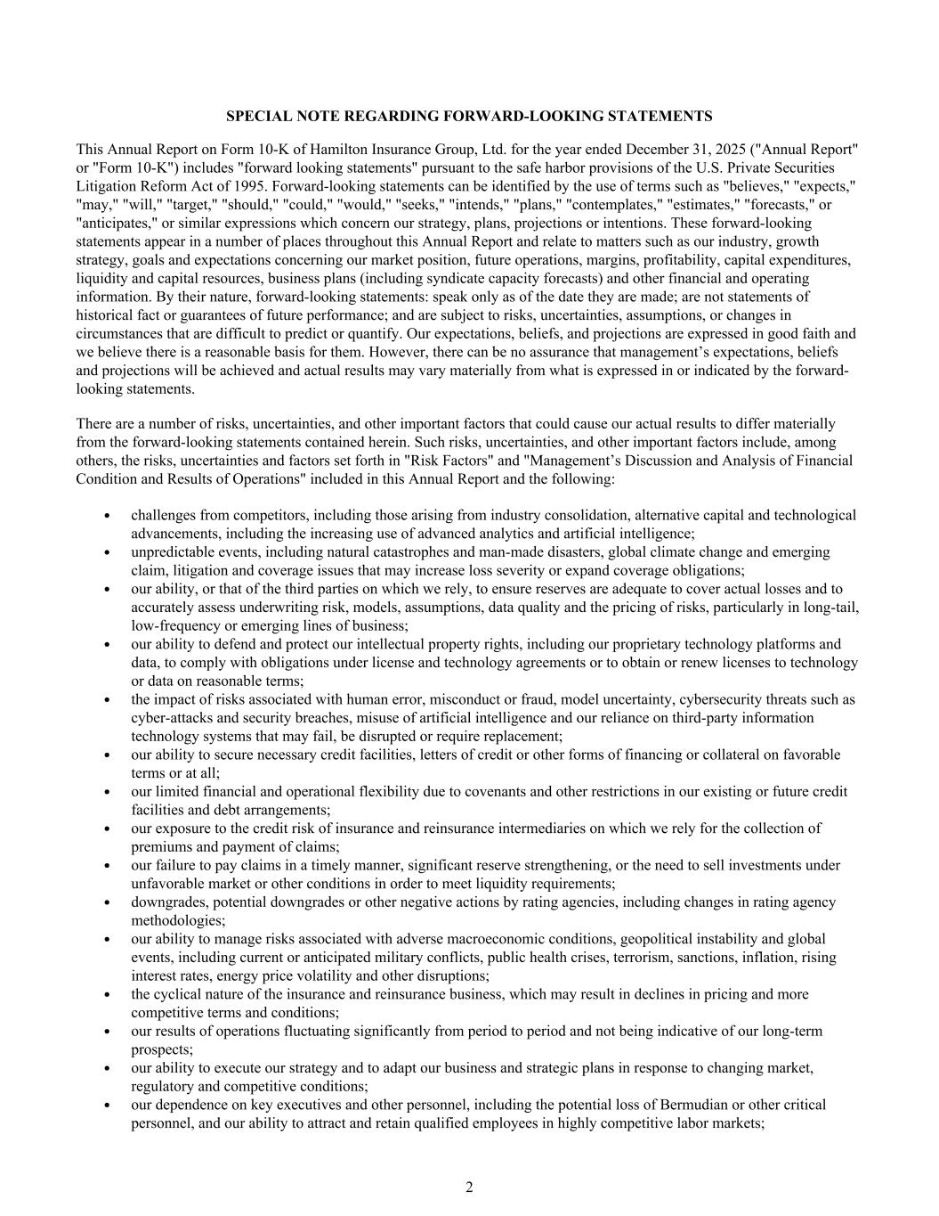 SPECIAL NOTE REGARDING FORWARD-LOOKING STATEMENTS This Annual Report on Form 10-K of Hamilton Insurance Group, Ltd. for the year ended December 31, 2025 ("Annual Report" or "Form 10-K") includes "forward looking statements" pursuant to the safe harbor provisions of the U.S. Private Securities Litigation Reform Act of 1995. Forward-looking statements can be identified by the use of terms such as "believes," "expects," "may," "will," "target," "should," "could," "would," "seeks," "intends," "plans," "contemplates," "estimates," "forecasts," or "anticipates," or similar expressions which concern our strategy, plans, projections or intentions. These forward-looking statements appear in a number of places throughout this Annual Report and relate to matters such as our industry, growth strategy, goals and expectations concerning our market position, future operations, margins, profitability, capital expenditures, liquidity and capital resources, business plans (including syndicate capacity forecasts) and other financial and operating information. By their nature, forward-looking statements: speak only as of the date they are made; are not statements of historical fact or guarantees of future performance; and are subject to risks, uncertainties, assumptions, or changes in circumstances that are difficult to predict or quantify. Our expectations, beliefs, and projections are expressed in good faith and we believe there is a reasonable basis for them. However, there can be no assurance that management’s expectations, beliefs and projections will be achieved and actual results may vary materially from what is expressed in or indicated by the forward- looking statements. There are a number of risks, uncertainties, and other important factors that could cause our actual results to differ materially from the forward-looking statements contained herein. Such risks, uncertainties, and other important factors include, among others, the risks, uncertainties and factors set forth in "Risk Factors" and "Management’s Discussion and Analysis of Financial Condition and Results of Operations" included in this Annual Report and the following: • challenges from competitors, including those arising from industry consolidation, alternative capital and technological advancements, including the increasing use of advanced analytics and artificial intelligence; • unpredictable events, including natural catastrophes and man-made disasters, global climate change and emerging claim, litigation and coverage issues that may increase loss severity or expand coverage obligations; • our ability, or that of the third parties on which we rely, to ensure reserves are adequate to cover actual losses and to accurately assess underwriting risk, models, assumptions, data quality and the pricing of risks, particularly in long-tail, low-frequency or emerging lines of business; • our ability to defend and protect our intellectual property rights, including our proprietary technology platforms and data, to comply with obligations under license and technology agreements or to obtain or renew licenses to technology or data on reasonable terms; • the impact of risks associated with human error, misconduct or fraud, model uncertainty, cybersecurity threats such as cyber-attacks and security breaches, misuse of artificial intelligence and our reliance on third-party information technology systems that may fail, be disrupted or require replacement; • our ability to secure necessary credit facilities, letters of credit or other forms of financing or collateral on favorable terms or at all; • our limited financial and operational flexibility due to covenants and other restrictions in our existing or future credit facilities and debt arrangements; • our exposure to the credit risk of insurance and reinsurance intermediaries on which we rely for the collection of premiums and payment of claims; • our failure to pay claims in a timely manner, significant reserve strengthening, or the need to sell investments under unfavorable market or other conditions in order to meet liquidity requirements; • downgrades, potential downgrades or other negative actions by rating agencies, including changes in rating agency methodologies; • our ability to manage risks associated with adverse macroeconomic conditions, geopolitical instability and global events, including current or anticipated military conflicts, public health crises, terrorism, sanctions, inflation, rising interest rates, energy price volatility and other disruptions; • the cyclical nature of the insurance and reinsurance business, which may result in declines in pricing and more competitive terms and conditions; • our results of operations fluctuating significantly from period to period and not being indicative of our long-term prospects; • our ability to execute our strategy and to adapt our business and strategic plans in response to changing market, regulatory and competitive conditions; • our dependence on key executives and other personnel, including the potential loss of Bermudian or other critical personnel, and our ability to attract and retain qualified employees in highly competitive labor markets; 2