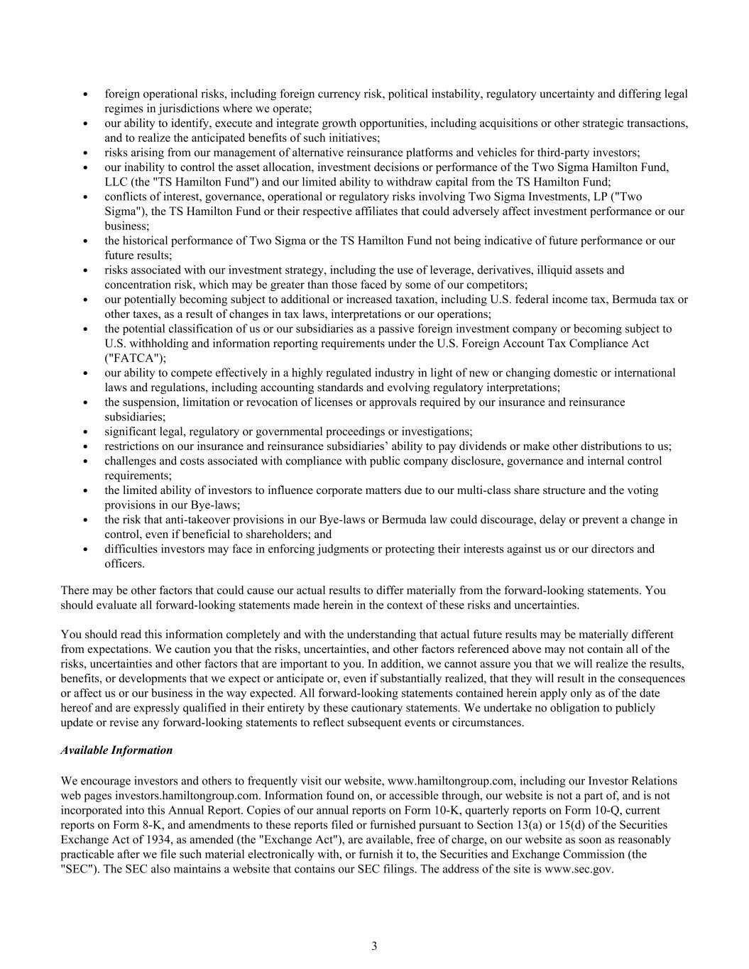 • foreign operational risks, including foreign currency risk, political instability, regulatory uncertainty and differing legal regimes in jurisdictions where we operate; • our ability to identify, execute and integrate growth opportunities, including acquisitions or other strategic transactions, and to realize the anticipated benefits of such initiatives; • risks arising from our management of alternative reinsurance platforms and vehicles for third-party investors; • our inability to control the asset allocation, investment decisions or performance of the Two Sigma Hamilton Fund, LLC (the "TS Hamilton Fund") and our limited ability to withdraw capital from the TS Hamilton Fund; • conflicts of interest, governance, operational or regulatory risks involving Two Sigma Investments, LP ("Two Sigma"), the TS Hamilton Fund or their respective affiliates that could adversely affect investment performance or our business; • the historical performance of Two Sigma or the TS Hamilton Fund not being indicative of future performance or our future results; • risks associated with our investment strategy, including the use of leverage, derivatives, illiquid assets and concentration risk, which may be greater than those faced by some of our competitors; • our potentially becoming subject to additional or increased taxation, including U.S. federal income tax, Bermuda tax or other taxes, as a result of changes in tax laws, interpretations or our operations; • the potential classification of us or our subsidiaries as a passive foreign investment company or becoming subject to U.S. withholding and information reporting requirements under the U.S. Foreign Account Tax Compliance Act ("FATCA"); • our ability to compete effectively in a highly regulated industry in light of new or changing domestic or international laws and regulations, including accounting standards and evolving regulatory interpretations; • the suspension, limitation or revocation of licenses or approvals required by our insurance and reinsurance subsidiaries; • significant legal, regulatory or governmental proceedings or investigations; • restrictions on our insurance and reinsurance subsidiaries’ ability to pay dividends or make other distributions to us; • challenges and costs associated with compliance with public company disclosure, governance and internal control requirements; • the limited ability of investors to influence corporate matters due to our multi-class share structure and the voting provisions in our Bye-laws; • the risk that anti-takeover provisions in our Bye-laws or Bermuda law could discourage, delay or prevent a change in control, even if beneficial to shareholders; and • difficulties investors may face in enforcing judgments or protecting their interests against us or our directors and officers. There may be other factors that could cause our actual results to differ materially from the forward-looking statements. You should evaluate all forward-looking statements made herein in the context of these risks and uncertainties. You should read this information completely and with the understanding that actual future results may be materially different from expectations. We caution you that the risks, uncertainties, and other factors referenced above may not contain all of the risks, uncertainties and other factors that are important to you. In addition, we cannot assure you that we will realize the results, benefits, or developments that we expect or anticipate or, even if substantially realized, that they will result in the consequences or affect us or our business in the way expected. All forward-looking statements contained herein apply only as of the date hereof and are expressly qualified in their entirety by these cautionary statements. We undertake no obligation to publicly update or revise any forward-looking statements to reflect subsequent events or circumstances. Available Information We encourage investors and others to frequently visit our website, www.hamiltongroup.com, including our Investor Relations web pages investors.hamiltongroup.com. Information found on, or accessible through, our website is not a part of, and is not incorporated into this Annual Report. Copies of our annual reports on Form 10-K, quarterly reports on Form 10-Q, current reports on Form 8-K, and amendments to these reports filed or furnished pursuant to Section 13(a) or 15(d) of the Securities Exchange Act of 1934, as amended (the "Exchange Act"), are available, free of charge, on our website as soon as reasonably practicable after we file such material electronically with, or furnish it to, the Securities and Exchange Commission (the "SEC"). The SEC also maintains a website that contains our SEC filings. The address of the site is www.sec.gov. 3