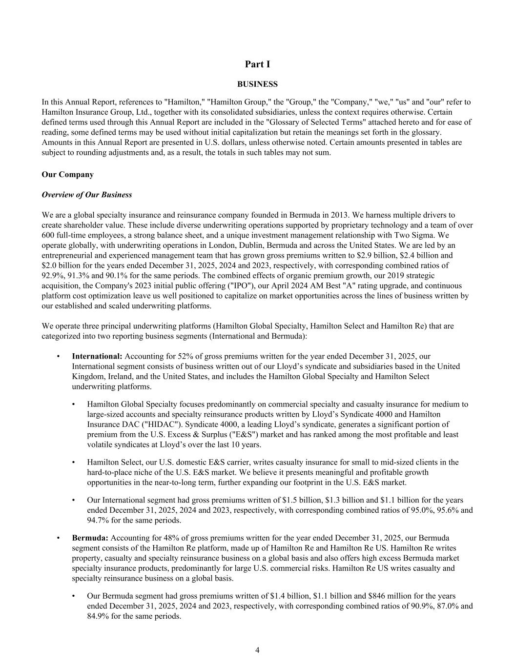 Part I BUSINESS In this Annual Report, references to "Hamilton," "Hamilton Group," the "Group," the "Company," "we," "us" and "our" refer to Hamilton Insurance Group, Ltd., together with its consolidated subsidiaries, unless the context requires otherwise. Certain defined terms used through this Annual Report are included in the "Glossary of Selected Terms" attached hereto and for ease of reading, some defined terms may be used without initial capitalization but retain the meanings set forth in the glossary. Amounts in this Annual Report are presented in U.S. dollars, unless otherwise noted. Certain amounts presented in tables are subject to rounding adjustments and, as a result, the totals in such tables may not sum. Our Company Overview of Our Business We are a global specialty insurance and reinsurance company founded in Bermuda in 2013. We harness multiple drivers to create shareholder value. These include diverse underwriting operations supported by proprietary technology and a team of over 600 full-time employees, a strong balance sheet, and a unique investment management relationship with Two Sigma. We operate globally, with underwriting operations in London, Dublin, Bermuda and across the United States. We are led by an entrepreneurial and experienced management team that has grown gross premiums written to $2.9 billion, $2.4 billion and $2.0 billion for the years ended December 31, 2025, 2024 and 2023, respectively, with corresponding combined ratios of 92.9%, 91.3% and 90.1% for the same periods. The combined effects of organic premium growth, our 2019 strategic acquisition, the Company's 2023 initial public offering ("IPO"), our April 2024 AM Best "A" rating upgrade, and continuous platform cost optimization leave us well positioned to capitalize on market opportunities across the lines of business written by our established and scaled underwriting platforms. We operate three principal underwriting platforms (Hamilton Global Specialty, Hamilton Select and Hamilton Re) that are categorized into two reporting business segments (International and Bermuda): • International: Accounting for 52% of gross premiums written for the year ended December 31, 2025, our International segment consists of business written out of our Lloyd’s syndicate and subsidiaries based in the United Kingdom, Ireland, and the United States, and includes the Hamilton Global Specialty and Hamilton Select underwriting platforms. • Hamilton Global Specialty focuses predominantly on commercial specialty and casualty insurance for medium to large-sized accounts and specialty reinsurance products written by Lloyd’s Syndicate 4000 and Hamilton Insurance DAC ("HIDAC"). Syndicate 4000, a leading Lloyd’s syndicate, generates a significant portion of premium from the U.S. Excess & Surplus ("E&S") market and has ranked among the most profitable and least volatile syndicates at Lloyd’s over the last 10 years. • Hamilton Select, our U.S. domestic E&S carrier, writes casualty insurance for small to mid-sized clients in the hard-to-place niche of the U.S. E&S market. We believe it presents meaningful and profitable growth opportunities in the near-to-long term, further expanding our footprint in the U.S. E&S market. • Our International segment had gross premiums written of $1.5 billion, $1.3 billion and $1.1 billion for the years ended December 31, 2025, 2024 and 2023, respectively, with corresponding combined ratios of 95.0%, 95.6% and 94.7% for the same periods. • Bermuda: Accounting for 48% of gross premiums written for the year ended December 31, 2025, our Bermuda segment consists of the Hamilton Re platform, made up of Hamilton Re and Hamilton Re US. Hamilton Re writes property, casualty and specialty reinsurance business on a global basis and also offers high excess Bermuda market specialty insurance products, predominantly for large U.S. commercial risks. Hamilton Re US writes casualty and specialty reinsurance business on a global basis. • Our Bermuda segment had gross premiums written of $1.4 billion, $1.1 billion and $846 million for the years ended December 31, 2025, 2024 and 2023, respectively, with corresponding combined ratios of 90.9%, 87.0% and 84.9% for the same periods. 4
