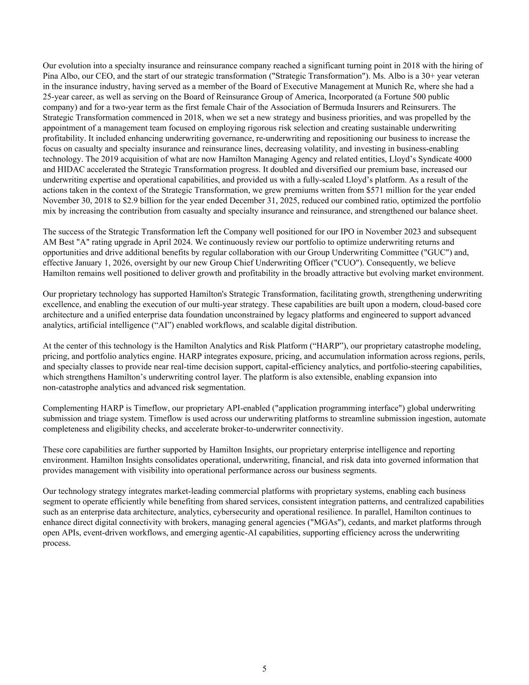Our evolution into a specialty insurance and reinsurance company reached a significant turning point in 2018 with the hiring of Pina Albo, our CEO, and the start of our strategic transformation ("Strategic Transformation"). Ms. Albo is a 30+ year veteran in the insurance industry, having served as a member of the Board of Executive Management at Munich Re, where she had a 25-year career, as well as serving on the Board of Reinsurance Group of America, Incorporated (a Fortune 500 public company) and for a two-year term as the first female Chair of the Association of Bermuda Insurers and Reinsurers. The Strategic Transformation commenced in 2018, when we set a new strategy and business priorities, and was propelled by the appointment of a management team focused on employing rigorous risk selection and creating sustainable underwriting profitability. It included enhancing underwriting governance, re-underwriting and repositioning our business to increase the focus on casualty and specialty insurance and reinsurance lines, decreasing volatility, and investing in business-enabling technology. The 2019 acquisition of what are now Hamilton Managing Agency and related entities, Lloyd’s Syndicate 4000 and HIDAC accelerated the Strategic Transformation progress. It doubled and diversified our premium base, increased our underwriting expertise and operational capabilities, and provided us with a fully-scaled Lloyd’s platform. As a result of the actions taken in the context of the Strategic Transformation, we grew premiums written from $571 million for the year ended November 30, 2018 to $2.9 billion for the year ended December 31, 2025, reduced our combined ratio, optimized the portfolio mix by increasing the contribution from casualty and specialty insurance and reinsurance, and strengthened our balance sheet. The success of the Strategic Transformation left the Company well positioned for our IPO in November 2023 and subsequent AM Best "A" rating upgrade in April 2024. We continuously review our portfolio to optimize underwriting returns and opportunities and drive additional benefits by regular collaboration with our Group Underwriting Committee ("GUC") and, effective January 1, 2026, oversight by our new Group Chief Underwriting Officer ("CUO"). Consequently, we believe Hamilton remains well positioned to deliver growth and profitability in the broadly attractive but evolving market environment. Our proprietary technology has supported Hamilton's Strategic Transformation, facilitating growth, strengthening underwriting excellence, and enabling the execution of our multi-year strategy. These capabilities are built upon a modern, cloud-based core architecture and a unified enterprise data foundation unconstrained by legacy platforms and engineered to support advanced analytics, artificial intelligence (“AI”) enabled workflows, and scalable digital distribution. At the center of this technology is the Hamilton Analytics and Risk Platform (“HARP”), our proprietary catastrophe modeling, pricing, and portfolio analytics engine. HARP integrates exposure, pricing, and accumulation information across regions, perils, and specialty classes to provide near real-time decision support, capital-efficiency analytics, and portfolio-steering capabilities, which strengthens Hamilton’s underwriting control layer. The platform is also extensible, enabling expansion into non-catastrophe analytics and advanced risk segmentation. Complementing HARP is Timeflow, our proprietary API-enabled ("application programming interface") global underwriting submission and triage system. Timeflow is used across our underwriting platforms to streamline submission ingestion, automate completeness and eligibility checks, and accelerate broker-to-underwriter connectivity. These core capabilities are further supported by Hamilton Insights, our proprietary enterprise intelligence and reporting environment. Hamilton Insights consolidates operational, underwriting, financial, and risk data into governed information that provides management with visibility into operational performance across our business segments. Our technology strategy integrates market-leading commercial platforms with proprietary systems, enabling each business segment to operate efficiently while benefiting from shared services, consistent integration patterns, and centralized capabilities such as an enterprise data architecture, analytics, cybersecurity and operational resilience. In parallel, Hamilton continues to enhance direct digital connectivity with brokers, managing general agencies ("MGAs"), cedants, and market platforms through open APIs, event-driven workflows, and emerging agentic-AI capabilities, supporting efficiency across the underwriting process. 5