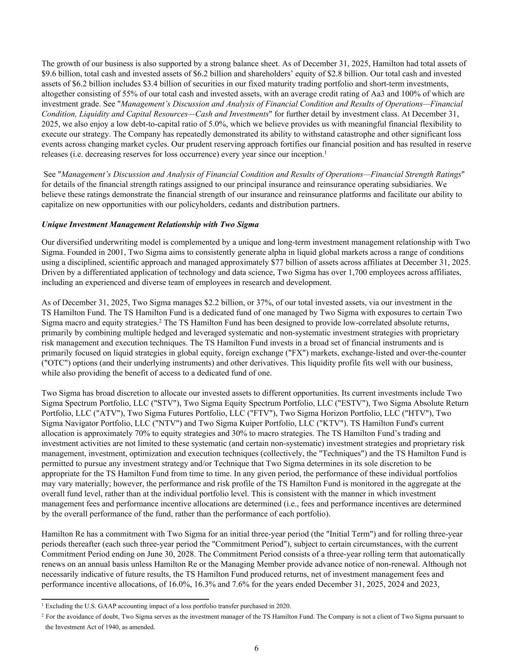 The growth of our business is also supported by a strong balance sheet. As of December 31, 2025, Hamilton had total assets of $9.6 billion, total cash and invested assets of $6.2 billion and shareholders’ equity of $2.8 billion. Our total cash and invested assets of $6.2 billion includes $3.4 billion of securities in our fixed maturity trading portfolio and short-term investments, altogether consisting of 55% of our total cash and invested assets, with an average credit rating of Aa3 and 100% of which are investment grade. See "Management’s Discussion and Analysis of Financial Condition and Results of Operations—Financial Condition, Liquidity and Capital Resources—Cash and Investments" for further detail by investment class. At December 31, 2025, we also enjoy a low debt-to-capital ratio of 5.0%, which we believe provides us with meaningful financial flexibility to execute our strategy. The Company has repeatedly demonstrated its ability to withstand catastrophe and other significant loss events across changing market cycles. Our prudent reserving approach fortifies our financial position and has resulted in reserve releases (i.e. decreasing reserves for loss occurrence) every year since our inception.1 See "Management’s Discussion and Analysis of Financial Condition and Results of Operations—Financial Strength Ratings" for details of the financial strength ratings assigned to our principal insurance and reinsurance operating subsidiaries. We believe these ratings demonstrate the financial strength of our insurance and reinsurance platforms and facilitate our ability to capitalize on new opportunities with our policyholders, cedants and distribution partners. Unique Investment Management Relationship with Two Sigma Our diversified underwriting model is complemented by a unique and long-term investment management relationship with Two Sigma. Founded in 2001, Two Sigma aims to consistently generate alpha in liquid global markets across a range of conditions using a disciplined, scientific approach and managed approximately $77 billion of assets across affiliates at December 31, 2025. Driven by a differentiated application of technology and data science, Two Sigma has over 1,700 employees across affiliates, including an experienced and diverse team of employees in research and development. As of December 31, 2025, Two Sigma manages $2.2 billion, or 37%, of our total invested assets, via our investment in the TS Hamilton Fund. The TS Hamilton Fund is a dedicated fund of one managed by Two Sigma with exposures to certain Two Sigma macro and equity strategies.2 The TS Hamilton Fund has been designed to provide low-correlated absolute returns, primarily by combining multiple hedged and leveraged systematic and non-systematic investment strategies with proprietary risk management and execution techniques. The TS Hamilton Fund invests in a broad set of financial instruments and is primarily focused on liquid strategies in global equity, foreign exchange ("FX") markets, exchange-listed and over-the-counter ("OTC") options (and their underlying instruments) and other derivatives. This liquidity profile fits well with our business, while also providing the benefit of access to a dedicated fund of one. Two Sigma has broad discretion to allocate our invested assets to different opportunities. Its current investments include Two Sigma Spectrum Portfolio, LLC ("STV"), Two Sigma Equity Spectrum Portfolio, LLC ("ESTV"), Two Sigma Absolute Return Portfolio, LLC ("ATV"), Two Sigma Futures Portfolio, LLC ("FTV"), Two Sigma Horizon Portfolio, LLC ("HTV"), Two Sigma Navigator Portfolio, LLC ("NTV") and Two Sigma Kuiper Portfolio, LLC ("KTV"). TS Hamilton Fund's current allocation is approximately 70% to equity strategies and 30% to macro strategies. The TS Hamilton Fund’s trading and investment activities are not limited to these systematic (and certain non-systematic) investment strategies and proprietary risk management, investment, optimization and execution techniques (collectively, the "Techniques") and the TS Hamilton Fund is permitted to pursue any investment strategy and/or Technique that Two Sigma determines in its sole discretion to be appropriate for the TS Hamilton Fund from time to time. In any given period, the performance of these individual portfolios may vary materially; however, the performance and risk profile of the TS Hamilton Fund is monitored in the aggregate at the overall fund level, rather than at the individual portfolio level. This is consistent with the manner in which investment management fees and performance incentive allocations are determined (i.e., fees and performance incentives are determined by the overall performance of the fund, rather than the performance of each portfolio). Hamilton Re has a commitment with Two Sigma for an initial three-year period (the "Initial Term") and for rolling three-year periods thereafter (each such three-year period the "Commitment Period"), subject to certain circumstances, with the current Commitment Period ending on June 30, 2028. The Commitment Period consists of a three-year rolling term that automatically renews on an annual basis unless Hamilton Re or the Managing Member provide advance notice of non-renewal. Although not necessarily indicative of future results, the TS Hamilton Fund produced returns, net of investment management fees and performance incentive allocations, of 16.0%, 16.3% and 7.6% for the years ended December 31, 2025, 2024 and 2023, 6 1 Excluding the U.S. GAAP accounting impact of a loss portfolio transfer purchased in 2020. 2 For the avoidance of doubt, Two Sigma serves as the investment manager of the TS Hamilton Fund. The Company is not a client of Two Sigma pursuant to the Investment Act of 1940, as amended.