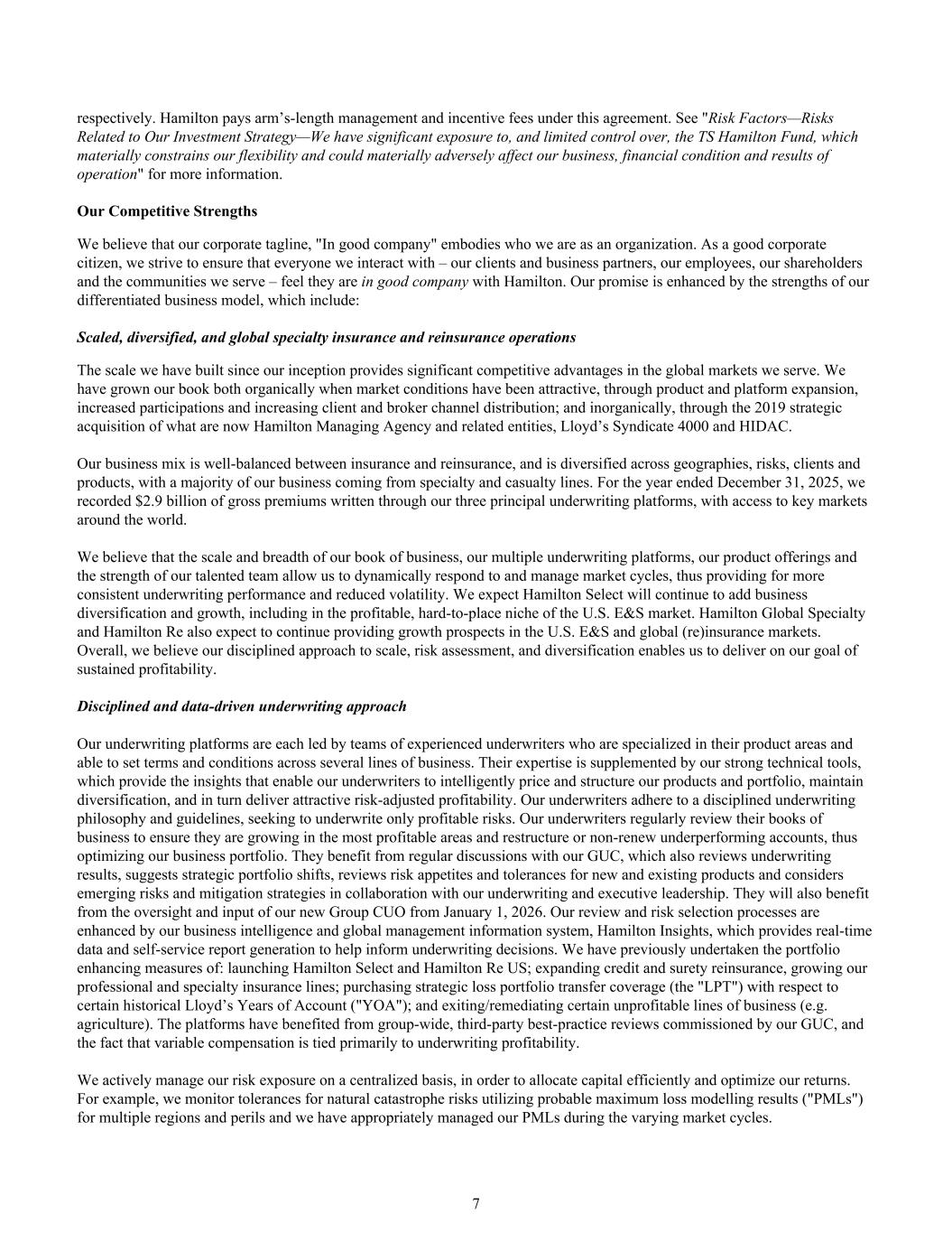 respectively. Hamilton pays arm’s-length management and incentive fees under this agreement. See "Risk Factors—Risks Related to Our Investment Strategy—We have significant exposure to, and limited control over, the TS Hamilton Fund, which materially constrains our flexibility and could materially adversely affect our business, financial condition and results of operation" for more information. Our Competitive Strengths We believe that our corporate tagline, "In good company" embodies who we are as an organization. As a good corporate citizen, we strive to ensure that everyone we interact with – our clients and business partners, our employees, our shareholders and the communities we serve – feel they are in good company with Hamilton. Our promise is enhanced by the strengths of our differentiated business model, which include: Scaled, diversified, and global specialty insurance and reinsurance operations The scale we have built since our inception provides significant competitive advantages in the global markets we serve. We have grown our book both organically when market conditions have been attractive, through product and platform expansion, increased participations and increasing client and broker channel distribution; and inorganically, through the 2019 strategic acquisition of what are now Hamilton Managing Agency and related entities, Lloyd’s Syndicate 4000 and HIDAC. Our business mix is well-balanced between insurance and reinsurance, and is diversified across geographies, risks, clients and products, with a majority of our business coming from specialty and casualty lines. For the year ended December 31, 2025, we recorded $2.9 billion of gross premiums written through our three principal underwriting platforms, with access to key markets around the world. We believe that the scale and breadth of our book of business, our multiple underwriting platforms, our product offerings and the strength of our talented team allow us to dynamically respond to and manage market cycles, thus providing for more consistent underwriting performance and reduced volatility. We expect Hamilton Select will continue to add business diversification and growth, including in the profitable, hard-to-place niche of the U.S. E&S market. Hamilton Global Specialty and Hamilton Re also expect to continue providing growth prospects in the U.S. E&S and global (re)insurance markets. Overall, we believe our disciplined approach to scale, risk assessment, and diversification enables us to deliver on our goal of sustained profitability. Disciplined and data-driven underwriting approach Our underwriting platforms are each led by teams of experienced underwriters who are specialized in their product areas and able to set terms and conditions across several lines of business. Their expertise is supplemented by our strong technical tools, which provide the insights that enable our underwriters to intelligently price and structure our products and portfolio, maintain diversification, and in turn deliver attractive risk-adjusted profitability. Our underwriters adhere to a disciplined underwriting philosophy and guidelines, seeking to underwrite only profitable risks. Our underwriters regularly review their books of business to ensure they are growing in the most profitable areas and restructure or non-renew underperforming accounts, thus optimizing our business portfolio. They benefit from regular discussions with our GUC, which also reviews underwriting results, suggests strategic portfolio shifts, reviews risk appetites and tolerances for new and existing products and considers emerging risks and mitigation strategies in collaboration with our underwriting and executive leadership. They will also benefit from the oversight and input of our new Group CUO from January 1, 2026. Our review and risk selection processes are enhanced by our business intelligence and global management information system, Hamilton Insights, which provides real-time data and self-service report generation to help inform underwriting decisions. We have previously undertaken the portfolio enhancing measures of: launching Hamilton Select and Hamilton Re US; expanding credit and surety reinsurance, growing our professional and specialty insurance lines; purchasing strategic loss portfolio transfer coverage (the "LPT") with respect to certain historical Lloyd’s Years of Account ("YOA"); and exiting/remediating certain unprofitable lines of business (e.g. agriculture). The platforms have benefited from group-wide, third-party best-practice reviews commissioned by our GUC, and the fact that variable compensation is tied primarily to underwriting profitability. We actively manage our risk exposure on a centralized basis, in order to allocate capital efficiently and optimize our returns. For example, we monitor tolerances for natural catastrophe risks utilizing probable maximum loss modelling results ("PMLs") for multiple regions and perils and we have appropriately managed our PMLs during the varying market cycles. 7