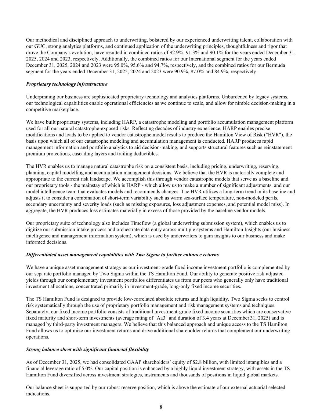 Our methodical and disciplined approach to underwriting, bolstered by our experienced underwriting talent, collaboration with our GUC, strong analytics platforms, and continued application of the underwriting principles, thoughtfulness and rigor that drove the Company's evolution, have resulted in combined ratios of 92.9%, 91.3% and 90.1% for the years ended December 31, 2025, 2024 and 2023, respectively. Additionally, the combined ratios for our International segment for the years ended December 31, 2025, 2024 and 2023 were 95.0%, 95.6% and 94.7%, respectively, and the combined ratios for our Bermuda segment for the years ended December 31, 2025, 2024 and 2023 were 90.9%, 87.0% and 84.9%, respectively. Proprietary technology infrastructure Underpinning our business are sophisticated proprietary technology and analytics platforms. Unburdened by legacy systems, our technological capabilities enable operational efficiencies as we continue to scale, and allow for nimble decision-making in a competitive marketplace. We have built proprietary systems, including HARP, a catastrophe modeling and portfolio accumulation management platform used for all our natural catastrophe-exposed risks. Reflecting decades of industry experience, HARP enables precise modifications and loads to be applied to vendor catastrophe model results to produce the Hamilton View of Risk ("HVR"), the basis upon which all of our catastrophe modeling and accumulation management is conducted. HARP produces rapid management information and portfolio analytics to aid decision-making, and supports structural features such as reinstatement premium protections, cascading layers and trailing deductibles. The HVR enables us to manage natural catastrophe risk on a consistent basis, including pricing, underwriting, reserving, planning, capital modelling and accumulation management decisions. We believe that the HVR is materially complete and appropriate to the current risk landscape. We accomplish this through vendor catastrophe models that serve as a baseline and our proprietary tools - the mainstay of which is HARP - which allow us to make a number of significant adjustments, and our model intelligence team that evaluates models and recommends changes. The HVR utilizes a long-term trend in its baseline and adjusts it to consider a combination of short-term variability such as warm sea-surface temperature, non-modeled perils, secondary uncertainty and severity loads (such as missing exposures, loss adjustment expenses, and potential model miss). In aggregate, the HVR produces loss estimates materially in excess of those provided by the baseline vendor models. Our proprietary suite of technology also includes Timeflow (a global underwriting submission system), which enables us to digitize our submission intake process and orchestrate data entry across multiple systems and Hamilton Insights (our business intelligence and management information system), which is used by underwriters to gain insights to our business and make informed decisions. Differentiated asset management capabilities with Two Sigma to further enhance returns We have a unique asset management strategy as our investment-grade fixed income investment portfolio is complemented by our separate portfolio managed by Two Sigma within the TS Hamilton Fund. Our ability to generate positive risk-adjusted yields through our complementary investment portfolios differentiates us from our peers who generally only have traditional investment allocations, concentrated primarily in investment-grade, long-only fixed income securities. The TS Hamilton Fund is designed to provide low-correlated absolute returns and high liquidity. Two Sigma seeks to control risk systematically through the use of proprietary portfolio management and risk management systems and techniques. Separately, our fixed income portfolio consists of traditional investment-grade fixed income securities which are conservative fixed maturity and short-term investments (average rating of "Aa3" and duration of 3.4 years at December 31, 2025) and is managed by third-party investment managers. We believe that this balanced approach and unique access to the TS Hamilton Fund allows us to optimize our investment returns and drive additional shareholder returns that complement our underwriting operations. Strong balance sheet with significant financial flexibility As of December 31, 2025, we had consolidated GAAP shareholders’ equity of $2.8 billion, with limited intangibles and a financial leverage ratio of 5.0%. Our capital position is enhanced by a highly liquid investment strategy, with assets in the TS Hamilton Fund diversified across investment strategies, instruments and thousands of positions in liquid global markets. Our balance sheet is supported by our robust reserve position, which is above the estimate of our external actuarial selected indications. 8