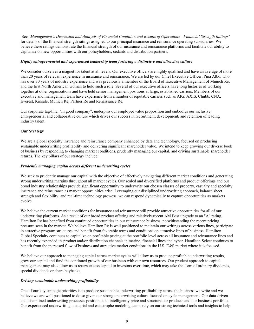 See "Management’s Discussion and Analysis of Financial Condition and Results of Operations—Financial Strength Ratings" for details of the financial strength ratings assigned to our principal insurance and reinsurance operating subsidiaries. We believe these ratings demonstrate the financial strength of our insurance and reinsurance platforms and facilitate our ability to capitalize on new opportunities with our policyholders, cedants and distribution partners. Highly entrepreneurial and experienced leadership team fostering a distinctive and attractive culture We consider ourselves a magnet for talent at all levels. Our executive officers are highly qualified and have an average of more than 20 years of relevant experience in insurance and reinsurance. We are led by our Chief Executive Officer, Pina Albo, who has over 30 years of industry experience and was previously a member of the Board of Executive Management of Munich Re, and the first North American woman to hold such a role. Several of our executive officers have long histories of working together at other organizations and have held senior management positions at large, established carriers. Members of our executive and management team have experience from a number of reputable carriers such as AIG, AXIS, Chubb, CNA, Everest, Kinsale, Munich Re, Partner Re and Renaissance Re. Our corporate tag-line, "In good company", underpins our employee value proposition and embodies our inclusive, entrepreneurial and collaborative culture which drives our success in recruitment, development, and retention of leading industry talent. Our Strategy We are a global specialty insurance and reinsurance company enhanced by data and technology, focused on producing sustainable underwriting profitability and delivering significant shareholder value. We intend to keep growing our diverse book of business by responding to changing market conditions, prudently managing our capital, and driving sustainable shareholder returns. The key pillars of our strategy include: Prudently managing capital across different underwriting cycles We seek to prudently manage our capital with the objective of effectively navigating different market conditions and generating strong underwriting margins throughout all market cycles. Our scaled and diversified platforms and product offerings and our broad industry relationships provide significant opportunity to underwrite our chosen classes of property, casualty and specialty insurance and reinsurance as market opportunities arise. Leveraging our disciplined underwriting approach, balance sheet strength and flexibility, and real-time technology prowess, we can respond dynamically to capture opportunities as markets evolve. We believe the current market conditions for insurance and reinsurance still provide attractive opportunities for all of our underwriting platforms. As a result of our broad product offering and relatively recent AM Best upgrade to an "A" rating, Hamilton Re has benefited from continued opportunities in our reinsurance business, notwithstanding the recent pricing pressure seen in the market. We believe Hamilton Re is well positioned to maintain our writings across various lines, participate in attractive program structures and benefit from favorable terms and conditions on attractive lines of business. Hamilton Global Specialty continues to capitalize on profitable pricing at the portfolio level across all insurance and reinsurance lines and has recently expanded its product and/or distribution channels in marine, financial lines and cyber. Hamilton Select continues to benefit from the increased flow of business and attractive market conditions in the U.S. E&S market where it is focused. We believe our approach to managing capital across market cycles will allow us to produce profitable underwriting results, grow our capital and fund the continued growth of our business with our own resources. Our prudent approach to capital management may also allow us to return excess capital to investors over time, which may take the form of ordinary dividends, special dividends or share buybacks. Driving sustainable underwriting profitability One of our key strategic priorities is to produce sustainable underwriting profitability across the business we write and we believe we are well positioned to do so given our strong underwriting culture focused on cycle management. Our data-driven and disciplined underwriting processes position us to intelligently price and structure our products and our business portfolio. Our experienced underwriting, actuarial and catastrophe modeling teams rely on our strong technical tools and insights to help 9