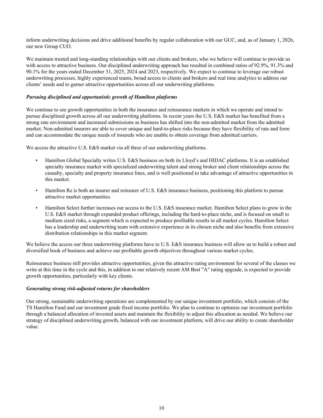 inform underwriting decisions and drive additional benefits by regular collaboration with our GUC, and, as of January 1, 2026, our new Group CUO. We maintain trusted and long-standing relationships with our clients and brokers, who we believe will continue to provide us with access to attractive business. Our disciplined underwriting approach has resulted in combined ratios of 92.9%, 91.3% and 90.1% for the years ended December 31, 2025, 2024 and 2023, respectively. We expect to continue to leverage our robust underwriting processes, highly experienced teams, broad access to clients and brokers and real time analytics to address our clients’ needs and to garner attractive opportunities across all our underwriting platforms. Pursuing disciplined and opportunistic growth of Hamilton platforms We continue to see growth opportunities in both the insurance and reinsurance markets in which we operate and intend to pursue disciplined growth across all our underwriting platforms. In recent years the U.S. E&S market has benefited from a strong rate environment and increased submissions as business has shifted into the non-admitted market from the admitted market. Non-admitted insurers are able to cover unique and hard-to-place risks because they have flexibility of rate and form and can accommodate the unique needs of insureds who are unable to obtain coverage from admitted carriers. We access the attractive U.S. E&S market via all three of our underwriting platforms. • Hamilton Global Specialty writes U.S. E&S business on both its Lloyd’s and HIDAC platforms. It is an established specialty insurance market with specialized underwriting talent and strong broker and client relationships across the casualty, specialty and property insurance lines, and is well positioned to take advantage of attractive opportunities in this market. • Hamilton Re is both an insurer and reinsurer of U.S. E&S insurance business, positioning this platform to pursue attractive market opportunities. • Hamilton Select further increases our access to the U.S. E&S insurance market. Hamilton Select plans to grow in the U.S. E&S market through expanded product offerings, including the hard-to-place niche, and is focused on small to medium sized risks, a segment which is expected to produce profitable results in all market cycles. Hamilton Select has a leadership and underwriting team with extensive experience in its chosen niche and also benefits from extensive distribution relationships in this market segment. We believe the access our three underwriting platforms have to U.S. E&S insurance business will allow us to build a robust and diversified book of business and achieve our profitable growth objectives throughout various market cycles. Reinsurance business still provides attractive opportunities, given the attractive rating environment for several of the classes we write at this time in the cycle and this, in addition to our relatively recent AM Best "A" rating upgrade, is expected to provide growth opportunities, particularly with key clients. Generating strong risk-adjusted returns for shareholders Our strong, sustainable underwriting operations are complemented by our unique investment portfolio, which consists of the TS Hamilton Fund and our investment grade fixed income portfolio. We plan to continue to optimize our investment portfolio through a balanced allocation of invested assets and maintain the flexibility to adjust this allocation as needed. We believe our strategy of disciplined underwriting growth, balanced with our investment platform, will drive our ability to create shareholder value. 10