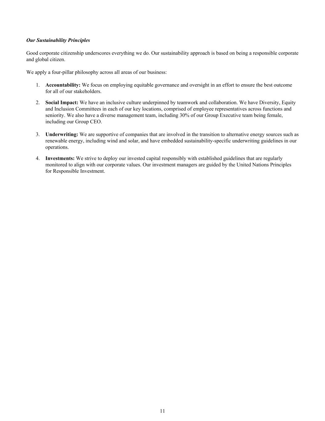 Our Sustainability Principles Good corporate citizenship underscores everything we do. Our sustainability approach is based on being a responsible corporate and global citizen. We apply a four-pillar philosophy across all areas of our business: 1. Accountability: We focus on employing equitable governance and oversight in an effort to ensure the best outcome for all of our stakeholders. 2. Social Impact: We have an inclusive culture underpinned by teamwork and collaboration. We have Diversity, Equity and Inclusion Committees in each of our key locations, comprised of employee representatives across functions and seniority. We also have a diverse management team, including 30% of our Group Executive team being female, including our Group CEO. 3. Underwriting: We are supportive of companies that are involved in the transition to alternative energy sources such as renewable energy, including wind and solar, and have embedded sustainability-specific underwriting guidelines in our operations. 4. Investments: We strive to deploy our invested capital responsibly with established guidelines that are regularly monitored to align with our corporate values. Our investment managers are guided by the United Nations Principles for Responsible Investment. 11