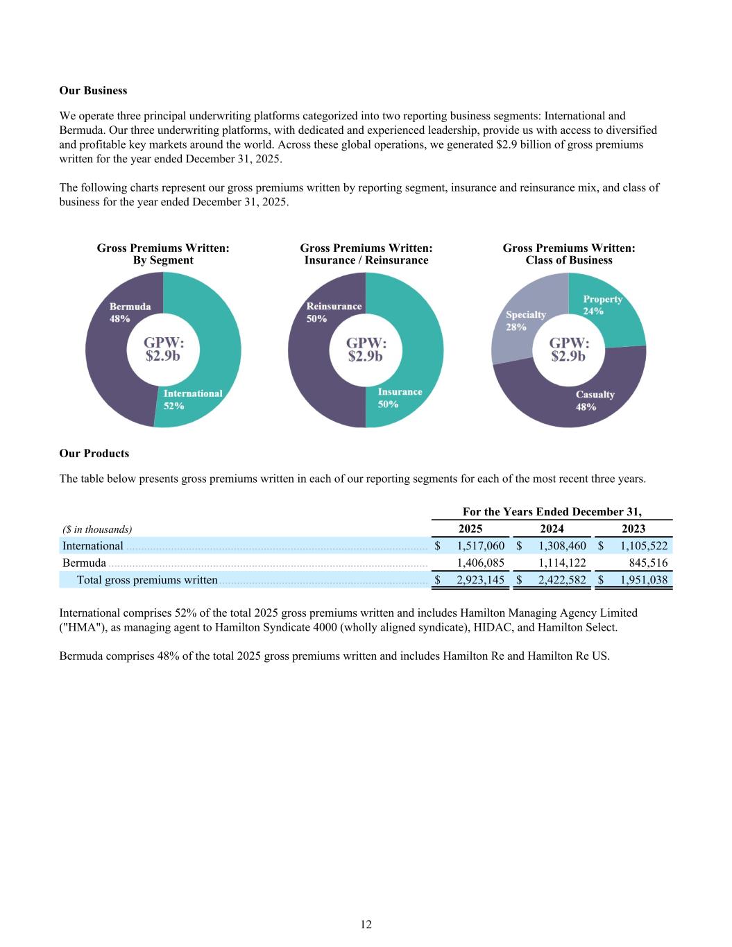 Our Business We operate three principal underwriting platforms categorized into two reporting business segments: International and Bermuda. Our three underwriting platforms, with dedicated and experienced leadership, provide us with access to diversified and profitable key markets around the world. Across these global operations, we generated $2.9 billion of gross premiums written for the year ended December 31, 2025. The following charts represent our gross premiums written by reporting segment, insurance and reinsurance mix, and class of business for the year ended December 31, 2025. Gross Premiums Written: By Segment Gross Premiums Written: Insurance / Reinsurance Gross Premiums Written: Class of Business Our Products The table below presents gross premiums written in each of our reporting segments for each of the most recent three years. For the Years Ended December 31, ($ in thousands) 2025 2024 2023 International ..................................................................................................... $ 1,517,060 $ 1,308,460 $ 1,105,522 Bermuda ........................................................................................................... 1,406,085 1,114,122 845,516 Total gross premiums written ...................................................................... $ 2,923,145 $ 2,422,582 $ 1,951,038 International comprises 52% of the total 2025 gross premiums written and includes Hamilton Managing Agency Limited ("HMA"), as managing agent to Hamilton Syndicate 4000 (wholly aligned syndicate), HIDAC, and Hamilton Select. Bermuda comprises 48% of the total 2025 gross premiums written and includes Hamilton Re and Hamilton Re US. 12