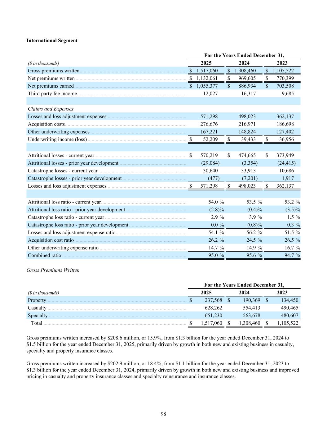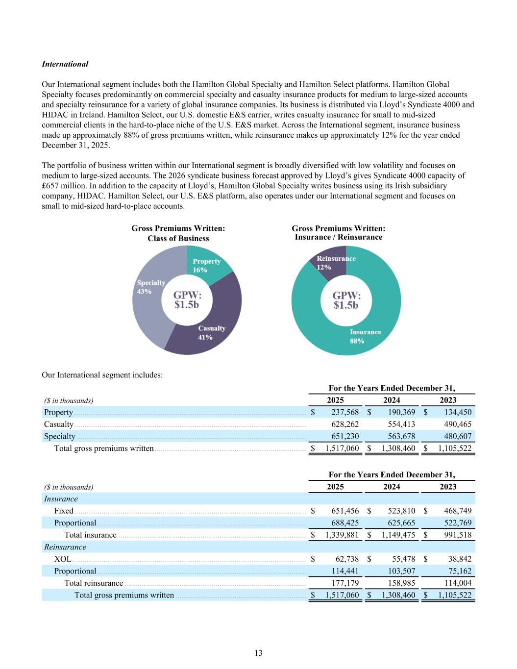 International Our International segment includes both the Hamilton Global Specialty and Hamilton Select platforms. Hamilton Global Specialty focuses predominantly on commercial specialty and casualty insurance products for medium to large-sized accounts and specialty reinsurance for a variety of global insurance companies. Its business is distributed via Lloyd’s Syndicate 4000 and HIDAC in Ireland. Hamilton Select, our U.S. domestic E&S carrier, writes casualty insurance for small to mid-sized commercial clients in the hard-to-place niche of the U.S. E&S market. Across the International segment, insurance business made up approximately 88% of gross premiums written, while reinsurance makes up approximately 12% for the year ended December 31, 2025. The portfolio of business written within our International segment is broadly diversified with low volatility and focuses on medium to large-sized accounts. The 2026 syndicate business forecast approved by Lloyd’s gives Syndicate 4000 capacity of £657 million. In addition to the capacity at Lloyd’s, Hamilton Global Specialty writes business using its Irish subsidiary company, HIDAC. Hamilton Select, our U.S. E&S platform, also operates under our International segment and focuses on small to mid-sized hard-to-place accounts. Gross Premiums Written: Class of Business Gross Premiums Written: Insurance / Reinsurance Our International segment includes: For the Years Ended December 31, ($ in thousands) 2025 2024 2023 Property .............................................................................................................. $ 237,568 $ 190,369 $ 134,450 Casualty .............................................................................................................. 628,262 554,413 490,465 Specialty ............................................................................................................. 651,230 563,678 480,607 Total gross premiums written ........................................................................ $ 1,517,060 $ 1,308,460 $ 1,105,522 For the Years Ended December 31, ($ in thousands) 2025 2024 2023 Insurance Fixed .............................................................................................................. $ 651,456 $ 523,810 $ 468,749 Proportional ................................................................................................... 688,425 625,665 522,769 Total insurance ......................................................................................... $ 1,339,881 $ 1,149,475 $ 991,518 Reinsurance XOL ............................................................................................................... $ 62,738 $ 55,478 $ 38,842 Proportional ................................................................................................... 114,441 103,507 75,162 Total reinsurance ...................................................................................... 177,179 158,985 114,004 Total gross premiums written .............................................................. $ 1,517,060 $ 1,308,460 $ 1,105,522 13