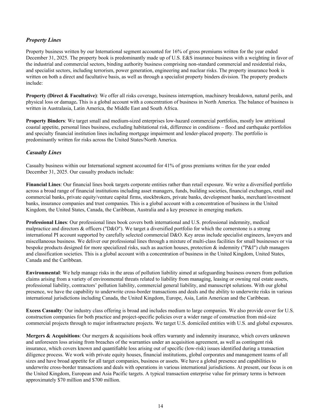 Property Lines Property business written by our International segment accounted for 16% of gross premiums written for the year ended December 31, 2025. The property book is predominantly made up of U.S. E&S insurance business with a weighting in favor of the industrial and commercial sectors, binding authority business comprising non-standard commercial and residential risks, and specialist sectors, including terrorism, power generation, engineering and nuclear risks. The property insurance book is written on both a direct and facultative basis, as well as through a specialist property binders division. The property products include: Property (Direct & Facultative): We offer all risks coverage, business interruption, machinery breakdown, natural perils, and physical loss or damage. This is a global account with a concentration of business in North America. The balance of business is written in Australasia, Latin America, the Middle East and South Africa. Property Binders: We target small and medium-sized enterprises low-hazard commercial portfolios, mostly low attritional coastal appetite, personal lines business, excluding habitational risk, difference in conditions – flood and earthquake portfolios and specialty financial institution lines including mortgage impairment and lender-placed property. The portfolio is predominantly written for risks across the United States/North America. Casualty Lines Casualty business within our International segment accounted for 41% of gross premiums written for the year ended December 31, 2025. Our casualty products include: Financial Lines: Our financial lines book targets corporate entities rather than retail exposure. We write a diversified portfolio across a broad range of financial institutions including asset managers, funds, building societies, financial exchanges, retail and commercial banks, private equity/venture capital firms, stockbrokers, private banks, development banks, merchant/investment banks, insurance companies and trust companies. This is a global account with a concentration of business in the United Kingdom, the United States, Canada, the Caribbean, Australia and a key presence in emerging markets. Professional Lines: Our professional lines book covers both international and U.S. professional indemnity, medical malpractice and directors & officers ("D&O"). We target a diversified portfolio for which the cornerstone is a strong international PI account supported by carefully selected commercial D&O. Key areas include specialist engineers, lawyers and miscellaneous business. We deliver our professional lines through a mixture of multi-class facilities for small businesses or via bespoke products designed for more specialized risks, such as auction houses, protection & indemnity ("P&I") club managers and classification societies. This is a global account with a concentration of business in the United Kingdom, United States, Canada and the Caribbean. Environmental: We help manage risks in the areas of pollution liability aimed at safeguarding business owners from pollution claims arising from a variety of environmental threats related to liability from managing, leasing or owning real estate assets, professional liability, contractors’ pollution liability, commercial general liability, and manuscript solutions. With our global presence, we have the capability to underwrite cross-border transactions and deals and the ability to underwrite risks in various international jurisdictions including Canada, the United Kingdom, Europe, Asia, Latin American and the Caribbean. Excess Casualty: Our industry class offering is broad and includes medium to large companies. We also provide cover for U.S. construction companies for both practice and project-specific policies over a wider range of construction from mid-size commercial projects through to major infrastructure projects. We target U.S. domiciled entities with U.S. and global exposures. Mergers & Acquisitions: Our mergers & acquisitions book offers warranty and indemnity insurance, which covers unknown and unforeseen loss arising from breaches of the warranties under an acquisition agreement, as well as contingent risk insurance, which covers known and quantifiable loss arising out of specific (low-risk) issues identified during a transaction diligence process. We work with private equity houses, financial institutions, global corporates and management teams of all sizes and have broad appetite for all target companies, business or assets. We have a global presence and capabilities to underwrite cross-border transactions and deals with operations in various international jurisdictions. At present, our focus is on the United Kingdom, European and Asia Pacific targets. A typical transaction enterprise value for primary terms is between approximately $70 million and $700 million. 14