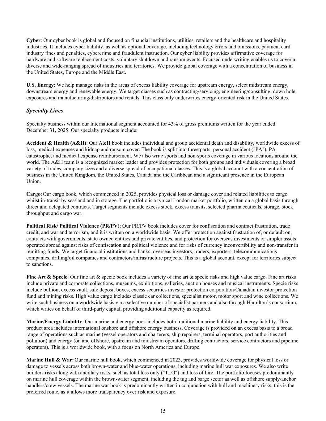 Cyber: Our cyber book is global and focused on financial institutions, utilities, retailers and the healthcare and hospitality industries. It includes cyber liability, as well as optional coverage, including technology errors and omissions, payment card industry fines and penalties, cybercrime and fraudulent instruction. Our cyber liability provides affirmative coverage for hardware and software replacement costs, voluntary shutdown and ransom events. Focused underwriting enables us to cover a diverse and wide-ranging spread of industries and territories. We provide global coverage with a concentration of business in the United States, Europe and the Middle East. U.S. Energy: We help manage risks in the areas of excess liability coverage for upstream energy, select midstream energy, downstream energy and renewable energy. We target classes such as contracting/servicing, engineering/consulting, down hole exposures and manufacturing/distributors and rentals. This class only underwrites energy-oriented risk in the United States. Specialty Lines Specialty business within our International segment accounted for 43% of gross premiums written for the year ended December 31, 2025. Our specialty products include: Accident & Health (A&H): Our A&H book includes individual and group accidental death and disability, worldwide excess of loss, medical expenses and kidnap and ransom cover. The book is split into three parts: personal accident ("PA"), PA catastrophe, and medical expense reimbursement. We also write sports and non-sports coverage in various locations around the world. The A&H team is a recognized market leader and provides protection for both groups and individuals covering a broad variety of trades, company sizes and a diverse spread of occupational classes. This is a global account with a concentration of business in the United Kingdom, the United States, Canada and the Caribbean and a significant presence in the European Union. Cargo: Our cargo book, which commenced in 2025, provides physical loss or damage cover and related liabilities to cargo whilst in-transit by sea/land and in storage. The portfolio is a typical London market portfolio, written on a global basis through direct and delegated contracts. Target segments include excess stock, excess transits, selected pharmaceuticals, storage, stock throughput and cargo war. Political Risk/ Political Violence (PR/PV): Our PR/PV book includes cover for confiscation and contract frustration, trade credit, and war and terrorism, and it is written on a worldwide basis. We offer protection against frustration of, or default on, contracts with governments, state-owned entities and private entities, and protection for overseas investments or simpler assets operated abroad against risks of confiscation and political violence and for risks of currency inconvertibility and non-transfer in remitting funds. We target financial institutions and banks, overseas investors, traders, exporters, telecommunications companies, drilling/oil companies and contractors/infrastructure projects. This is a global account, except for territories subject to sanctions. Fine Art & Specie: Our fine art & specie book includes a variety of fine art & specie risks and high value cargo. Fine art risks include private and corporate collections, museums, exhibitions, galleries, auction houses and musical instruments. Specie risks include bullion, excess vault, safe deposit boxes, excess securities investor protection corporation/Canadian investor protection fund and mining risks. High value cargo includes classic car collections, specialist motor, motor sport and wine collections. We write such business on a worldwide basis via a selective number of specialist partners and also through Hamilton’s consortium, which writes on behalf of third-party capital, providing additional capacity as required. Marine/Energy Liability: Our marine and energy book includes both traditional marine liability and energy liability. This product area includes international onshore and offshore energy business. Coverage is provided on an excess basis to a broad range of operations such as marine (vessel operators and charterers, ship repairers, terminal operators, port authorities and pollution) and energy (on and offshore, upstream and midstream operators, drilling contractors, service contractors and pipeline operators). This is a worldwide book, with a focus on North America and Europe. Marine Hull & War: Our marine hull book, which commenced in 2023, provides worldwide coverage for physical loss or damage to vessels across both brown-water and blue-water operations, including marine hull war exposures. We also write builders risks along with ancillary risks, such as total loss only ("TLO") and loss of hire. The portfolio focuses predominantly on marine hull coverage within the brown-water segment, including the tug and barge sector as well as offshore supply/anchor handlers/crew vessels. The marine war book is predominantly written in conjunction with hull and machinery risks; this is the preferred route, as it allows more transparency over risk and exposure. 15