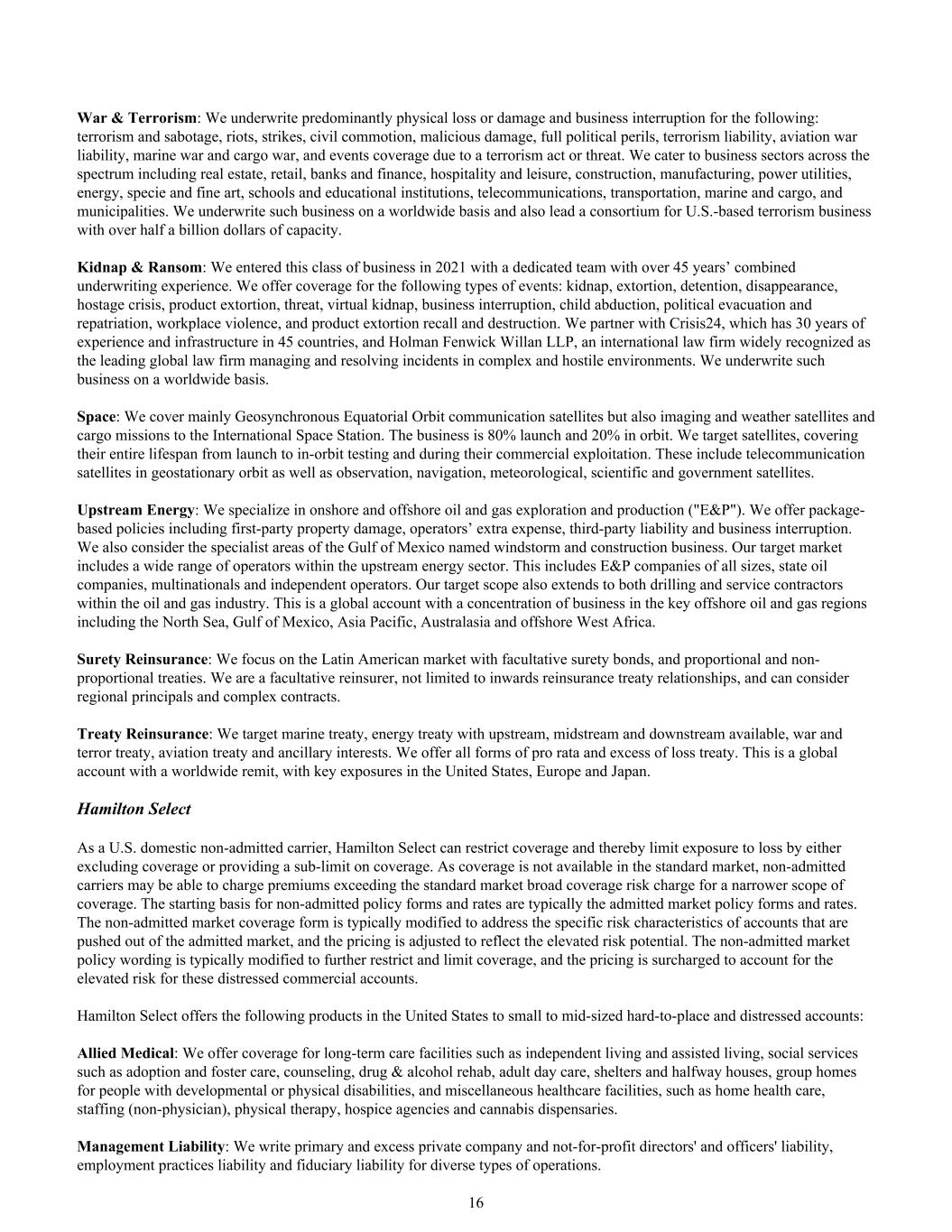 War & Terrorism: We underwrite predominantly physical loss or damage and business interruption for the following: terrorism and sabotage, riots, strikes, civil commotion, malicious damage, full political perils, terrorism liability, aviation war liability, marine war and cargo war, and events coverage due to a terrorism act or threat. We cater to business sectors across the spectrum including real estate, retail, banks and finance, hospitality and leisure, construction, manufacturing, power utilities, energy, specie and fine art, schools and educational institutions, telecommunications, transportation, marine and cargo, and municipalities. We underwrite such business on a worldwide basis and also lead a consortium for U.S.-based terrorism business with over half a billion dollars of capacity. Kidnap & Ransom: We entered this class of business in 2021 with a dedicated team with over 45 years’ combined underwriting experience. We offer coverage for the following types of events: kidnap, extortion, detention, disappearance, hostage crisis, product extortion, threat, virtual kidnap, business interruption, child abduction, political evacuation and repatriation, workplace violence, and product extortion recall and destruction. We partner with Crisis24, which has 30 years of experience and infrastructure in 45 countries, and Holman Fenwick Willan LLP, an international law firm widely recognized as the leading global law firm managing and resolving incidents in complex and hostile environments. We underwrite such business on a worldwide basis. Space: We cover mainly Geosynchronous Equatorial Orbit communication satellites but also imaging and weather satellites and cargo missions to the International Space Station. The business is 80% launch and 20% in orbit. We target satellites, covering their entire lifespan from launch to in-orbit testing and during their commercial exploitation. These include telecommunication satellites in geostationary orbit as well as observation, navigation, meteorological, scientific and government satellites. Upstream Energy: We specialize in onshore and offshore oil and gas exploration and production ("E&P"). We offer package- based policies including first-party property damage, operators’ extra expense, third-party liability and business interruption. We also consider the specialist areas of the Gulf of Mexico named windstorm and construction business. Our target market includes a wide range of operators within the upstream energy sector. This includes E&P companies of all sizes, state oil companies, multinationals and independent operators. Our target scope also extends to both drilling and service contractors within the oil and gas industry. This is a global account with a concentration of business in the key offshore oil and gas regions including the North Sea, Gulf of Mexico, Asia Pacific, Australasia and offshore West Africa. Surety Reinsurance: We focus on the Latin American market with facultative surety bonds, and proportional and non- proportional treaties. We are a facultative reinsurer, not limited to inwards reinsurance treaty relationships, and can consider regional principals and complex contracts. Treaty Reinsurance: We target marine treaty, energy treaty with upstream, midstream and downstream available, war and terror treaty, aviation treaty and ancillary interests. We offer all forms of pro rata and excess of loss treaty. This is a global account with a worldwide remit, with key exposures in the United States, Europe and Japan. Hamilton Select As a U.S. domestic non-admitted carrier, Hamilton Select can restrict coverage and thereby limit exposure to loss by either excluding coverage or providing a sub-limit on coverage. As coverage is not available in the standard market, non-admitted carriers may be able to charge premiums exceeding the standard market broad coverage risk charge for a narrower scope of coverage. The starting basis for non-admitted policy forms and rates are typically the admitted market policy forms and rates. The non-admitted market coverage form is typically modified to address the specific risk characteristics of accounts that are pushed out of the admitted market, and the pricing is adjusted to reflect the elevated risk potential. The non-admitted market policy wording is typically modified to further restrict and limit coverage, and the pricing is surcharged to account for the elevated risk for these distressed commercial accounts. Hamilton Select offers the following products in the United States to small to mid-sized hard-to-place and distressed accounts: Allied Medical: We offer coverage for long-term care facilities such as independent living and assisted living, social services such as adoption and foster care, counseling, drug & alcohol rehab, adult day care, shelters and halfway houses, group homes for people with developmental or physical disabilities, and miscellaneous healthcare facilities, such as home health care, staffing (non-physician), physical therapy, hospice agencies and cannabis dispensaries. Management Liability: We write primary and excess private company and not-for-profit directors' and officers' liability, employment practices liability and fiduciary liability for diverse types of operations. 16