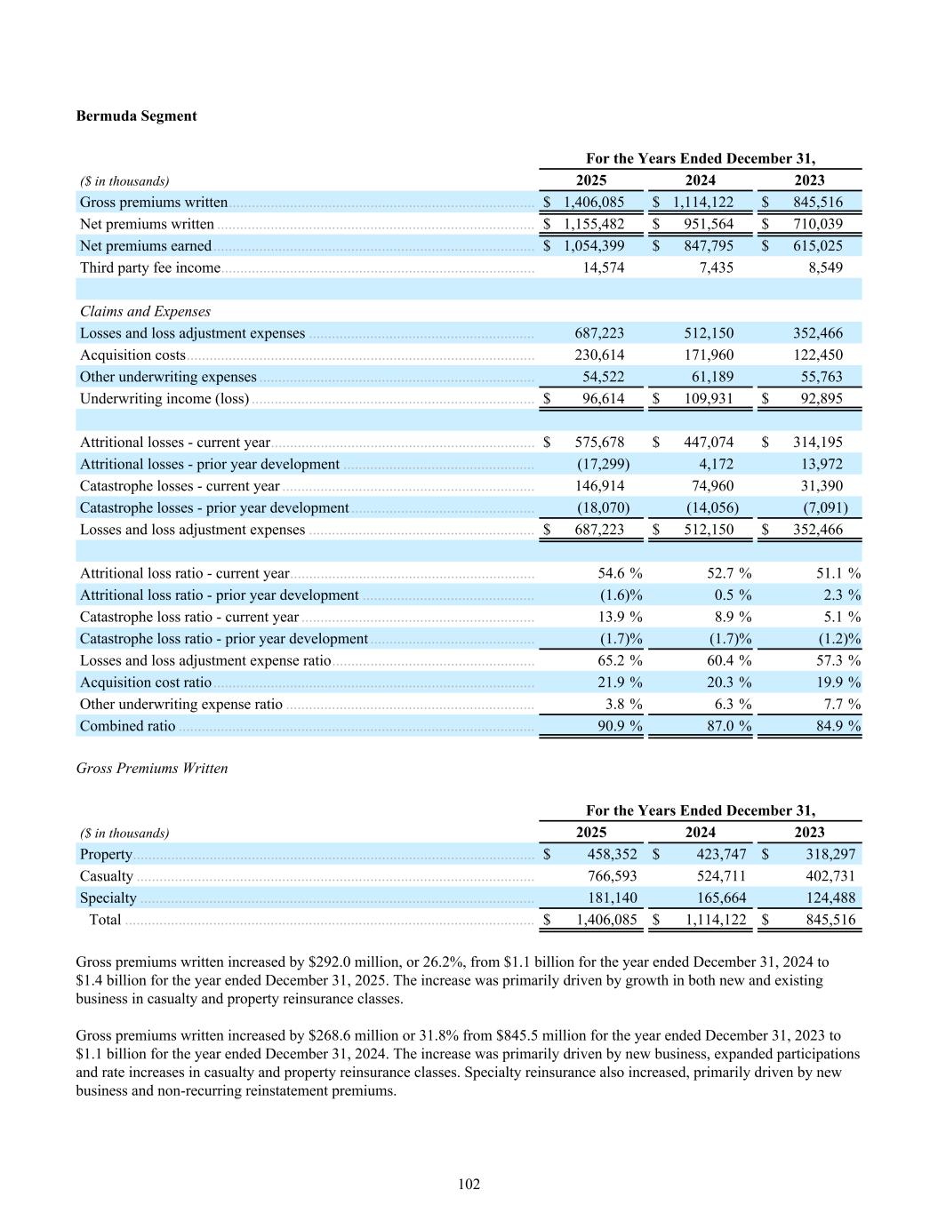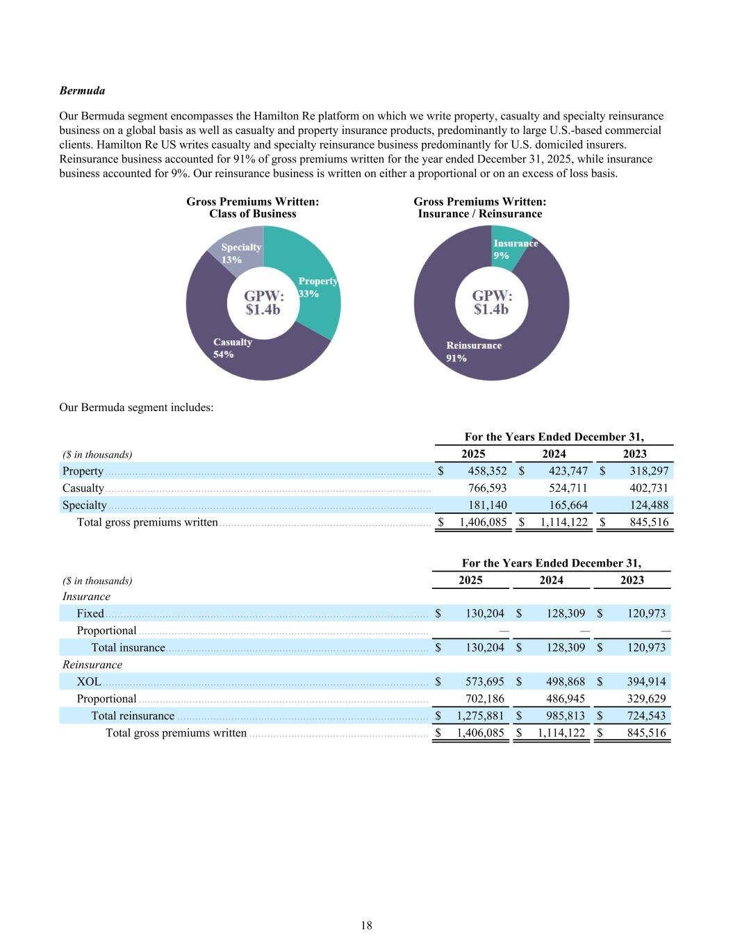 Bermuda Our Bermuda segment encompasses the Hamilton Re platform on which we write property, casualty and specialty reinsurance business on a global basis as well as casualty and property insurance products, predominantly to large U.S.-based commercial clients. Hamilton Re US writes casualty and specialty reinsurance business predominantly for U.S. domiciled insurers. Reinsurance business accounted for 91% of gross premiums written for the year ended December 31, 2025, while insurance business accounted for 9%. Our reinsurance business is written on either a proportional or on an excess of loss basis. Gross Premiums Written: Class of Business Gross Premiums Written: Insurance / Reinsurance Our Bermuda segment includes: For the Years Ended December 31, ($ in thousands) 2025 2024 2023 Property ............................................................................................................. $ 458,352 $ 423,747 $ 318,297 Casualty ............................................................................................................. 766,593 524,711 402,731 Specialty ............................................................................................................ 181,140 165,664 124,488 Total gross premiums written ....................................................................... $ 1,406,085 $ 1,114,122 $ 845,516 For the Years Ended December 31, ($ in thousands) 2025 2024 2023 Insurance Fixed ............................................................................................................ $ 130,204 $ 128,309 $ 120,973 Proportional ................................................................................................. — — — Total insurance ........................................................................................ $ 130,204 $ 128,309 $ 120,973 Reinsurance XOL ............................................................................................................. $ 573,695 $ 498,868 $ 394,914 Proportional ................................................................................................. 702,186 486,945 329,629 Total reinsurance .................................................................................... $ 1,275,881 $ 985,813 $ 724,543 Total gross premiums written ............................................................ $ 1,406,085 $ 1,114,122 $ 845,516 18