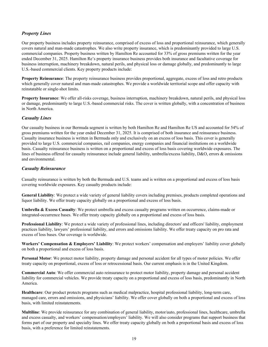 Property Lines Our property business includes property reinsurance, comprised of excess of loss and proportional reinsurance, which generally covers natural and man-made catastrophes. We also write property insurance, which is predominantly provided to large U.S. commercial companies. Property business written by Hamilton Re accounted for 33% of gross premiums written for the year ended December 31, 2025. Hamilton Re’s property insurance business provides both insurance and facultative coverage for business interruption, machinery breakdown, natural perils, and physical loss or damage globally, and predominantly to large U.S.-based commercial clients. Key property products include: Property Reinsurance: The property reinsurance business provides proportional, aggregate, excess of loss and retro products which generally cover natural and man-made catastrophes. We provide a worldwide territorial scope and offer capacity with reinstatable or single-shot limits. Property Insurance: We offer all-risks coverage, business interruption, machinery breakdown, natural perils, and physical loss or damage, predominantly to large U.S.-based commercial risks. The cover is written globally, with a concentration of business in North America. Casualty Lines Our casualty business in our Bermuda segment is written by both Hamilton Re and Hamilton Re US and accounted for 54% of gross premiums written for the year ended December 31, 2025. It is comprised of both insurance and reinsurance business. Casualty insurance business is written in Bermuda only and exclusively on an excess of loss basis. This cover is generally provided to large U.S. commercial companies, rail companies, energy companies and financial institutions on a worldwide basis. Casualty reinsurance business is written on a proportional and excess of loss basis covering worldwide exposures. The lines of business offered for casualty reinsurance include general liability, umbrella/excess liability, D&O, errors & omissions and environmental. Casualty Reinsurance Casualty reinsurance is written by both the Bermuda and U.S. teams and is written on a proportional and excess of loss basis covering worldwide exposures. Key casualty products include: General Liability: We protect a wide variety of general liability covers including premises, products completed operations and liquor liability. We offer treaty capacity globally on a proportional and excess of loss basis. Umbrella & Excess Casualty: We protect umbrella and excess casualty programs written on occurrence, claims-made or integrated-occurrence bases. We offer treaty capacity globally on a proportional and excess of loss basis. Professional Liability: We protect a wide variety of professional lines, including directors' and officers' liability, employment practices liability, lawyers’ professional liability, and errors and omissions liability. We offer treaty capacity on pro rata and excess of loss bases. Our coverage is worldwide. Workers’ Compensation & Employers’ Liability: We protect workers’ compensation and employers’ liability cover globally on both a proportional and excess of loss basis. Personal Motor: We protect motor liability, property damage and personal accident for all types of motor policies. We offer treaty capacity on proportional, excess of loss or retrocessional basis. Our current emphasis is in the United Kingdom. Commercial Auto: We offer commercial auto reinsurance to protect motor liability, property damage and personal accident liability for commercial vehicles. We provide treaty capacity on a proportional and excess of loss basis, predominantly in North America. Healthcare: Our product protects programs such as medical malpractice, hospital professional liability, long-term care, managed care, errors and omissions, and physicians’ liability. We offer cover globally on both a proportional and excess of loss basis, with limited reinstatements. Multiline: We provide reinsurance for any combination of general liability, motor/auto, professional lines, healthcare, umbrella and excess casualty, and workers’ compensation/employers’ liability. We will also consider programs that support business that forms part of our property and specialty lines. We offer treaty capacity globally on both a proportional basis and excess of loss basis, with a preference for limited reinstatements. 19
