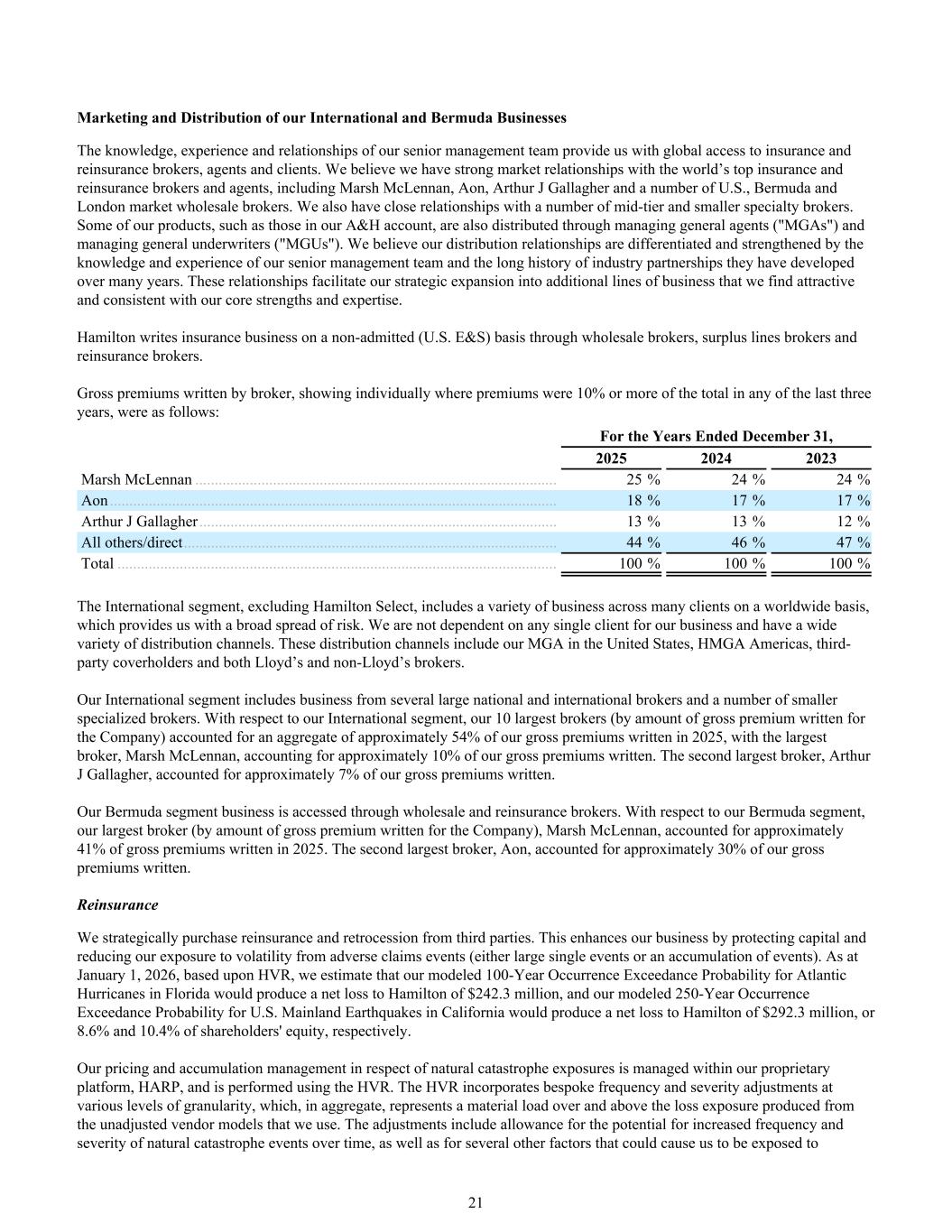 Marketing and Distribution of our International and Bermuda Businesses The knowledge, experience and relationships of our senior management team provide us with global access to insurance and reinsurance brokers, agents and clients. We believe we have strong market relationships with the world’s top insurance and reinsurance brokers and agents, including Marsh McLennan, Aon, Arthur J Gallagher and a number of U.S., Bermuda and London market wholesale brokers. We also have close relationships with a number of mid-tier and smaller specialty brokers. Some of our products, such as those in our A&H account, are also distributed through managing general agents ("MGAs") and managing general underwriters ("MGUs"). We believe our distribution relationships are differentiated and strengthened by the knowledge and experience of our senior management team and the long history of industry partnerships they have developed over many years. These relationships facilitate our strategic expansion into additional lines of business that we find attractive and consistent with our core strengths and expertise. Hamilton writes insurance business on a non-admitted (U.S. E&S) basis through wholesale brokers, surplus lines brokers and reinsurance brokers. Gross premiums written by broker, showing individually where premiums were 10% or more of the total in any of the last three years, were as follows: For the Years Ended December 31, 2025 2024 2023 Marsh McLennan ............................................................................................. 25 % 24 % 24 % Aon ................................................................................................................... 18 % 17 % 17 % Arthur J Gallagher ............................................................................................ 13 % 13 % 12 % All others/direct ................................................................................................ 44 % 46 % 47 % Total ................................................................................................................. 100 % 100 % 100 % The International segment, excluding Hamilton Select, includes a variety of business across many clients on a worldwide basis, which provides us with a broad spread of risk. We are not dependent on any single client for our business and have a wide variety of distribution channels. These distribution channels include our MGA in the United States, HMGA Americas, third- party coverholders and both Lloyd’s and non-Lloyd’s brokers. Our International segment includes business from several large national and international brokers and a number of smaller specialized brokers. With respect to our International segment, our 10 largest brokers (by amount of gross premium written for the Company) accounted for an aggregate of approximately 54% of our gross premiums written in 2025, with the largest broker, Marsh McLennan, accounting for approximately 10% of our gross premiums written. The second largest broker, Arthur J Gallagher, accounted for approximately 7% of our gross premiums written. Our Bermuda segment business is accessed through wholesale and reinsurance brokers. With respect to our Bermuda segment, our largest broker (by amount of gross premium written for the Company), Marsh McLennan, accounted for approximately 41% of gross premiums written in 2025. The second largest broker, Aon, accounted for approximately 30% of our gross premiums written. Reinsurance We strategically purchase reinsurance and retrocession from third parties. This enhances our business by protecting capital and reducing our exposure to volatility from adverse claims events (either large single events or an accumulation of events). As at January 1, 2026, based upon HVR, we estimate that our modeled 100-Year Occurrence Exceedance Probability for Atlantic Hurricanes in Florida would produce a net loss to Hamilton of $242.3 million, and our modeled 250-Year Occurrence Exceedance Probability for U.S. Mainland Earthquakes in California would produce a net loss to Hamilton of $292.3 million, or 8.6% and 10.4% of shareholders' equity, respectively. Our pricing and accumulation management in respect of natural catastrophe exposures is managed within our proprietary platform, HARP, and is performed using the HVR. The HVR incorporates bespoke frequency and severity adjustments at various levels of granularity, which, in aggregate, represents a material load over and above the loss exposure produced from the unadjusted vendor models that we use. The adjustments include allowance for the potential for increased frequency and severity of natural catastrophe events over time, as well as for several other factors that could cause us to be exposed to 21