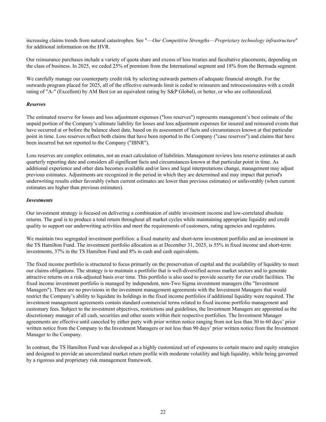 increasing claims trends from natural catastrophes. See "––Our Competitive Strengths––Proprietary technology infrastructure" for additional information on the HVR. Our reinsurance purchases include a variety of quota share and excess of loss treaties and facultative placements, depending on the class of business. In 2025, we ceded 25% of premium from the International segment and 18% from the Bermuda segment. We carefully manage our counterparty credit risk by selecting outwards partners of adequate financial strength. For the outwards program placed for 2025, all of the effective outwards limit is ceded to reinsurers and retrocessionaires with a credit rating of "A-" (Excellent) by AM Best (or an equivalent rating by S&P Global), or better, or who are collateralized. Reserves The estimated reserve for losses and loss adjustment expenses ("loss reserves") represents management’s best estimate of the unpaid portion of the Company’s ultimate liability for losses and loss adjustment expenses for insured and reinsured events that have occurred at or before the balance sheet date, based on its assessment of facts and circumstances known at that particular point in time. Loss reserves reflect both claims that have been reported to the Company ("case reserves") and claims that have been incurred but not reported to the Company ("IBNR"). Loss reserves are complex estimates, not an exact calculation of liabilities. Management reviews loss reserve estimates at each quarterly reporting date and considers all significant facts and circumstances known at that particular point in time. As additional experience and other data becomes available and/or laws and legal interpretations change, management may adjust previous estimates. Adjustments are recognized in the period in which they are determined and may impact that period's underwriting results either favorably (when current estimates are lower than previous estimates) or unfavorably (when current estimates are higher than previous estimates). Investments Our investment strategy is focused on delivering a combination of stable investment income and low-correlated absolute returns. The goal is to produce a total return throughout all market cycles while maintaining appropriate liquidity and credit quality to support our underwriting activities and meet the requirements of customers, rating agencies and regulators. We maintain two segregated investment portfolios: a fixed maturity and short-term investment portfolio and an investment in the TS Hamilton Fund. The investment portfolio allocation as at December 31, 2025, is 55% in fixed income and short-term investments, 37% in the TS Hamilton Fund and 8% in cash and cash equivalents. The fixed income portfolio is structured to focus primarily on the preservation of capital and the availability of liquidity to meet our claims obligations. The strategy is to maintain a portfolio that is well-diversified across market sectors and to generate attractive returns on a risk-adjusted basis over time. This portfolio is also used to provide security for our credit facilities. The fixed income investment portfolio is managed by independent, non-Two Sigma investment managers (the "Investment Managers"). There are no provisions in the investment management agreements with the Investment Managers that would restrict the Company’s ability to liquidate its holdings in the fixed income portfolios if additional liquidity were required. The investment management agreements contain standard commercial terms related to fixed income portfolio management and customary fees. Subject to the investment objectives, restrictions and guidelines, the Investment Managers are appointed as the discretionary manager of all cash, securities and other assets within their respective portfolios. The Investment Manager agreements are effective until canceled by either party with prior written notice ranging from not less than 30 to 60 days’ prior written notice from the Company to the Investment Managers or not less than 90 days’ prior written notice from the Investment Manager to the Company. In contrast, the TS Hamilton Fund was developed as a highly customized set of exposures to certain macro and equity strategies and designed to provide an uncorrelated market return profile with moderate volatility and high liquidity, while being governed by a rigorous and proprietary risk management framework. 22