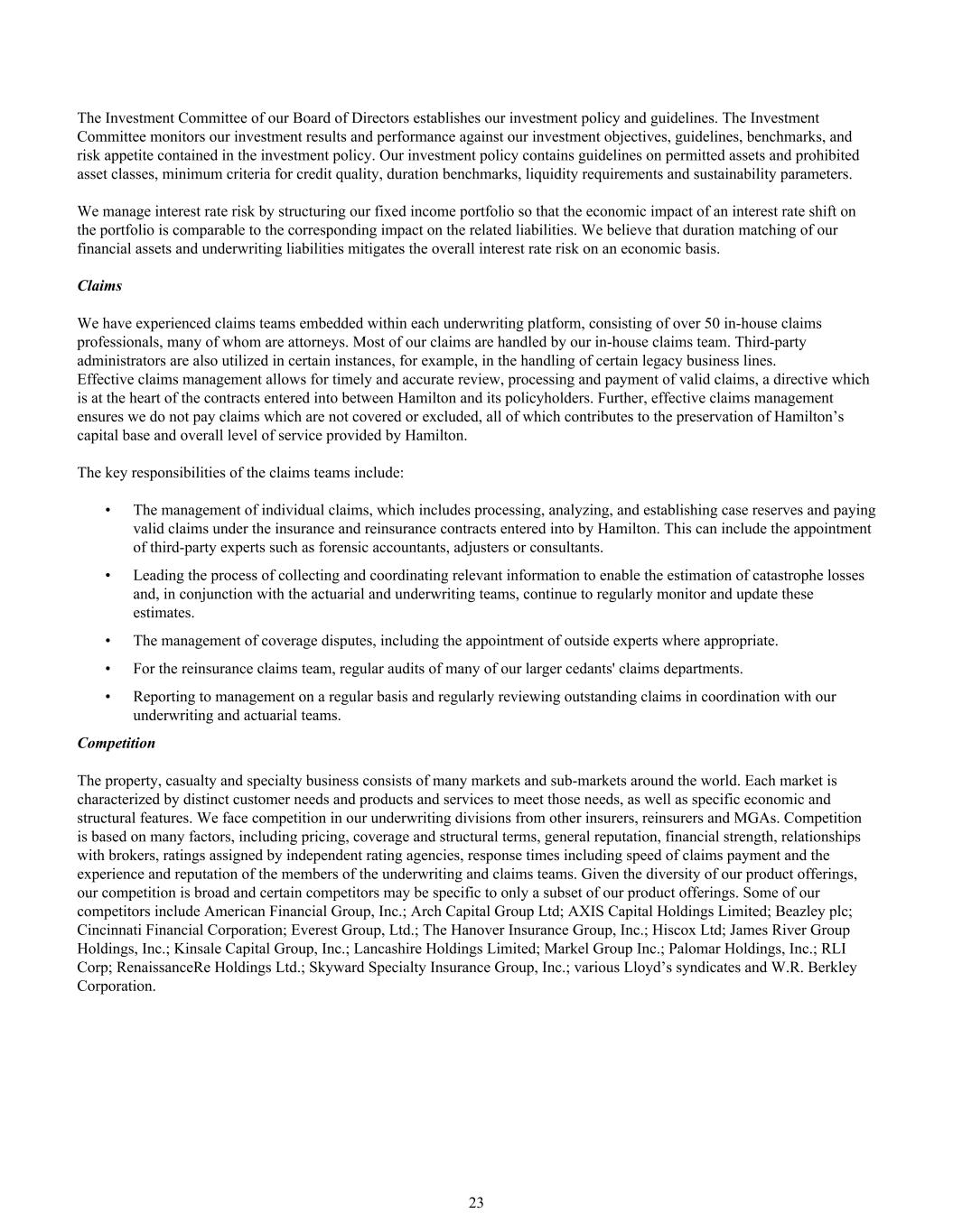 The Investment Committee of our Board of Directors establishes our investment policy and guidelines. The Investment Committee monitors our investment results and performance against our investment objectives, guidelines, benchmarks, and risk appetite contained in the investment policy. Our investment policy contains guidelines on permitted assets and prohibited asset classes, minimum criteria for credit quality, duration benchmarks, liquidity requirements and sustainability parameters. We manage interest rate risk by structuring our fixed income portfolio so that the economic impact of an interest rate shift on the portfolio is comparable to the corresponding impact on the related liabilities. We believe that duration matching of our financial assets and underwriting liabilities mitigates the overall interest rate risk on an economic basis. Claims We have experienced claims teams embedded within each underwriting platform, consisting of over 50 in-house claims professionals, many of whom are attorneys. Most of our claims are handled by our in-house claims team. Third-party administrators are also utilized in certain instances, for example, in the handling of certain legacy business lines. Effective claims management allows for timely and accurate review, processing and payment of valid claims, a directive which is at the heart of the contracts entered into between Hamilton and its policyholders. Further, effective claims management ensures we do not pay claims which are not covered or excluded, all of which contributes to the preservation of Hamilton’s capital base and overall level of service provided by Hamilton. The key responsibilities of the claims teams include: • The management of individual claims, which includes processing, analyzing, and establishing case reserves and paying valid claims under the insurance and reinsurance contracts entered into by Hamilton. This can include the appointment of third-party experts such as forensic accountants, adjusters or consultants. • Leading the process of collecting and coordinating relevant information to enable the estimation of catastrophe losses and, in conjunction with the actuarial and underwriting teams, continue to regularly monitor and update these estimates. • The management of coverage disputes, including the appointment of outside experts where appropriate. • For the reinsurance claims team, regular audits of many of our larger cedants' claims departments. • Reporting to management on a regular basis and regularly reviewing outstanding claims in coordination with our underwriting and actuarial teams. Competition The property, casualty and specialty business consists of many markets and sub-markets around the world. Each market is characterized by distinct customer needs and products and services to meet those needs, as well as specific economic and structural features. We face competition in our underwriting divisions from other insurers, reinsurers and MGAs. Competition is based on many factors, including pricing, coverage and structural terms, general reputation, financial strength, relationships with brokers, ratings assigned by independent rating agencies, response times including speed of claims payment and the experience and reputation of the members of the underwriting and claims teams. Given the diversity of our product offerings, our competition is broad and certain competitors may be specific to only a subset of our product offerings. Some of our competitors include American Financial Group, Inc.; Arch Capital Group Ltd; AXIS Capital Holdings Limited; Beazley plc; Cincinnati Financial Corporation; Everest Group, Ltd.; The Hanover Insurance Group, Inc.; Hiscox Ltd; James River Group Holdings, Inc.; Kinsale Capital Group, Inc.; Lancashire Holdings Limited; Markel Group Inc.; Palomar Holdings, Inc.; RLI Corp; RenaissanceRe Holdings Ltd.; Skyward Specialty Insurance Group, Inc.; various Lloyd’s syndicates and W.R. Berkley Corporation. 23