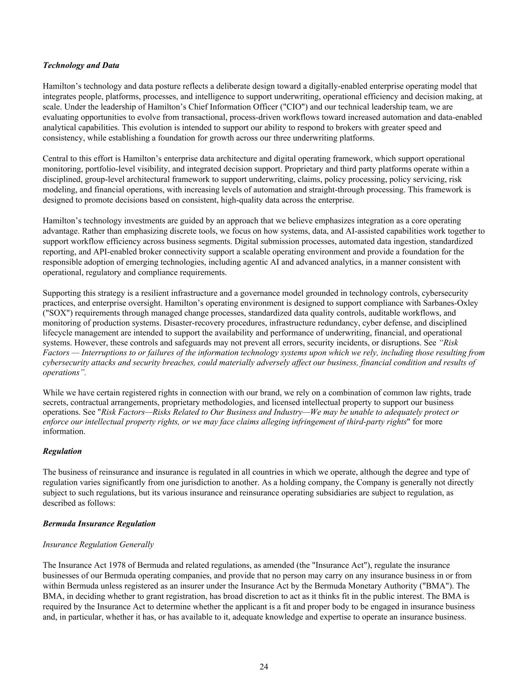 Technology and Data Hamilton’s technology and data posture reflects a deliberate design toward a digitally-enabled enterprise operating model that integrates people, platforms, processes, and intelligence to support underwriting, operational efficiency and decision making, at scale. Under the leadership of Hamilton’s Chief Information Officer ("CIO") and our technical leadership team, we are evaluating opportunities to evolve from transactional, process-driven workflows toward increased automation and data-enabled analytical capabilities. This evolution is intended to support our ability to respond to brokers with greater speed and consistency, while establishing a foundation for growth across our three underwriting platforms. Central to this effort is Hamilton’s enterprise data architecture and digital operating framework, which support operational monitoring, portfolio-level visibility, and integrated decision support. Proprietary and third party platforms operate within a disciplined, group-level architectural framework to support underwriting, claims, policy processing, policy servicing, risk modeling, and financial operations, with increasing levels of automation and straight-through processing. This framework is designed to promote decisions based on consistent, high-quality data across the enterprise. Hamilton’s technology investments are guided by an approach that we believe emphasizes integration as a core operating advantage. Rather than emphasizing discrete tools, we focus on how systems, data, and AI-assisted capabilities work together to support workflow efficiency across business segments. Digital submission processes, automated data ingestion, standardized reporting, and API-enabled broker connectivity support a scalable operating environment and provide a foundation for the responsible adoption of emerging technologies, including agentic AI and advanced analytics, in a manner consistent with operational, regulatory and compliance requirements. Supporting this strategy is a resilient infrastructure and a governance model grounded in technology controls, cybersecurity practices, and enterprise oversight. Hamilton’s operating environment is designed to support compliance with Sarbanes-Oxley ("SOX") requirements through managed change processes, standardized data quality controls, auditable workflows, and monitoring of production systems. Disaster-recovery procedures, infrastructure redundancy, cyber defense, and disciplined lifecycle management are intended to support the availability and performance of underwriting, financial, and operational systems. However, these controls and safeguards may not prevent all errors, security incidents, or disruptions. See “Risk Factors — Interruptions to or failures of the information technology systems upon which we rely, including those resulting from cybersecurity attacks and security breaches, could materially adversely affect our business, financial condition and results of operations”. While we have certain registered rights in connection with our brand, we rely on a combination of common law rights, trade secrets, contractual arrangements, proprietary methodologies, and licensed intellectual property to support our business operations. See "Risk Factors—Risks Related to Our Business and Industry—We may be unable to adequately protect or enforce our intellectual property rights, or we may face claims alleging infringement of third-party rights" for more information. Regulation The business of reinsurance and insurance is regulated in all countries in which we operate, although the degree and type of regulation varies significantly from one jurisdiction to another. As a holding company, the Company is generally not directly subject to such regulations, but its various insurance and reinsurance operating subsidiaries are subject to regulation, as described as follows: Bermuda Insurance Regulation Insurance Regulation Generally The Insurance Act 1978 of Bermuda and related regulations, as amended (the "Insurance Act"), regulate the insurance businesses of our Bermuda operating companies, and provide that no person may carry on any insurance business in or from within Bermuda unless registered as an insurer under the Insurance Act by the Bermuda Monetary Authority ("BMA"). The BMA, in deciding whether to grant registration, has broad discretion to act as it thinks fit in the public interest. The BMA is required by the Insurance Act to determine whether the applicant is a fit and proper body to be engaged in insurance business and, in particular, whether it has, or has available to it, adequate knowledge and expertise to operate an insurance business. 24