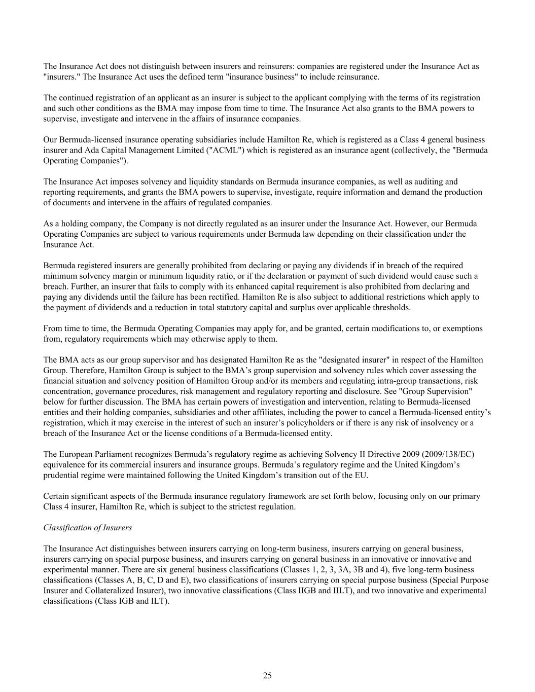The Insurance Act does not distinguish between insurers and reinsurers: companies are registered under the Insurance Act as "insurers." The Insurance Act uses the defined term "insurance business" to include reinsurance. The continued registration of an applicant as an insurer is subject to the applicant complying with the terms of its registration and such other conditions as the BMA may impose from time to time. The Insurance Act also grants to the BMA powers to supervise, investigate and intervene in the affairs of insurance companies. Our Bermuda-licensed insurance operating subsidiaries include Hamilton Re, which is registered as a Class 4 general business insurer and Ada Capital Management Limited ("ACML") which is registered as an insurance agent (collectively, the "Bermuda Operating Companies"). The Insurance Act imposes solvency and liquidity standards on Bermuda insurance companies, as well as auditing and reporting requirements, and grants the BMA powers to supervise, investigate, require information and demand the production of documents and intervene in the affairs of regulated companies. As a holding company, the Company is not directly regulated as an insurer under the Insurance Act. However, our Bermuda Operating Companies are subject to various requirements under Bermuda law depending on their classification under the Insurance Act. Bermuda registered insurers are generally prohibited from declaring or paying any dividends if in breach of the required minimum solvency margin or minimum liquidity ratio, or if the declaration or payment of such dividend would cause such a breach. Further, an insurer that fails to comply with its enhanced capital requirement is also prohibited from declaring and paying any dividends until the failure has been rectified. Hamilton Re is also subject to additional restrictions which apply to the payment of dividends and a reduction in total statutory capital and surplus over applicable thresholds. From time to time, the Bermuda Operating Companies may apply for, and be granted, certain modifications to, or exemptions from, regulatory requirements which may otherwise apply to them. The BMA acts as our group supervisor and has designated Hamilton Re as the "designated insurer" in respect of the Hamilton Group. Therefore, Hamilton Group is subject to the BMA’s group supervision and solvency rules which cover assessing the financial situation and solvency position of Hamilton Group and/or its members and regulating intra-group transactions, risk concentration, governance procedures, risk management and regulatory reporting and disclosure. See "Group Supervision" below for further discussion. The BMA has certain powers of investigation and intervention, relating to Bermuda-licensed entities and their holding companies, subsidiaries and other affiliates, including the power to cancel a Bermuda-licensed entity’s registration, which it may exercise in the interest of such an insurer’s policyholders or if there is any risk of insolvency or a breach of the Insurance Act or the license conditions of a Bermuda-licensed entity. The European Parliament recognizes Bermuda’s regulatory regime as achieving Solvency II Directive 2009 (2009/138/EC) equivalence for its commercial insurers and insurance groups. Bermuda’s regulatory regime and the United Kingdom’s prudential regime were maintained following the United Kingdom’s transition out of the EU. Certain significant aspects of the Bermuda insurance regulatory framework are set forth below, focusing only on our primary Class 4 insurer, Hamilton Re, which is subject to the strictest regulation. Classification of Insurers The Insurance Act distinguishes between insurers carrying on long-term business, insurers carrying on general business, insurers carrying on special purpose business, and insurers carrying on general business in an innovative or innovative and experimental manner. There are six general business classifications (Classes 1, 2, 3, 3A, 3B and 4), five long-term business classifications (Classes A, B, C, D and E), two classifications of insurers carrying on special purpose business (Special Purpose Insurer and Collateralized Insurer), two innovative classifications (Class IIGB and IILT), and two innovative and experimental classifications (Class IGB and ILT). 25