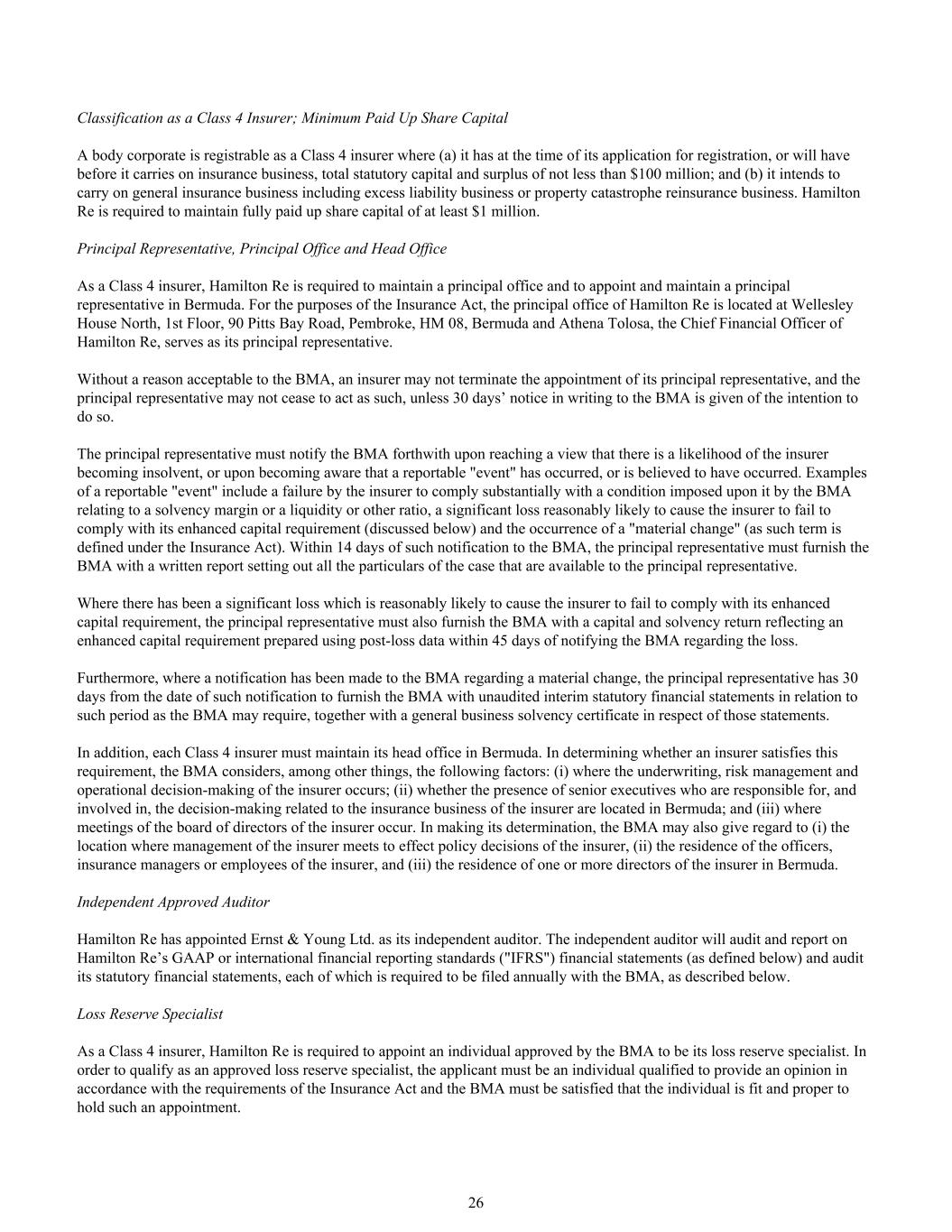 Classification as a Class 4 Insurer; Minimum Paid Up Share Capital A body corporate is registrable as a Class 4 insurer where (a) it has at the time of its application for registration, or will have before it carries on insurance business, total statutory capital and surplus of not less than $100 million; and (b) it intends to carry on general insurance business including excess liability business or property catastrophe reinsurance business. Hamilton Re is required to maintain fully paid up share capital of at least $1 million. Principal Representative, Principal Office and Head Office As a Class 4 insurer, Hamilton Re is required to maintain a principal office and to appoint and maintain a principal representative in Bermuda. For the purposes of the Insurance Act, the principal office of Hamilton Re is located at Wellesley House North, 1st Floor, 90 Pitts Bay Road, Pembroke, HM 08, Bermuda and Athena Tolosa, the Chief Financial Officer of Hamilton Re, serves as its principal representative. Without a reason acceptable to the BMA, an insurer may not terminate the appointment of its principal representative, and the principal representative may not cease to act as such, unless 30 days’ notice in writing to the BMA is given of the intention to do so. The principal representative must notify the BMA forthwith upon reaching a view that there is a likelihood of the insurer becoming insolvent, or upon becoming aware that a reportable "event" has occurred, or is believed to have occurred. Examples of a reportable "event" include a failure by the insurer to comply substantially with a condition imposed upon it by the BMA relating to a solvency margin or a liquidity or other ratio, a significant loss reasonably likely to cause the insurer to fail to comply with its enhanced capital requirement (discussed below) and the occurrence of a "material change" (as such term is defined under the Insurance Act). Within 14 days of such notification to the BMA, the principal representative must furnish the BMA with a written report setting out all the particulars of the case that are available to the principal representative. Where there has been a significant loss which is reasonably likely to cause the insurer to fail to comply with its enhanced capital requirement, the principal representative must also furnish the BMA with a capital and solvency return reflecting an enhanced capital requirement prepared using post-loss data within 45 days of notifying the BMA regarding the loss. Furthermore, where a notification has been made to the BMA regarding a material change, the principal representative has 30 days from the date of such notification to furnish the BMA with unaudited interim statutory financial statements in relation to such period as the BMA may require, together with a general business solvency certificate in respect of those statements. In addition, each Class 4 insurer must maintain its head office in Bermuda. In determining whether an insurer satisfies this requirement, the BMA considers, among other things, the following factors: (i) where the underwriting, risk management and operational decision-making of the insurer occurs; (ii) whether the presence of senior executives who are responsible for, and involved in, the decision-making related to the insurance business of the insurer are located in Bermuda; and (iii) where meetings of the board of directors of the insurer occur. In making its determination, the BMA may also give regard to (i) the location where management of the insurer meets to effect policy decisions of the insurer, (ii) the residence of the officers, insurance managers or employees of the insurer, and (iii) the residence of one or more directors of the insurer in Bermuda. Independent Approved Auditor Hamilton Re has appointed Ernst & Young Ltd. as its independent auditor. The independent auditor will audit and report on Hamilton Re’s GAAP or international financial reporting standards ("IFRS") financial statements (as defined below) and audit its statutory financial statements, each of which is required to be filed annually with the BMA, as described below. Loss Reserve Specialist As a Class 4 insurer, Hamilton Re is required to appoint an individual approved by the BMA to be its loss reserve specialist. In order to qualify as an approved loss reserve specialist, the applicant must be an individual qualified to provide an opinion in accordance with the requirements of the Insurance Act and the BMA must be satisfied that the individual is fit and proper to hold such an appointment. 26
