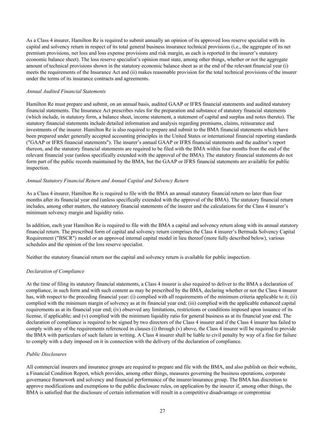 As a Class 4 insurer, Hamilton Re is required to submit annually an opinion of its approved loss reserve specialist with its capital and solvency return in respect of its total general business insurance technical provisions (i.e., the aggregate of its net premium provisions, net loss and loss expense provisions and risk margin, as each is reported in the insurer’s statutory economic balance sheet). The loss reserve specialist’s opinion must state, among other things, whether or not the aggregate amount of technical provisions shown in the statutory economic balance sheet as at the end of the relevant financial year (i) meets the requirements of the Insurance Act and (ii) makes reasonable provision for the total technical provisions of the insurer under the terms of its insurance contracts and agreements. Annual Audited Financial Statements Hamilton Re must prepare and submit, on an annual basis, audited GAAP or IFRS financial statements and audited statutory financial statements. The Insurance Act prescribes rules for the preparation and substance of statutory financial statements (which include, in statutory form, a balance sheet, income statement, a statement of capital and surplus and notes thereto). The statutory financial statements include detailed information and analysis regarding premiums, claims, reinsurance and investments of the insurer. Hamilton Re is also required to prepare and submit to the BMA financial statements which have been prepared under generally accepted accounting principles in the United States or international financial reporting standards ("GAAP or IFRS financial statements"). The insurer’s annual GAAP or IFRS financial statements and the auditor’s report thereon, and the statutory financial statements are required to be filed with the BMA within four months from the end of the relevant financial year (unless specifically extended with the approval of the BMA). The statutory financial statements do not form part of the public records maintained by the BMA, but the GAAP or IFRS financial statements are available for public inspection. Annual Statutory Financial Return and Annual Capital and Solvency Return As a Class 4 insurer, Hamilton Re is required to file with the BMA an annual statutory financial return no later than four months after its financial year end (unless specifically extended with the approval of the BMA). The statutory financial return includes, among other matters, the statutory financial statements of the insurer and the calculations for the Class 4 insurer’s minimum solvency margin and liquidity ratio. In addition, each year Hamilton Re is required to file with the BMA a capital and solvency return along with its annual statutory financial return. The prescribed form of capital and solvency return comprises the Class 4 insurer’s Bermuda Solvency Capital Requirement ("BSCR") model or an approved internal capital model in lieu thereof (more fully described below), various schedules and the opinion of the loss reserve specialist. Neither the statutory financial return nor the capital and solvency return is available for public inspection. Declaration of Compliance At the time of filing its statutory financial statements, a Class 4 insurer is also required to deliver to the BMA a declaration of compliance, in such form and with such content as may be prescribed by the BMA, declaring whether or not the Class 4 insurer has, with respect to the preceding financial year: (i) complied with all requirements of the minimum criteria applicable to it; (ii) complied with the minimum margin of solvency as at its financial year end; (iii) complied with the applicable enhanced capital requirements as at its financial year end; (iv) observed any limitations, restrictions or conditions imposed upon issuance of its license, if applicable; and (v) complied with the minimum liquidity ratio for general business as at its financial year end. The declaration of compliance is required to be signed by two directors of the Class 4 insurer and if the Class 4 insurer has failed to comply with any of the requirements referenced in clauses (i) through (v) above, the Class 4 insurer will be required to provide the BMA with particulars of such failure in writing. A Class 4 insurer shall be liable to civil penalty by way of a fine for failure to comply with a duty imposed on it in connection with the delivery of the declaration of compliance. Public Disclosures All commercial insurers and insurance groups are required to prepare and file with the BMA, and also publish on their website, a Financial Condition Report, which provides, among other things, measures governing the business operations, corporate governance framework and solvency and financial performance of the insurer/insurance group. The BMA has discretion to approve modifications and exemptions to the public disclosure rules, on application by the insurer if, among other things, the BMA is satisfied that the disclosure of certain information will result in a competitive disadvantage or compromise 27