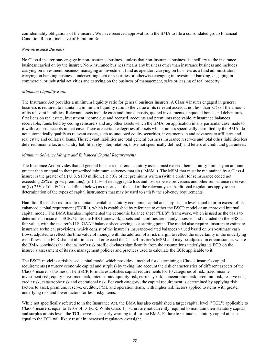 confidentiality obligations of the insurer. We have received approval from the BMA to file a consolidated group Financial Condition Report, inclusive of Hamilton Re. Non-insurance Business No Class 4 insurer may engage in non-insurance business, unless that non-insurance business is ancillary to the insurance business carried on by the insurer. Non-insurance business means any business other than insurance business and includes carrying on investment business, managing an investment fund as operator, carrying on business as a fund administrator, carrying on banking business, underwriting debt or securities or otherwise engaging in investment banking, engaging in commercial or industrial activities and carrying on the business of management, sales or leasing of real property. Minimum Liquidity Ratio The Insurance Act provides a minimum liquidity ratio for general business insurers. A Class 4 insurer engaged in general business is required to maintain a minimum liquidity ratio to the value of its relevant assets at not less than 75% of the amount of its relevant liabilities. Relevant assets include cash and time deposits, quoted investments, unquoted bonds and debentures, first liens on real estate, investment income due and accrued, accounts and premiums receivable, reinsurance balances receivable, funds held by ceding reinsurers and any other assets which the BMA, on application in any particular case made to it with reasons, accepts in that case. There are certain categories of assets which, unless specifically permitted by the BMA, do not automatically qualify as relevant assets, such as unquoted equity securities, investments in and advances to affiliates and real estate and collateral loans. The relevant liabilities are total general business insurance reserves and total other liabilities less deferred income tax and sundry liabilities (by interpretation, those not specifically defined) and letters of credit and guarantees. Minimum Solvency Margin and Enhanced Capital Requirements The Insurance Act provides that all general business insurers’ statutory assets must exceed their statutory limits by an amount greater than or equal to their prescribed minimum solvency margin ("MSM"). The MSM that must be maintained by a Class 4 insurer is the greater of (i) U.S. $100 million, (ii) 50% of net premiums written (with a credit for reinsurance ceded not exceeding 25% of gross premiums), (iii) 15% of net aggregate loss and loss expense provisions and other reinsurance reserves, or (iv) 25% of the ECR (as defined below) as reported at the end of the relevant year. Additional regulations apply to the determination of the types of capital instruments that may be used to satisfy the solvency requirements. Hamilton Re is also required to maintain available statutory economic capital and surplus at a level equal to or in excess of its enhanced capital requirement ("ECR"), which is established by reference to either the BSCR model or an approved internal capital model. The BMA has also implemented the economic balance sheet ("EBS") framework, which is used as the basis to determine an insurer’s ECR. Under the EBS framework, assets and liabilities are mainly assessed and included on the EBS at fair value, with the insurer’s U.S. GAAP balance sheet serving as a starting point. The model also requires insurers to estimate insurance technical provisions, which consist of the insurer’s insurance-related balances valued based on best-estimate cash flows, adjusted to reflect the time value of money, with the addition of a risk margin to reflect the uncertainty in the underlying cash flows. The ECR shall at all times equal or exceed the Class 4 insurer’s MSM and may be adjusted in circumstances where the BMA concludes that the insurer’s risk profile deviates significantly from the assumptions underlying its ECR on the insurer’s assessment of its risk management policies and practices used to calculate the ECR applicable to it. The BSCR model is a risk-based capital model which provides a method for determining a Class 4 insurer’s capital requirements (statutory economic capital and surplus) by taking into account the risk characteristics of different aspects of the Class 4 insurer’s business. The BSCR formula establishes capital requirements for 10 categories of risk: fixed income investment risk, equity investment risk, interest rate/liquidity risk, currency risk, concentration risk, premium risk, reserve risk, credit risk, catastrophe risk and operational risk. For each category, the capital requirement is determined by applying risk factors to asset, premium, reserve, creditor, PML and operation items, with higher risk factors applied to items with greater underlying risk and lower factors for less risky items. While not specifically referred to in the Insurance Act, the BMA has also established a target capital level ("TCL") applicable to Class 4 insurers, equal to 120% of its ECR. While Class 4 insurers are not currently required to maintain their statutory capital and surplus at this level, the TCL serves as an early warning tool for the BMA. Failure to maintain statutory capital at least equal to the TCL will likely result in increased regulatory oversight. 28