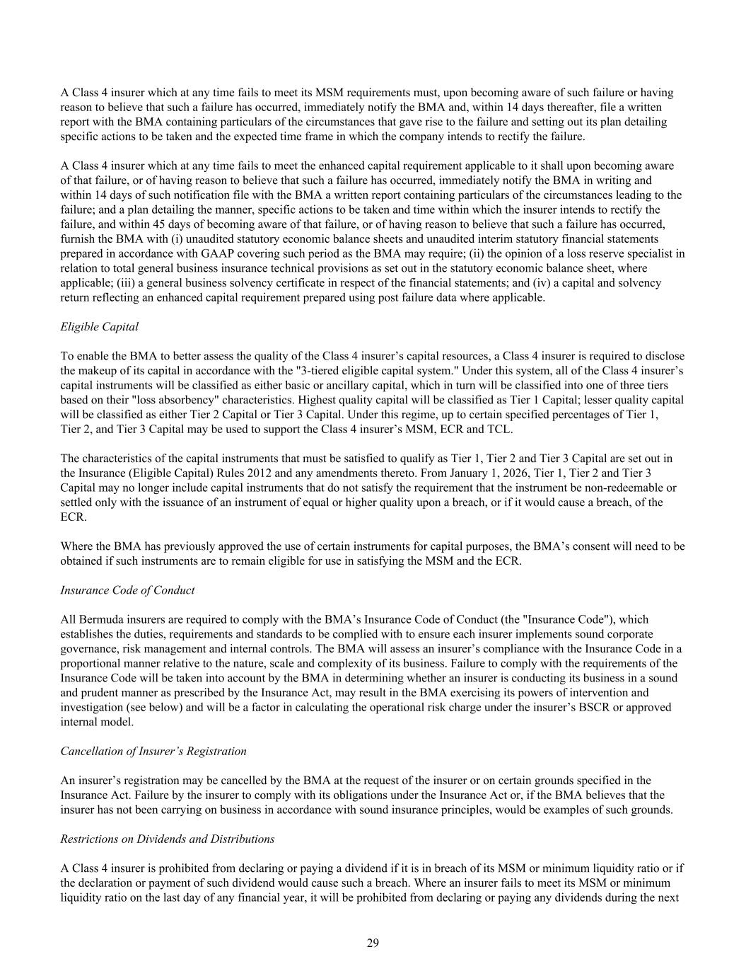 A Class 4 insurer which at any time fails to meet its MSM requirements must, upon becoming aware of such failure or having reason to believe that such a failure has occurred, immediately notify the BMA and, within 14 days thereafter, file a written report with the BMA containing particulars of the circumstances that gave rise to the failure and setting out its plan detailing specific actions to be taken and the expected time frame in which the company intends to rectify the failure. A Class 4 insurer which at any time fails to meet the enhanced capital requirement applicable to it shall upon becoming aware of that failure, or of having reason to believe that such a failure has occurred, immediately notify the BMA in writing and within 14 days of such notification file with the BMA a written report containing particulars of the circumstances leading to the failure; and a plan detailing the manner, specific actions to be taken and time within which the insurer intends to rectify the failure, and within 45 days of becoming aware of that failure, or of having reason to believe that such a failure has occurred, furnish the BMA with (i) unaudited statutory economic balance sheets and unaudited interim statutory financial statements prepared in accordance with GAAP covering such period as the BMA may require; (ii) the opinion of a loss reserve specialist in relation to total general business insurance technical provisions as set out in the statutory economic balance sheet, where applicable; (iii) a general business solvency certificate in respect of the financial statements; and (iv) a capital and solvency return reflecting an enhanced capital requirement prepared using post failure data where applicable. Eligible Capital To enable the BMA to better assess the quality of the Class 4 insurer’s capital resources, a Class 4 insurer is required to disclose the makeup of its capital in accordance with the "3-tiered eligible capital system." Under this system, all of the Class 4 insurer’s capital instruments will be classified as either basic or ancillary capital, which in turn will be classified into one of three tiers based on their "loss absorbency" characteristics. Highest quality capital will be classified as Tier 1 Capital; lesser quality capital will be classified as either Tier 2 Capital or Tier 3 Capital. Under this regime, up to certain specified percentages of Tier 1, Tier 2, and Tier 3 Capital may be used to support the Class 4 insurer’s MSM, ECR and TCL. The characteristics of the capital instruments that must be satisfied to qualify as Tier 1, Tier 2 and Tier 3 Capital are set out in the Insurance (Eligible Capital) Rules 2012 and any amendments thereto. From January 1, 2026, Tier 1, Tier 2 and Tier 3 Capital may no longer include capital instruments that do not satisfy the requirement that the instrument be non-redeemable or settled only with the issuance of an instrument of equal or higher quality upon a breach, or if it would cause a breach, of the ECR. Where the BMA has previously approved the use of certain instruments for capital purposes, the BMA’s consent will need to be obtained if such instruments are to remain eligible for use in satisfying the MSM and the ECR. Insurance Code of Conduct All Bermuda insurers are required to comply with the BMA’s Insurance Code of Conduct (the "Insurance Code"), which establishes the duties, requirements and standards to be complied with to ensure each insurer implements sound corporate governance, risk management and internal controls. The BMA will assess an insurer’s compliance with the Insurance Code in a proportional manner relative to the nature, scale and complexity of its business. Failure to comply with the requirements of the Insurance Code will be taken into account by the BMA in determining whether an insurer is conducting its business in a sound and prudent manner as prescribed by the Insurance Act, may result in the BMA exercising its powers of intervention and investigation (see below) and will be a factor in calculating the operational risk charge under the insurer’s BSCR or approved internal model. Cancellation of Insurer’s Registration An insurer’s registration may be cancelled by the BMA at the request of the insurer or on certain grounds specified in the Insurance Act. Failure by the insurer to comply with its obligations under the Insurance Act or, if the BMA believes that the insurer has not been carrying on business in accordance with sound insurance principles, would be examples of such grounds. Restrictions on Dividends and Distributions A Class 4 insurer is prohibited from declaring or paying a dividend if it is in breach of its MSM or minimum liquidity ratio or if the declaration or payment of such dividend would cause such a breach. Where an insurer fails to meet its MSM or minimum liquidity ratio on the last day of any financial year, it will be prohibited from declaring or paying any dividends during the next 29