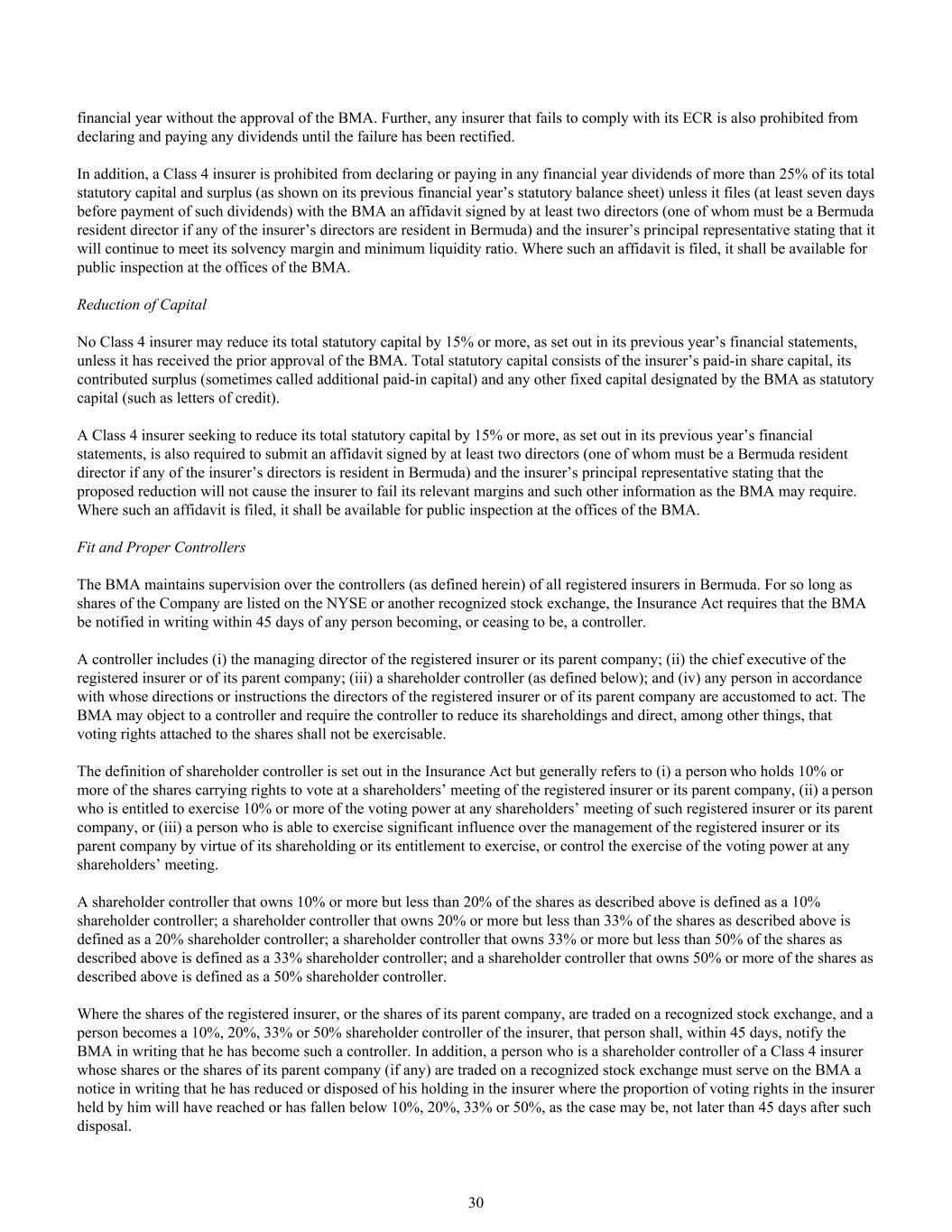 financial year without the approval of the BMA. Further, any insurer that fails to comply with its ECR is also prohibited from declaring and paying any dividends until the failure has been rectified. In addition, a Class 4 insurer is prohibited from declaring or paying in any financial year dividends of more than 25% of its total statutory capital and surplus (as shown on its previous financial year’s statutory balance sheet) unless it files (at least seven days before payment of such dividends) with the BMA an affidavit signed by at least two directors (one of whom must be a Bermuda resident director if any of the insurer’s directors are resident in Bermuda) and the insurer’s principal representative stating that it will continue to meet its solvency margin and minimum liquidity ratio. Where such an affidavit is filed, it shall be available for public inspection at the offices of the BMA. Reduction of Capital No Class 4 insurer may reduce its total statutory capital by 15% or more, as set out in its previous year’s financial statements, unless it has received the prior approval of the BMA. Total statutory capital consists of the insurer’s paid-in share capital, its contributed surplus (sometimes called additional paid-in capital) and any other fixed capital designated by the BMA as statutory capital (such as letters of credit). A Class 4 insurer seeking to reduce its total statutory capital by 15% or more, as set out in its previous year’s financial statements, is also required to submit an affidavit signed by at least two directors (one of whom must be a Bermuda resident director if any of the insurer’s directors is resident in Bermuda) and the insurer’s principal representative stating that the proposed reduction will not cause the insurer to fail its relevant margins and such other information as the BMA may require. Where such an affidavit is filed, it shall be available for public inspection at the offices of the BMA. Fit and Proper Controllers The BMA maintains supervision over the controllers (as defined herein) of all registered insurers in Bermuda. For so long as shares of the Company are listed on the NYSE or another recognized stock exchange, the Insurance Act requires that the BMA be notified in writing within 45 days of any person becoming, or ceasing to be, a controller. A controller includes (i) the managing director of the registered insurer or its parent company; (ii) the chief executive of the registered insurer or of its parent company; (iii) a shareholder controller (as defined below); and (iv) any person in accordance with whose directions or instructions the directors of the registered insurer or of its parent company are accustomed to act. The BMA may object to a controller and require the controller to reduce its shareholdings and direct, among other things, that voting rights attached to the shares shall not be exercisable. The definition of shareholder controller is set out in the Insurance Act but generally refers to (i) a person who holds 10% or more of the shares carrying rights to vote at a shareholders’ meeting of the registered insurer or its parent company, (ii) a person who is entitled to exercise 10% or more of the voting power at any shareholders’ meeting of such registered insurer or its parent company, or (iii) a person who is able to exercise significant influence over the management of the registered insurer or its parent company by virtue of its shareholding or its entitlement to exercise, or control the exercise of the voting power at any shareholders’ meeting. A shareholder controller that owns 10% or more but less than 20% of the shares as described above is defined as a 10% shareholder controller; a shareholder controller that owns 20% or more but less than 33% of the shares as described above is defined as a 20% shareholder controller; a shareholder controller that owns 33% or more but less than 50% of the shares as described above is defined as a 33% shareholder controller; and a shareholder controller that owns 50% or more of the shares as described above is defined as a 50% shareholder controller. Where the shares of the registered insurer, or the shares of its parent company, are traded on a recognized stock exchange, and a person becomes a 10%, 20%, 33% or 50% shareholder controller of the insurer, that person shall, within 45 days, notify the BMA in writing that he has become such a controller. In addition, a person who is a shareholder controller of a Class 4 insurer whose shares or the shares of its parent company (if any) are traded on a recognized stock exchange must serve on the BMA a notice in writing that he has reduced or disposed of his holding in the insurer where the proportion of voting rights in the insurer held by him will have reached or has fallen below 10%, 20%, 33% or 50%, as the case may be, not later than 45 days after such disposal. 30