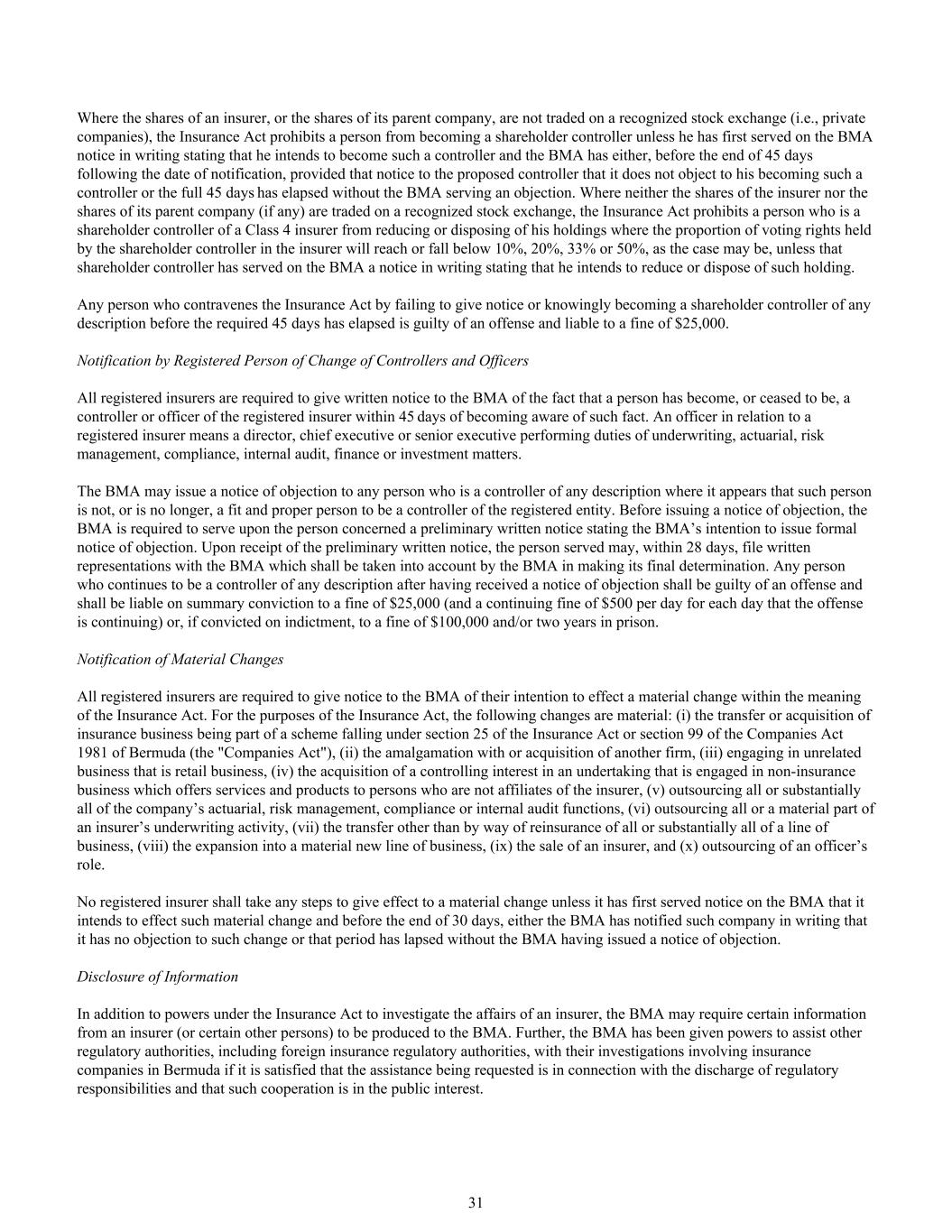 Where the shares of an insurer, or the shares of its parent company, are not traded on a recognized stock exchange (i.e., private companies), the Insurance Act prohibits a person from becoming a shareholder controller unless he has first served on the BMA notice in writing stating that he intends to become such a controller and the BMA has either, before the end of 45 days following the date of notification, provided that notice to the proposed controller that it does not object to his becoming such a controller or the full 45 days has elapsed without the BMA serving an objection. Where neither the shares of the insurer nor the shares of its parent company (if any) are traded on a recognized stock exchange, the Insurance Act prohibits a person who is a shareholder controller of a Class 4 insurer from reducing or disposing of his holdings where the proportion of voting rights held by the shareholder controller in the insurer will reach or fall below 10%, 20%, 33% or 50%, as the case may be, unless that shareholder controller has served on the BMA a notice in writing stating that he intends to reduce or dispose of such holding. Any person who contravenes the Insurance Act by failing to give notice or knowingly becoming a shareholder controller of any description before the required 45 days has elapsed is guilty of an offense and liable to a fine of $25,000. Notification by Registered Person of Change of Controllers and Officers All registered insurers are required to give written notice to the BMA of the fact that a person has become, or ceased to be, a controller or officer of the registered insurer within 45 days of becoming aware of such fact. An officer in relation to a registered insurer means a director, chief executive or senior executive performing duties of underwriting, actuarial, risk management, compliance, internal audit, finance or investment matters. The BMA may issue a notice of objection to any person who is a controller of any description where it appears that such person is not, or is no longer, a fit and proper person to be a controller of the registered entity. Before issuing a notice of objection, the BMA is required to serve upon the person concerned a preliminary written notice stating the BMA’s intention to issue formal notice of objection. Upon receipt of the preliminary written notice, the person served may, within 28 days, file written representations with the BMA which shall be taken into account by the BMA in making its final determination. Any person who continues to be a controller of any description after having received a notice of objection shall be guilty of an offense and shall be liable on summary conviction to a fine of $25,000 (and a continuing fine of $500 per day for each day that the offense is continuing) or, if convicted on indictment, to a fine of $100,000 and/or two years in prison. Notification of Material Changes All registered insurers are required to give notice to the BMA of their intention to effect a material change within the meaning of the Insurance Act. For the purposes of the Insurance Act, the following changes are material: (i) the transfer or acquisition of insurance business being part of a scheme falling under section 25 of the Insurance Act or section 99 of the Companies Act 1981 of Bermuda (the "Companies Act"), (ii) the amalgamation with or acquisition of another firm, (iii) engaging in unrelated business that is retail business, (iv) the acquisition of a controlling interest in an undertaking that is engaged in non-insurance business which offers services and products to persons who are not affiliates of the insurer, (v) outsourcing all or substantially all of the company’s actuarial, risk management, compliance or internal audit functions, (vi) outsourcing all or a material part of an insurer’s underwriting activity, (vii) the transfer other than by way of reinsurance of all or substantially all of a line of business, (viii) the expansion into a material new line of business, (ix) the sale of an insurer, and (x) outsourcing of an officer’s role. No registered insurer shall take any steps to give effect to a material change unless it has first served notice on the BMA that it intends to effect such material change and before the end of 30 days, either the BMA has notified such company in writing that it has no objection to such change or that period has lapsed without the BMA having issued a notice of objection. Disclosure of Information In addition to powers under the Insurance Act to investigate the affairs of an insurer, the BMA may require certain information from an insurer (or certain other persons) to be produced to the BMA. Further, the BMA has been given powers to assist other regulatory authorities, including foreign insurance regulatory authorities, with their investigations involving insurance companies in Bermuda if it is satisfied that the assistance being requested is in connection with the discharge of regulatory responsibilities and that such cooperation is in the public interest. 31